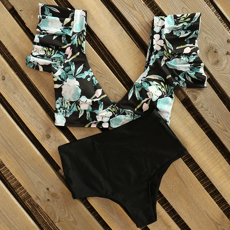 Floral Ruffled Hem Bikini Set Women Flora V-neck High-waisted Two Piece Swimsuit 2020 Girl Beach Bathing Suit Swimwear Biquinis