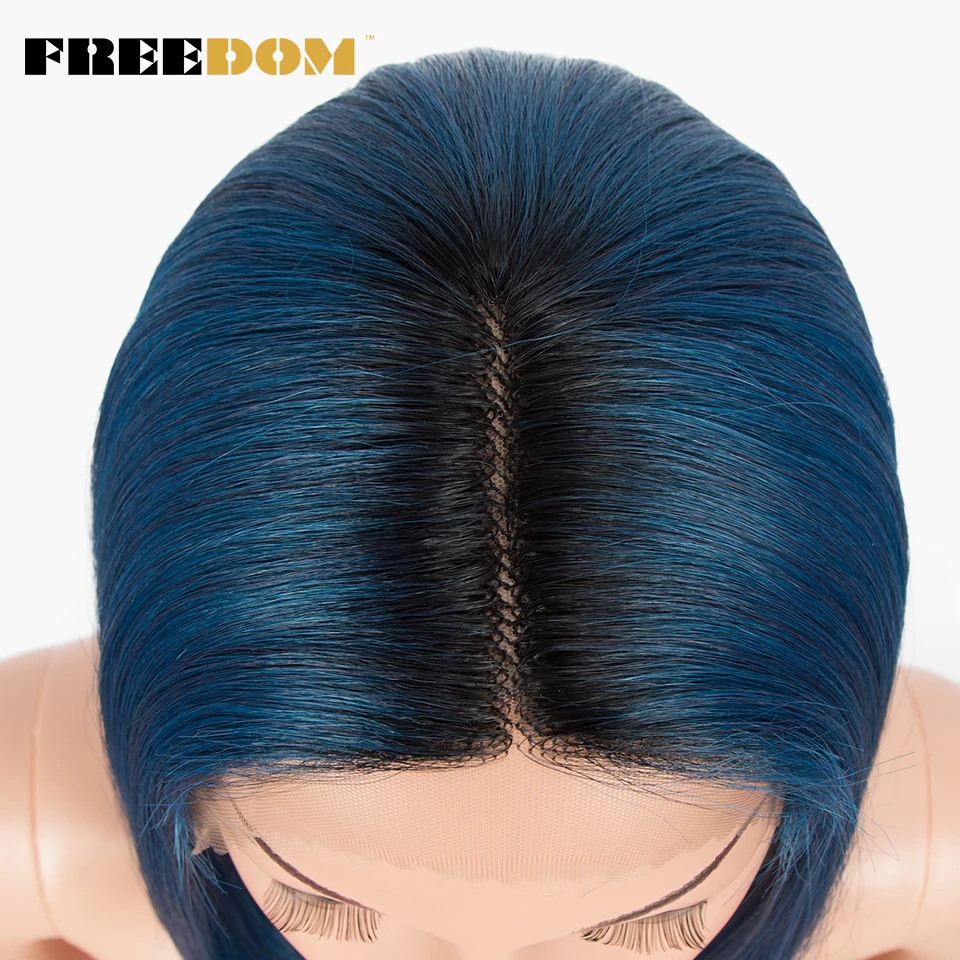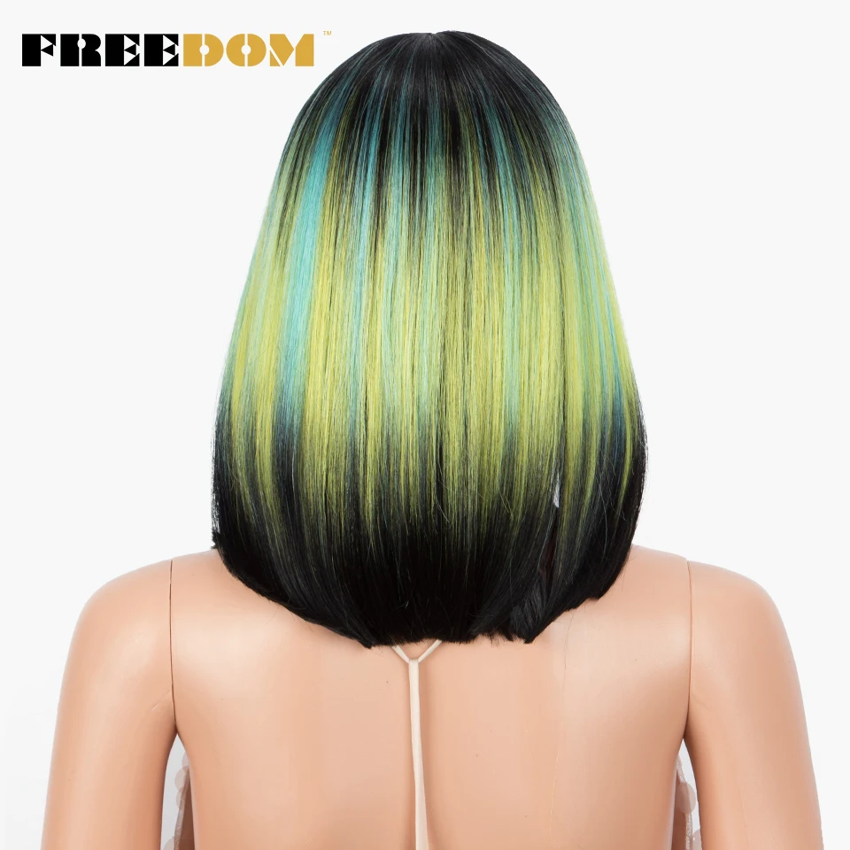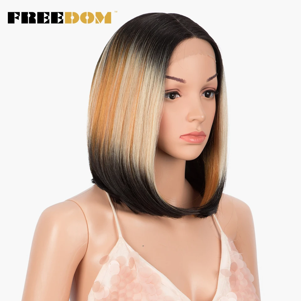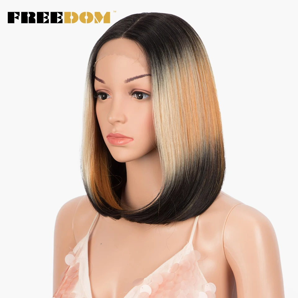 FREEDOM Short Bob Synthetic Lace Wig Straight Ombre Blue Pink Ginger Blonde Lace Wigs For Black Women Middle Part Cosplay Wig
