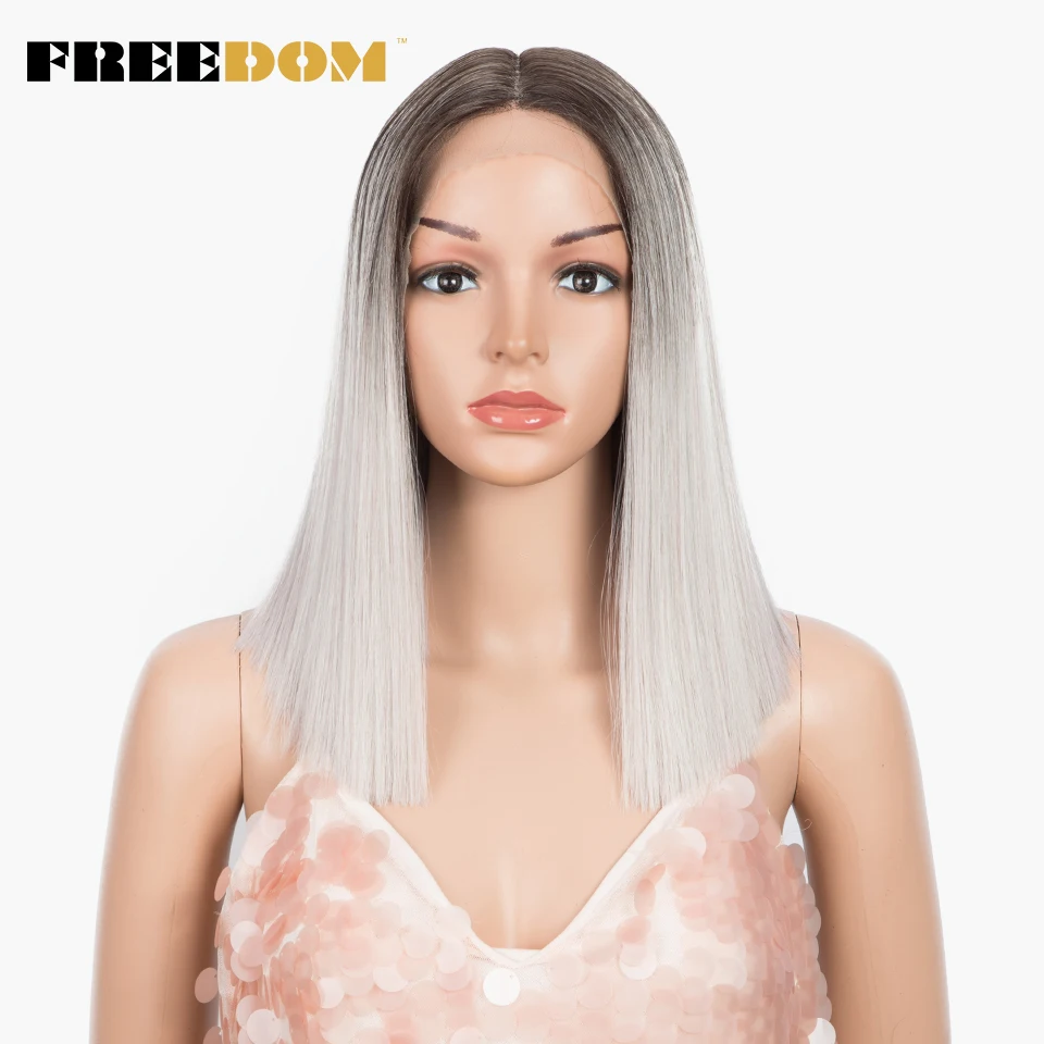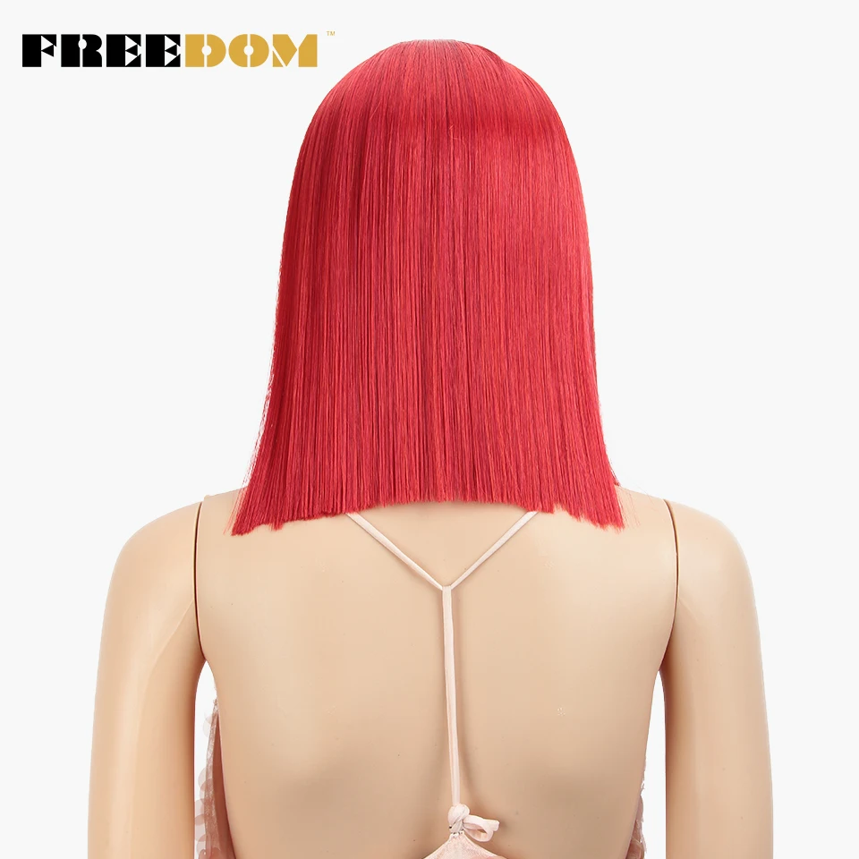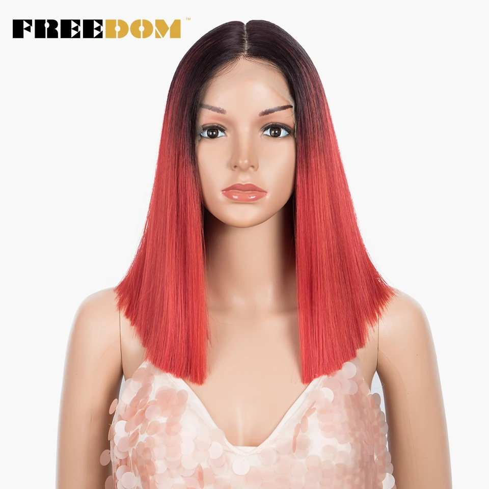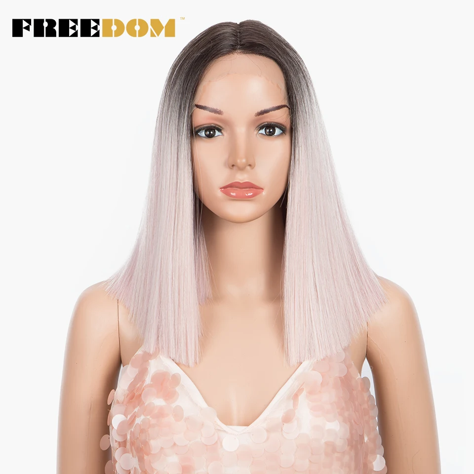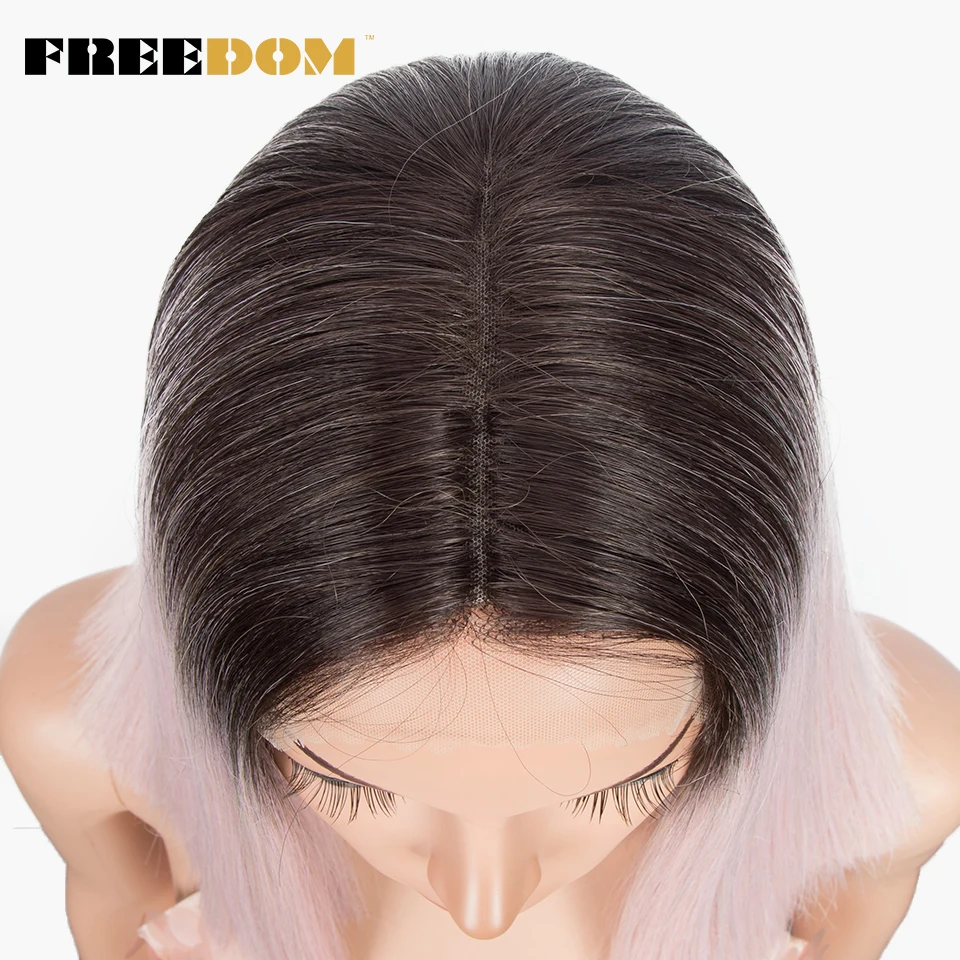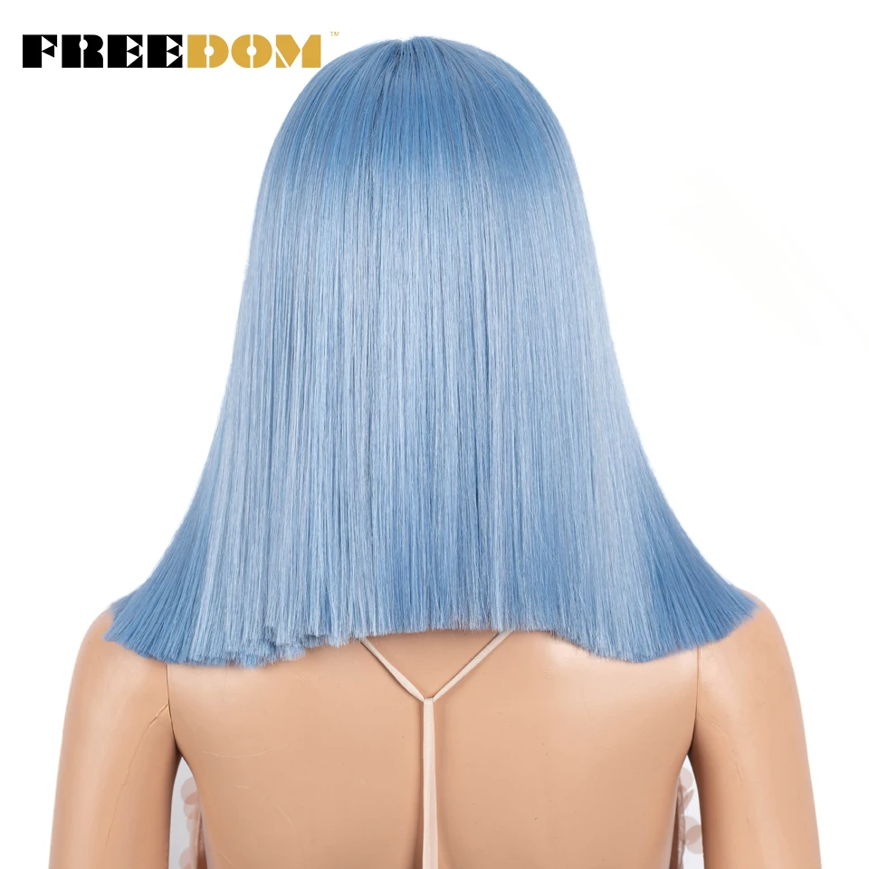FREEDOM Synthetic Lace Wig Short Bob Straight 14 Inch Middle Part Wigs Blue Pink White Ombre Color Cosplay Wigs For Black Women