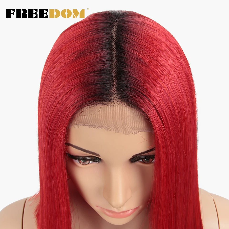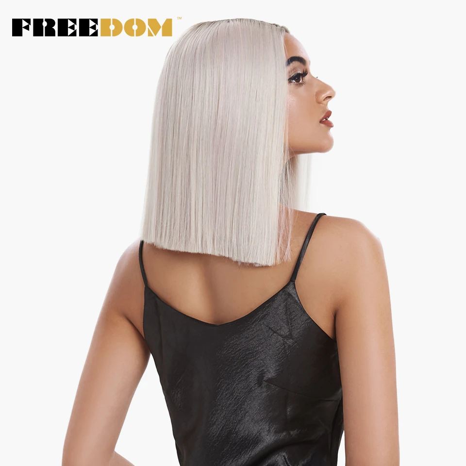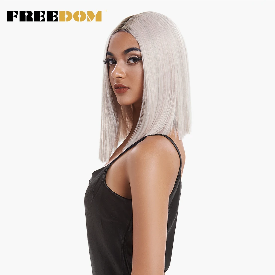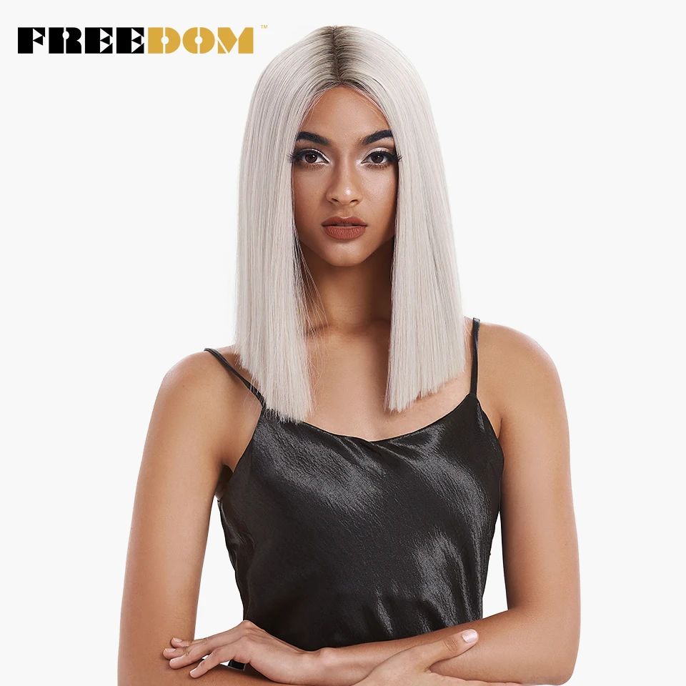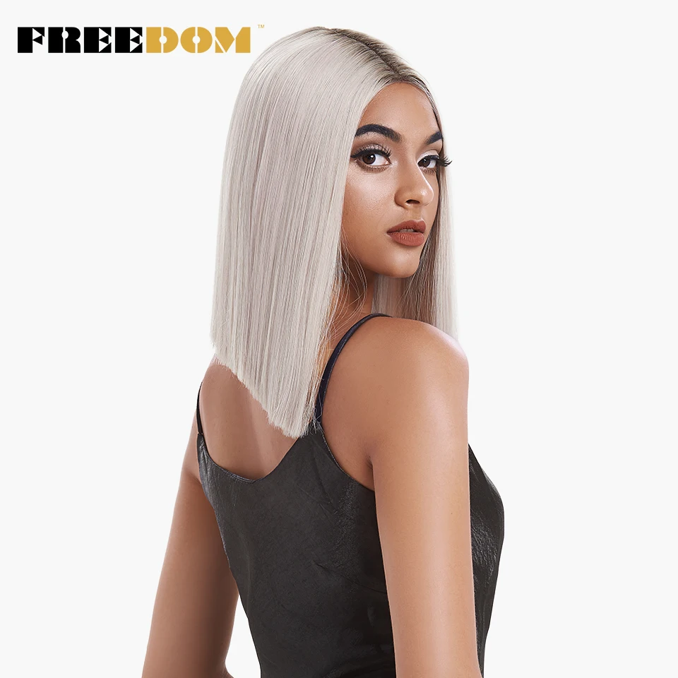 FREEDOM Synthetic Lace Wig Short Bob Straight 14 Inch Middle Part Wigs Blue Pink White Ombre Color Cosplay Wigs For Black Women