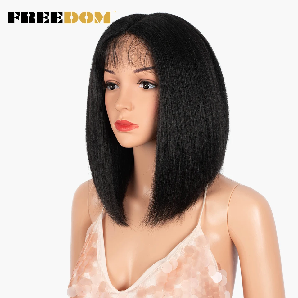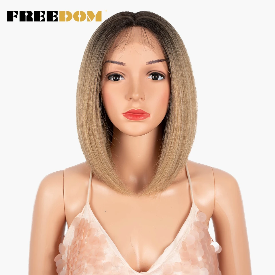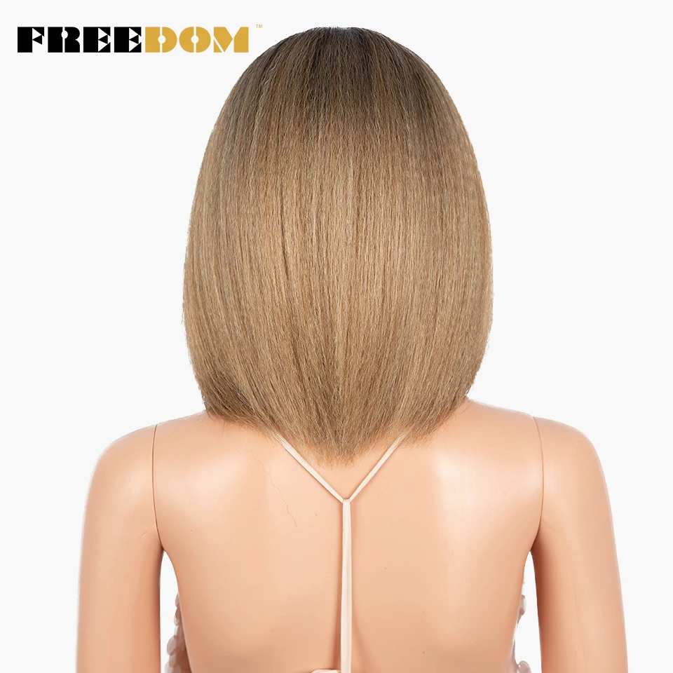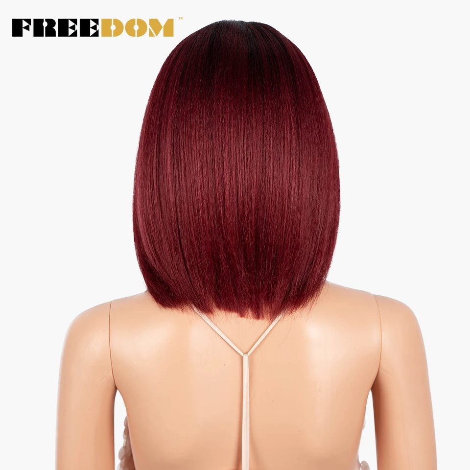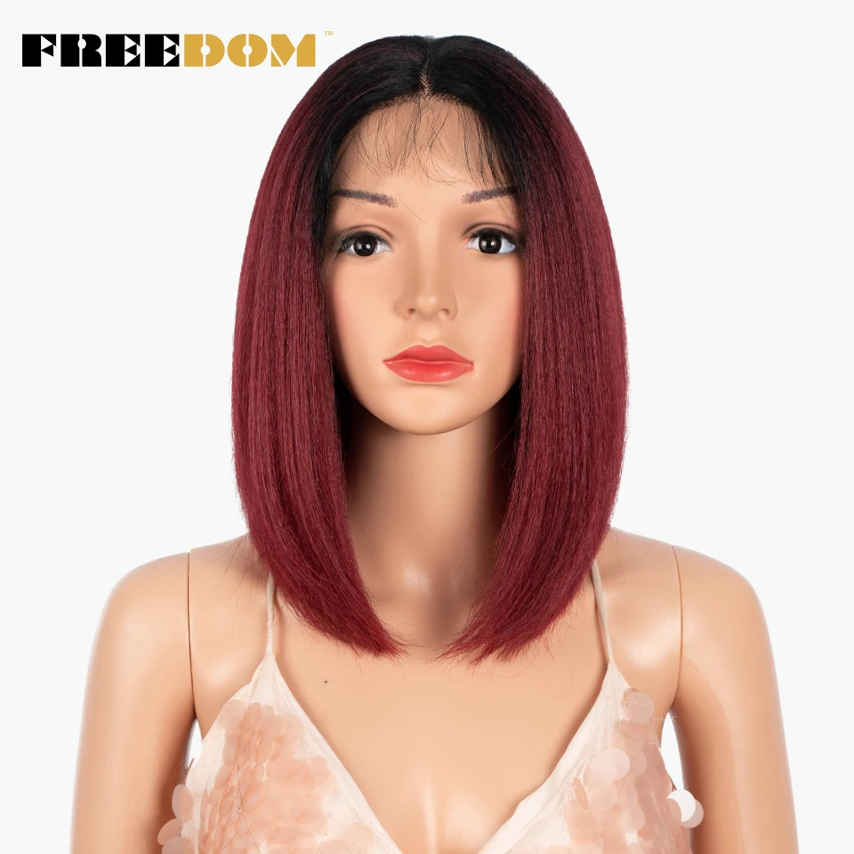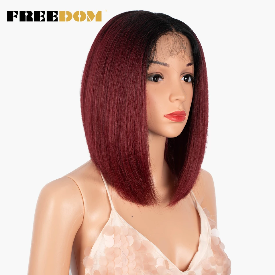 FREEDOM Synthetic Lace Wig Yaki Straight Short Bob Wigs Ombre Brown Red Middle Part Lace Wigs Cosplay Wigs For Black Women