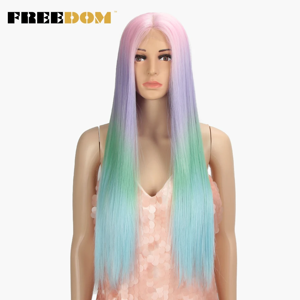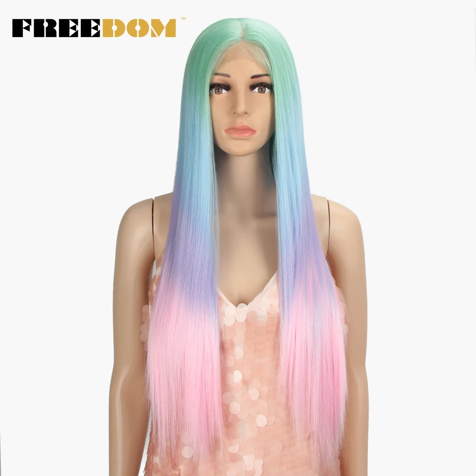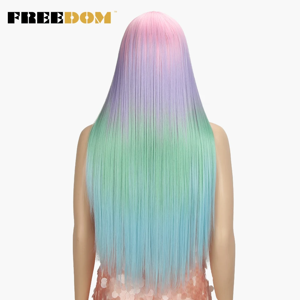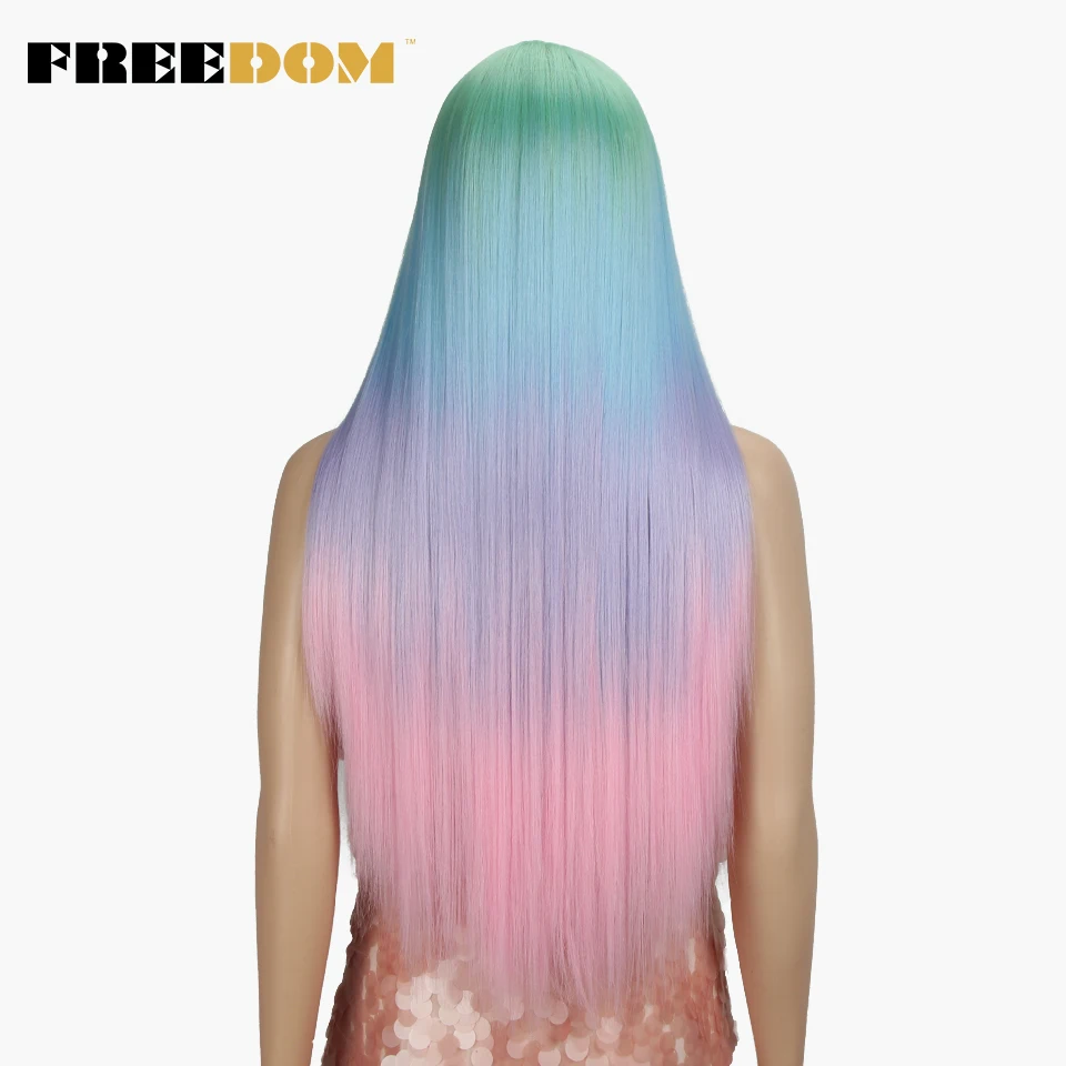 FREEDOM Synthetic Lace Wigs Omber Green Rainbow Color Long Straight Wigs For Black Women 30inch Heat Resistant Cosplay Wig