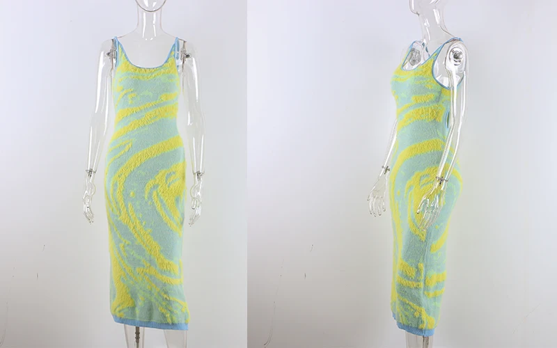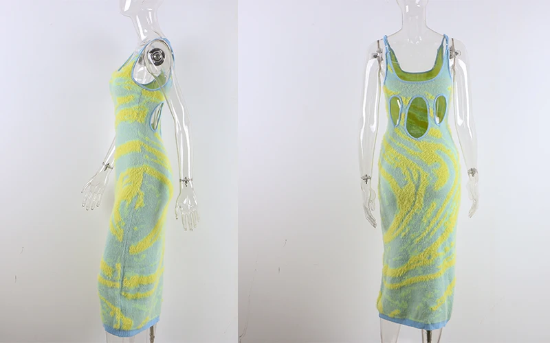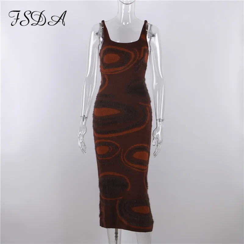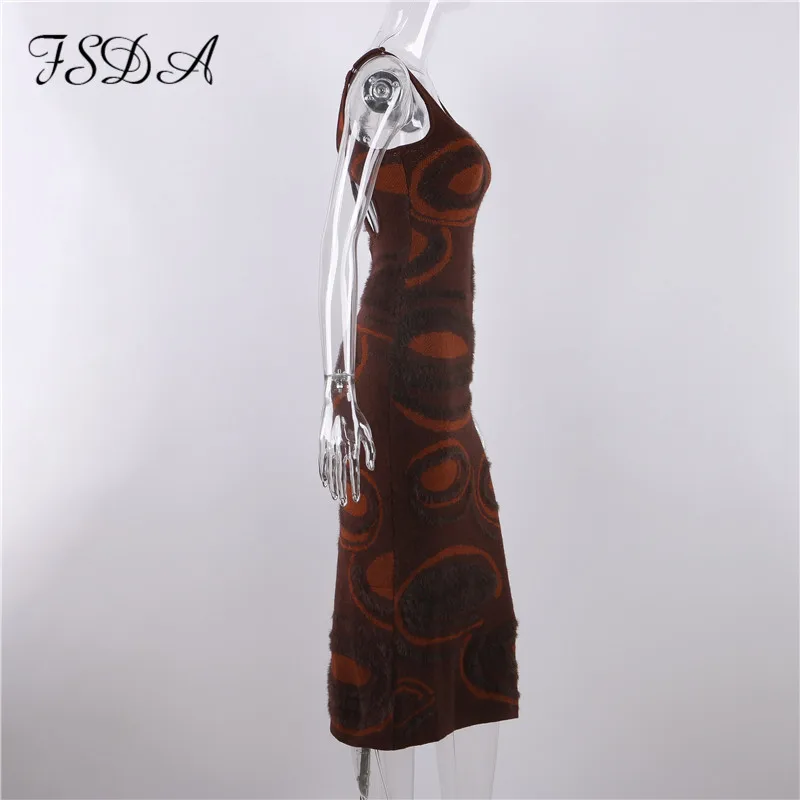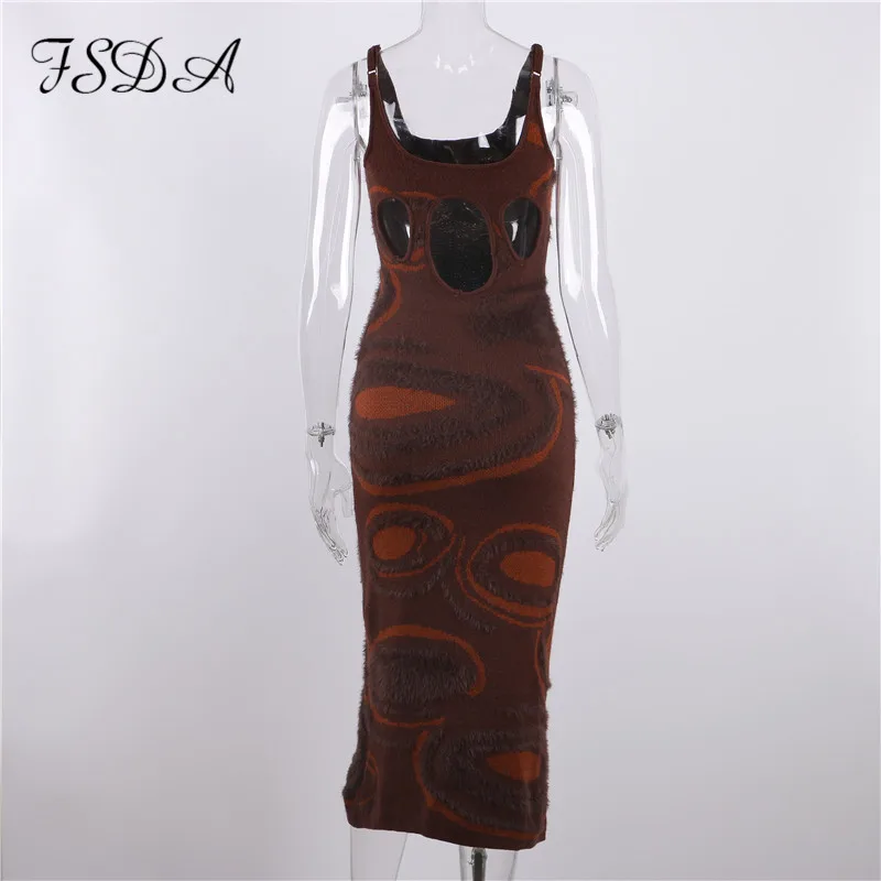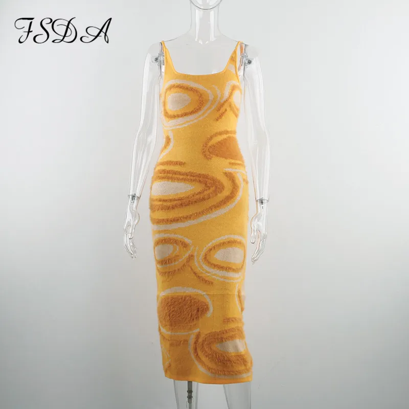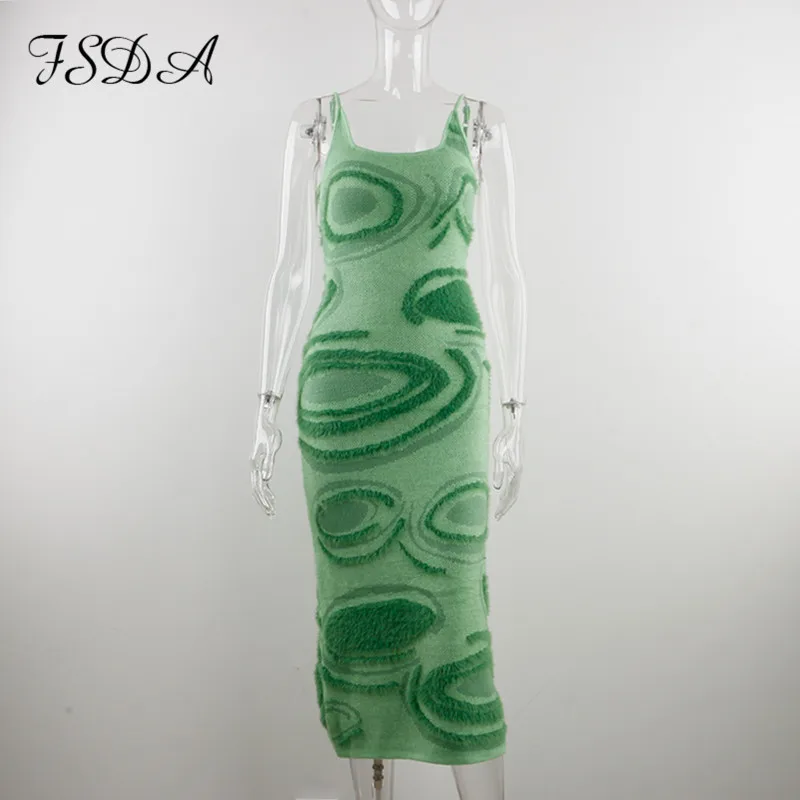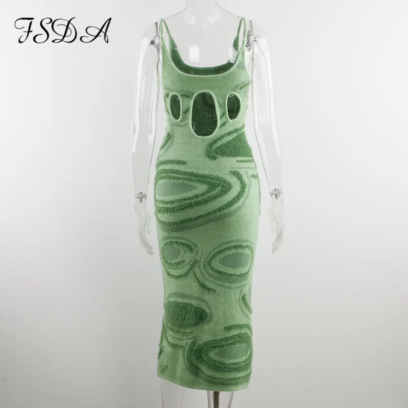 FSDA 2021 Print Knit Bodycon Dress Women Green Summer Hollow Out Sexy Sleeveless Spaghetti Strap Beach Midi Dresses Party