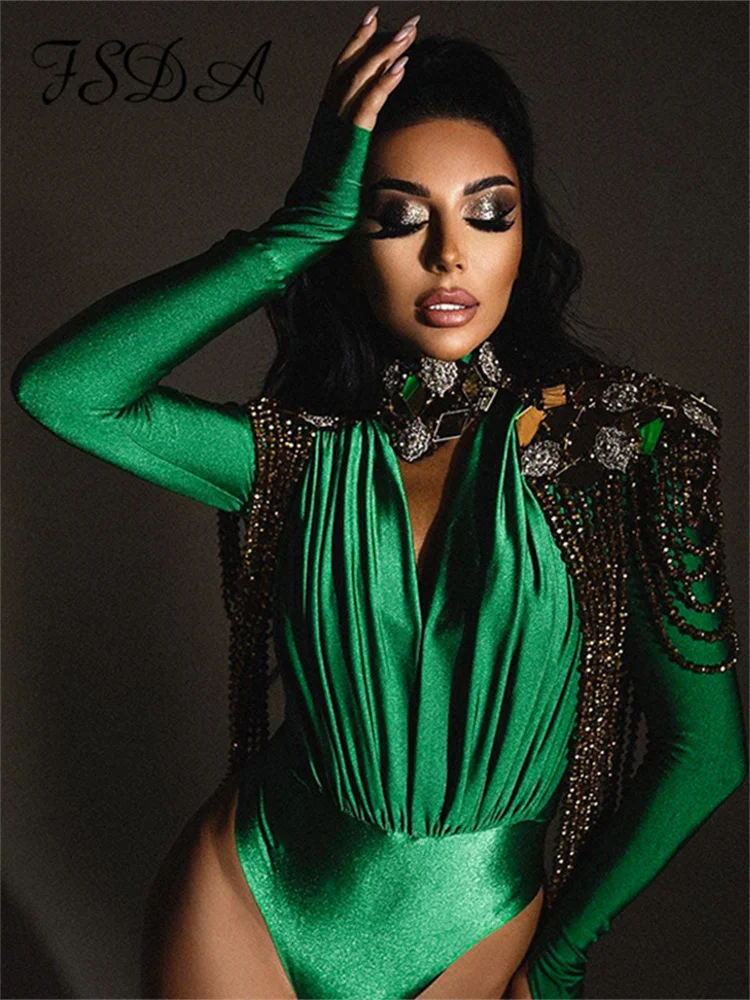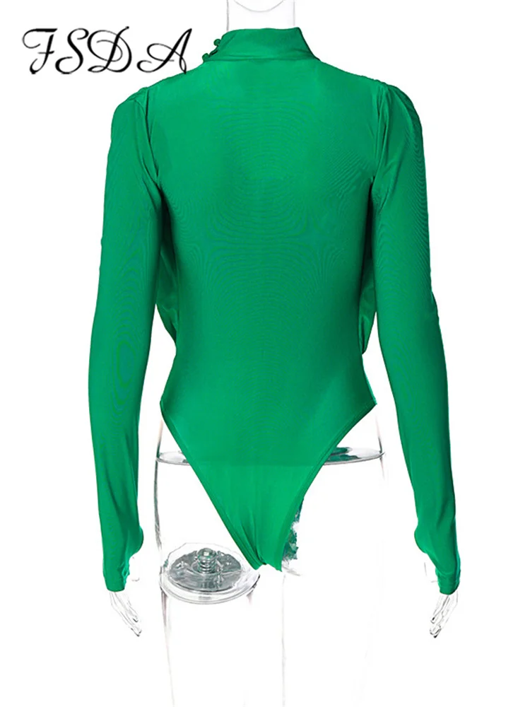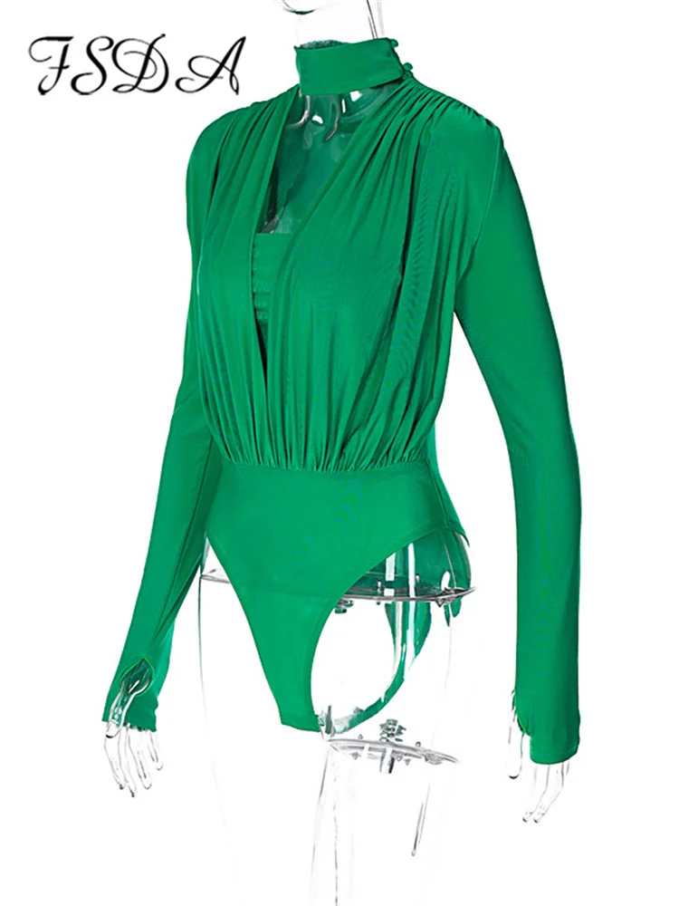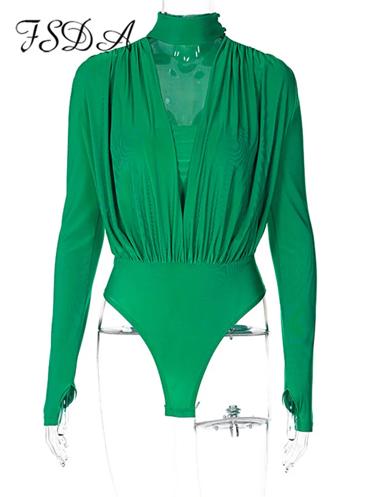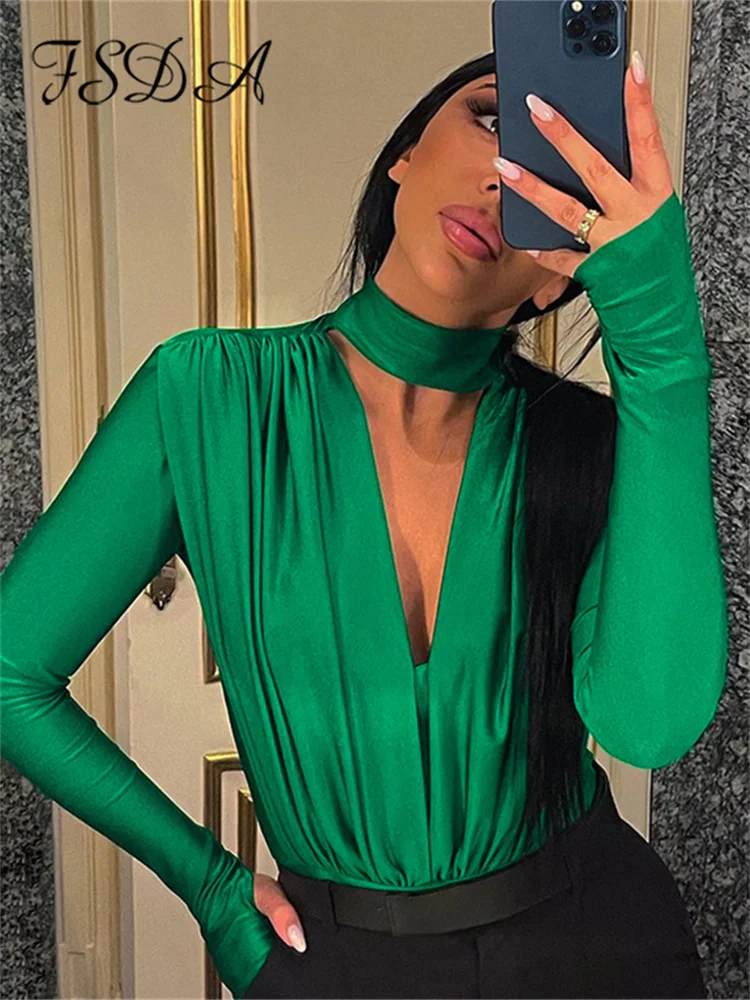 FSDA Deep V Neck Long Sleeve Ruched Bodysuit Women Autumn Winter Halter Skinny Sexy Party Club Top Green Outfits 2022