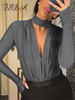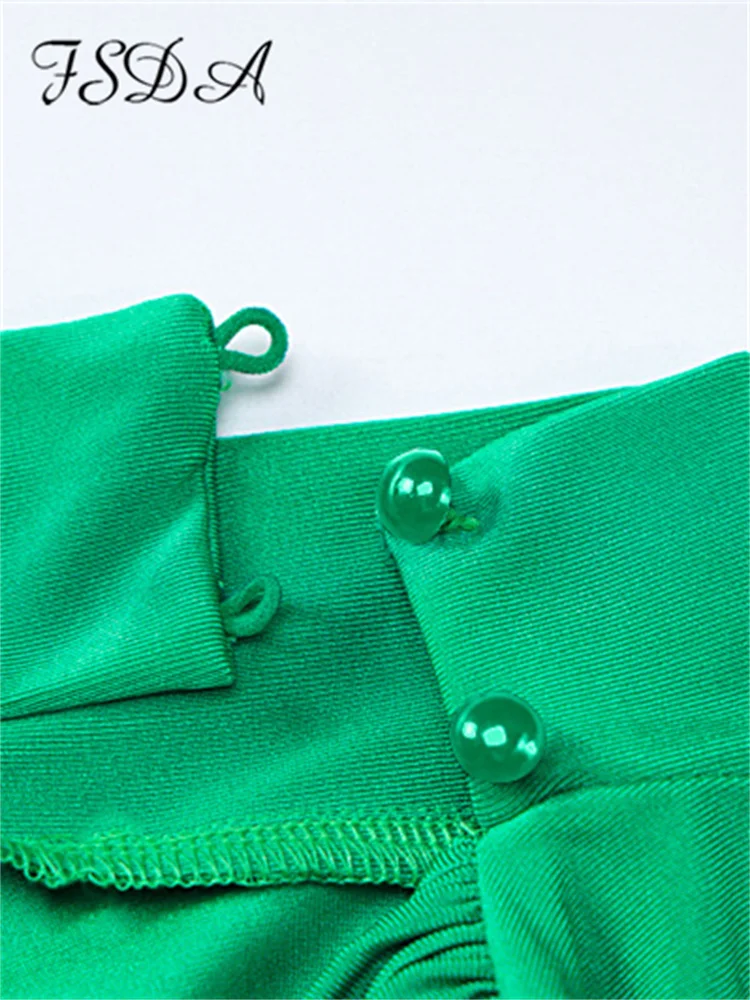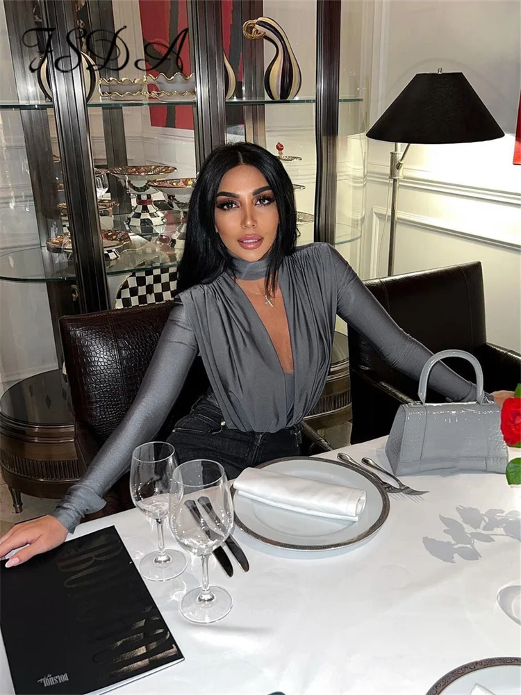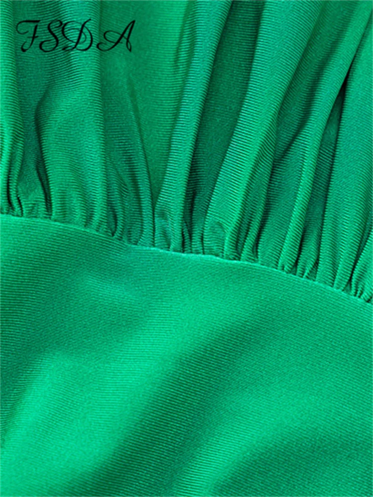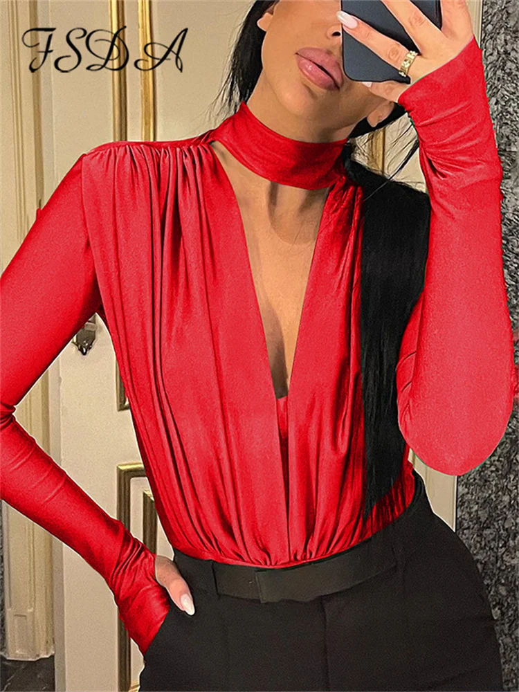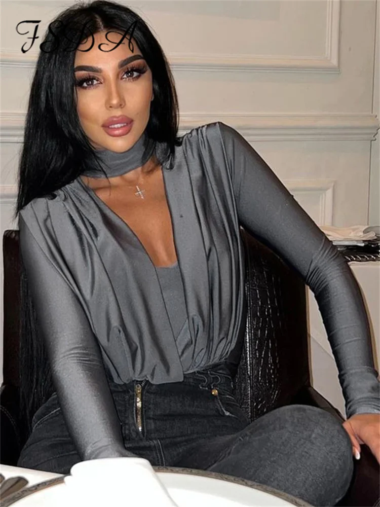 FSDA Deep V Neck Long Sleeve Ruched Bodysuit Women Autumn Winter Halter Skinny Sexy Party Club Top Green Outfits 2022