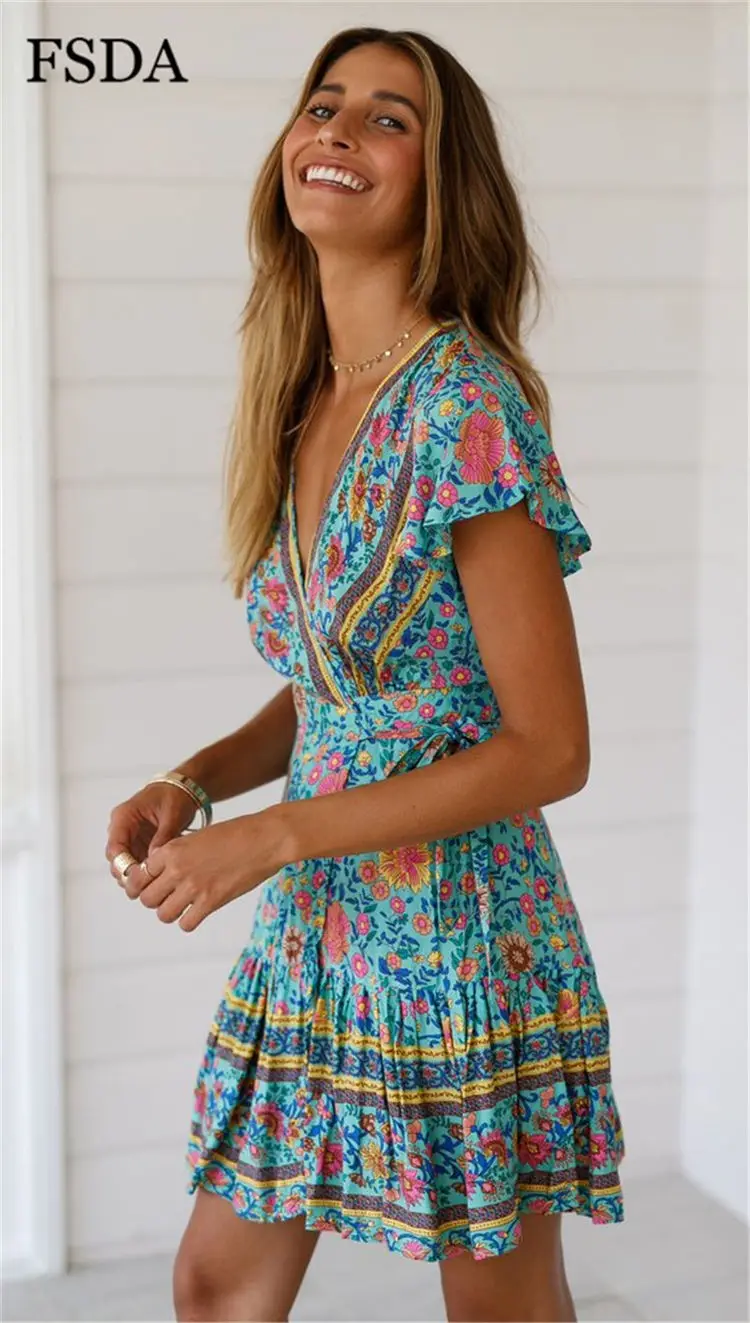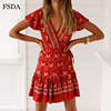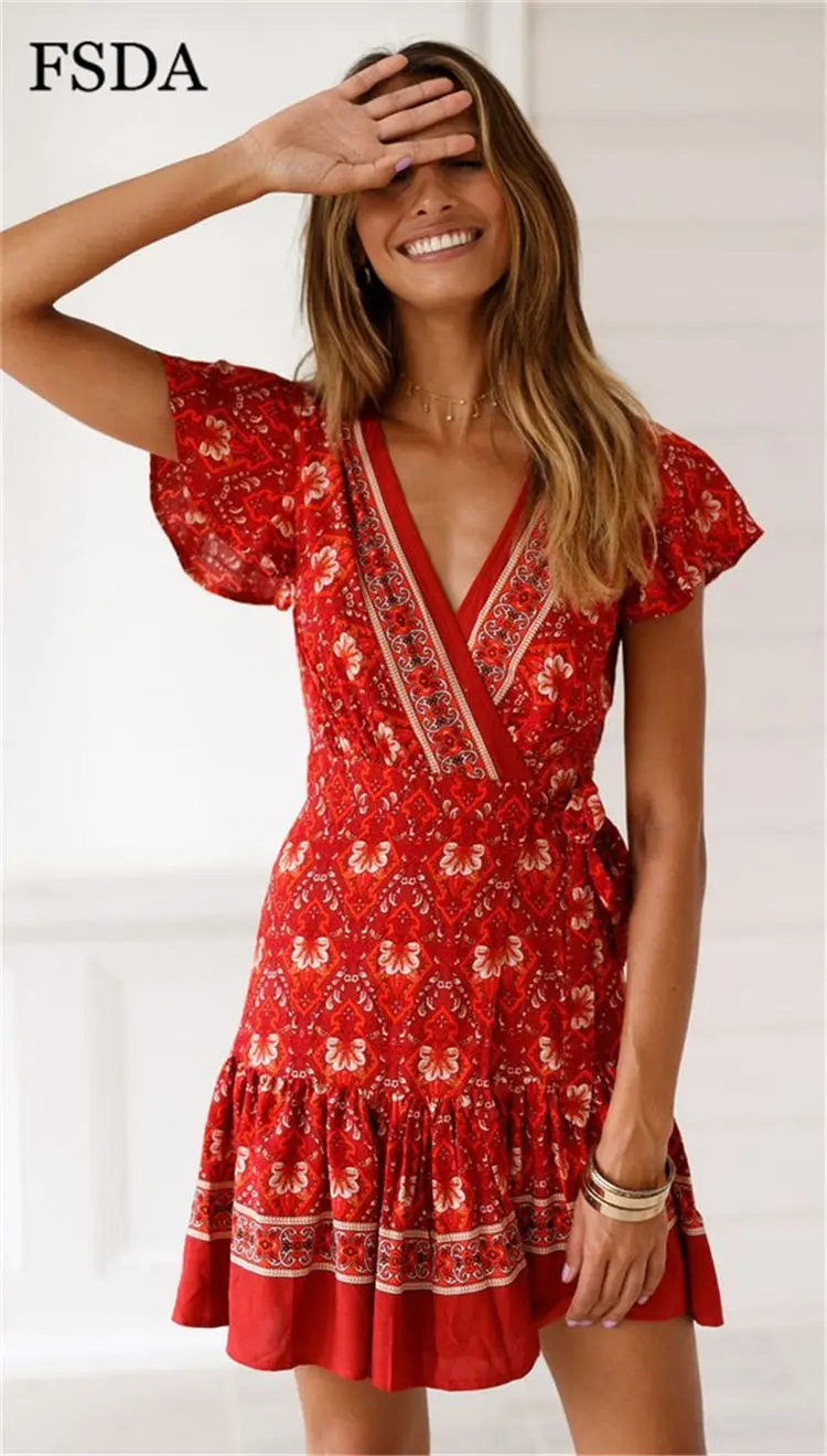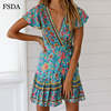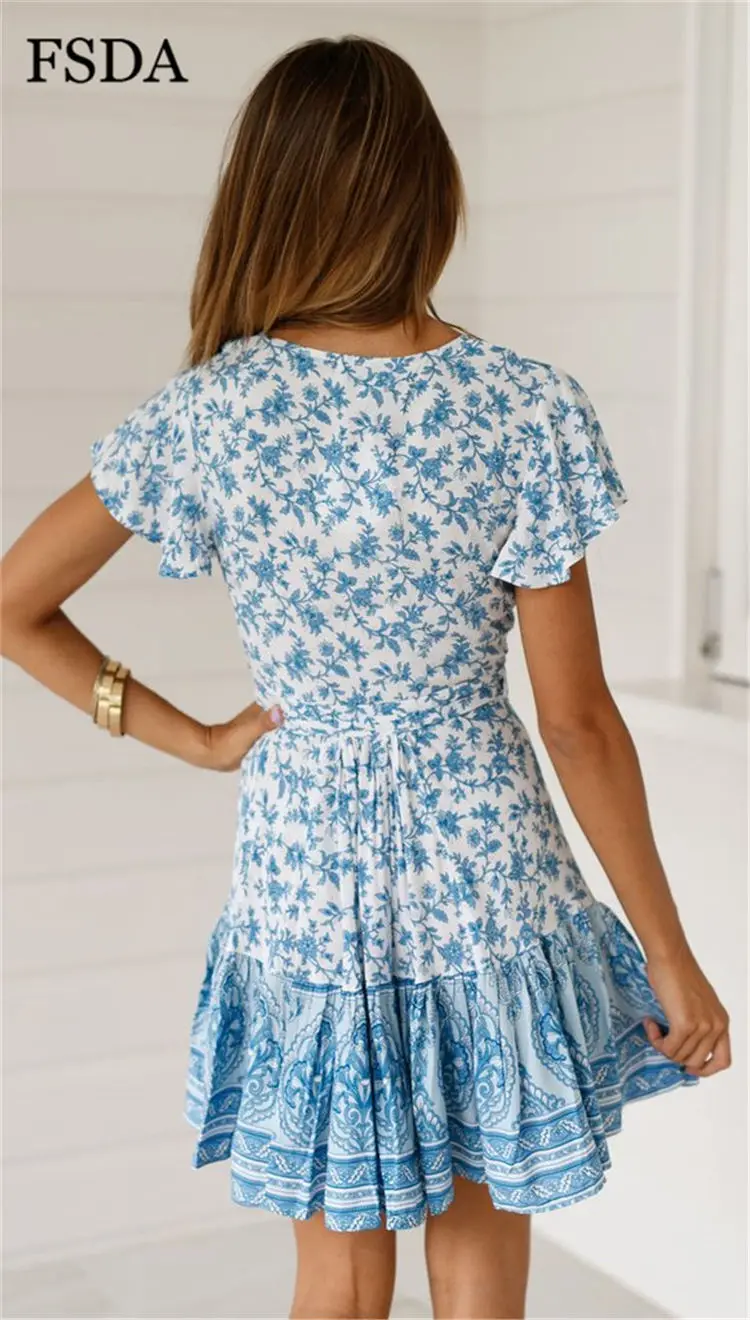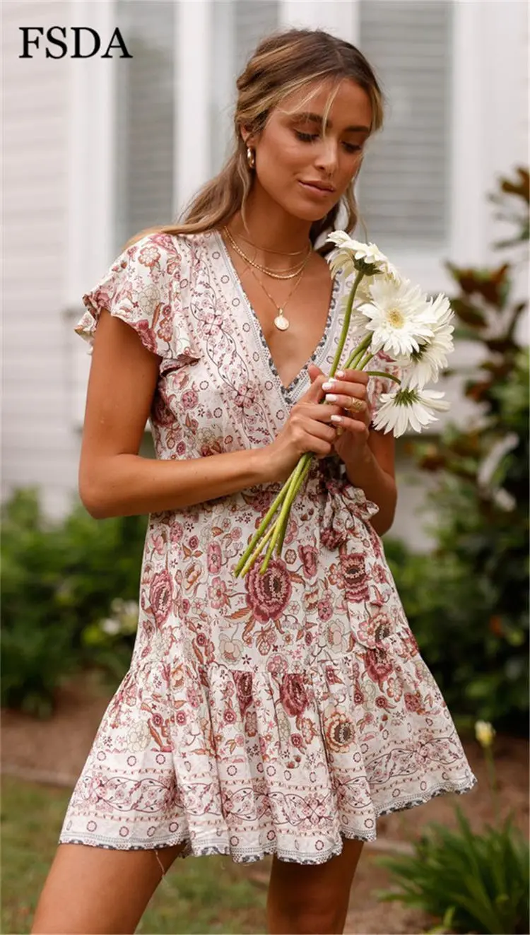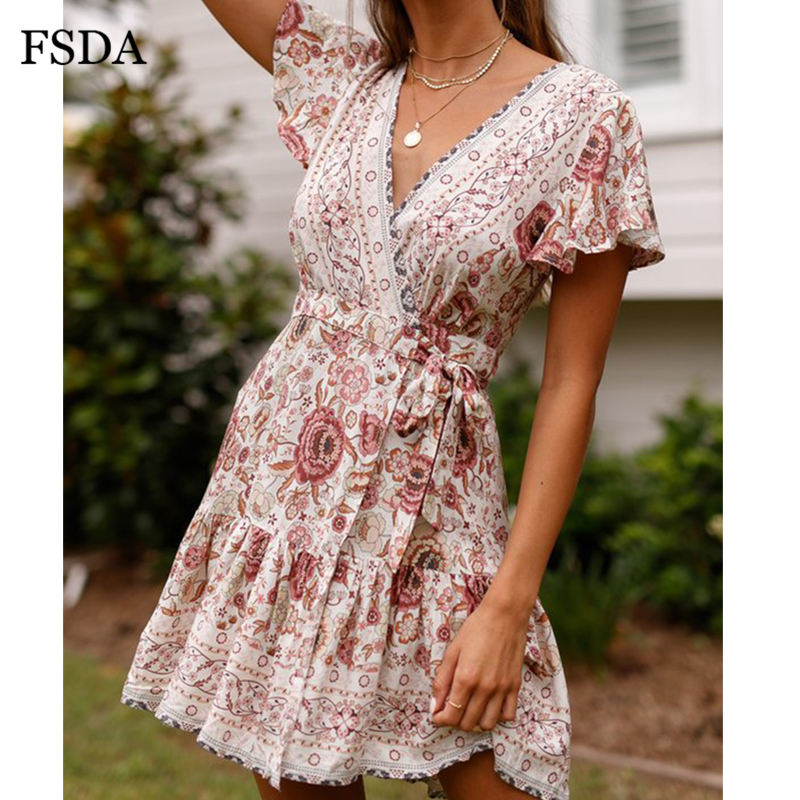 FSDA Floral Print Mini Dress Ruffles V Neck Sashes Bohemian Ruched Women Summer Beach Dresses