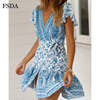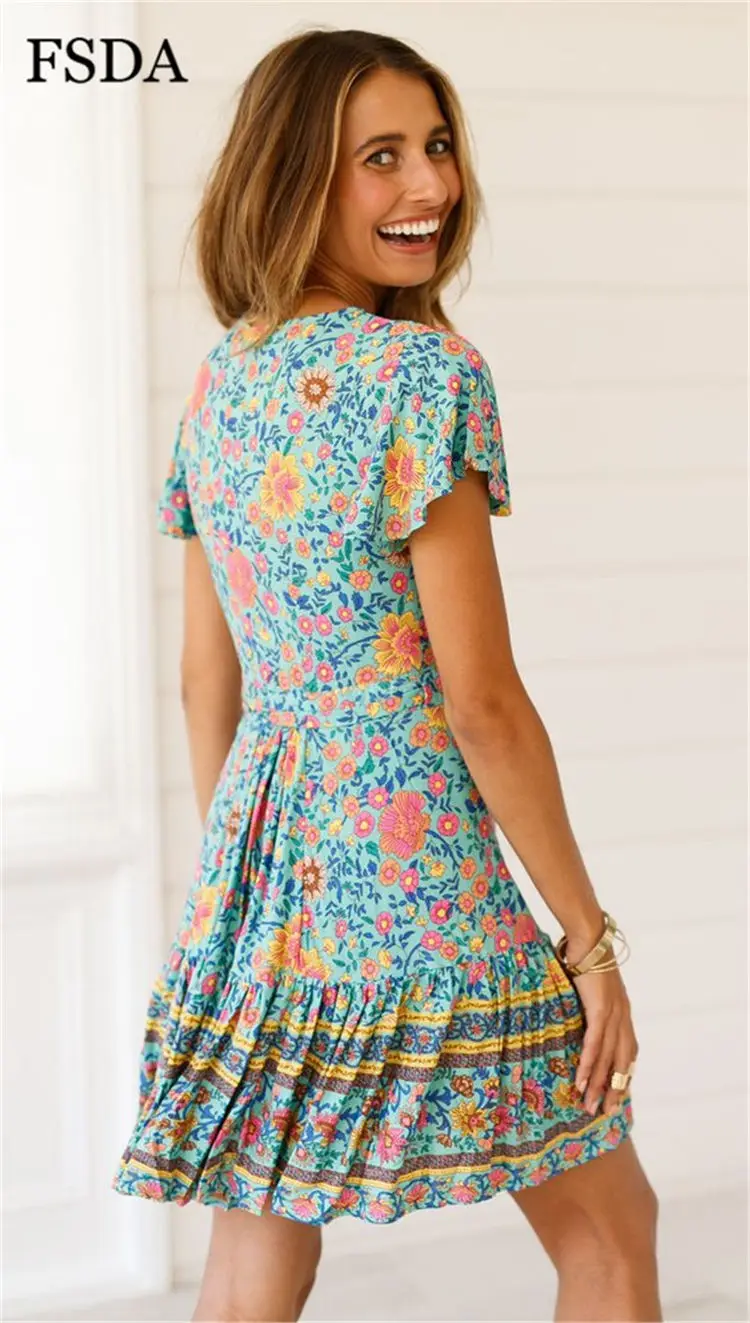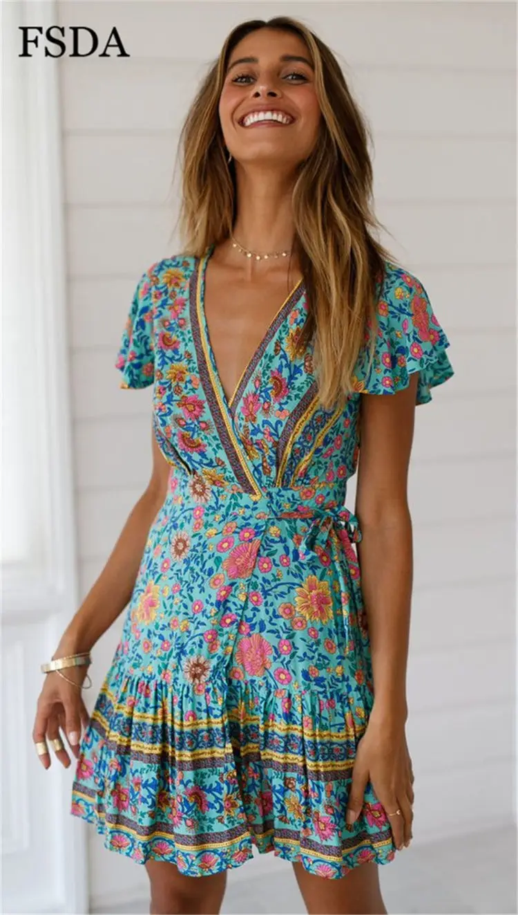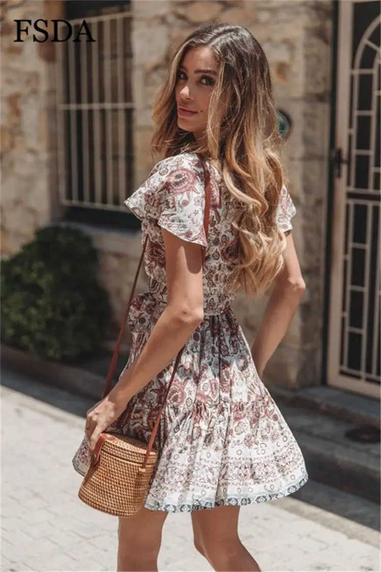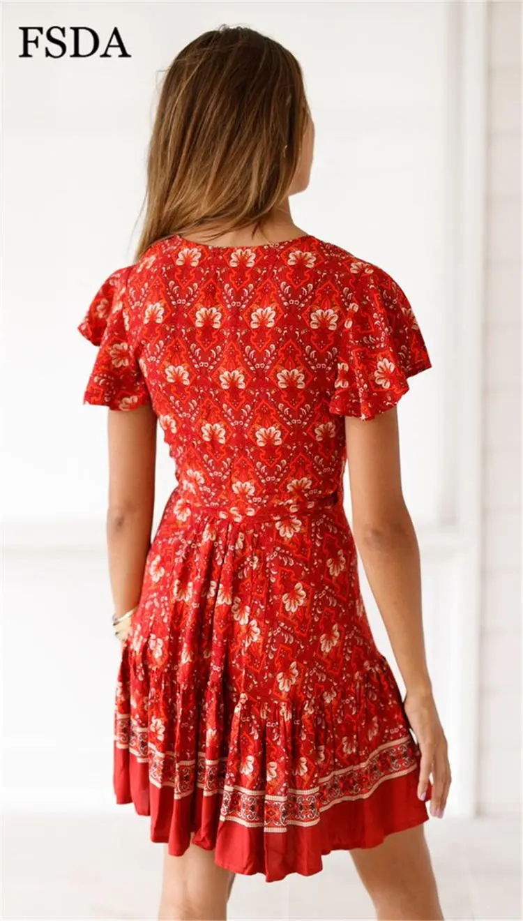 FSDA Floral Print Mini Dress Ruffles V Neck Sashes Bohemian Ruched Women Summer Beach Dresses