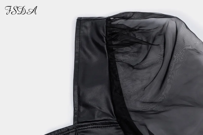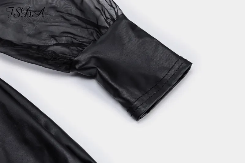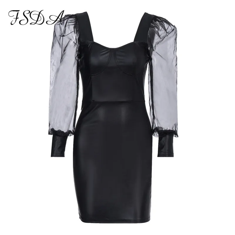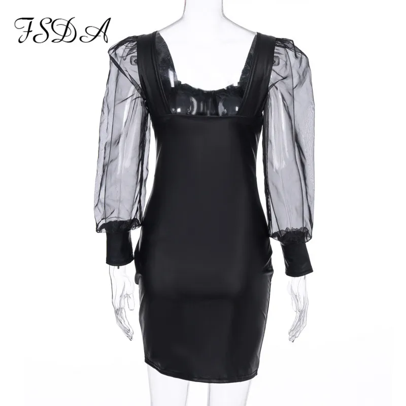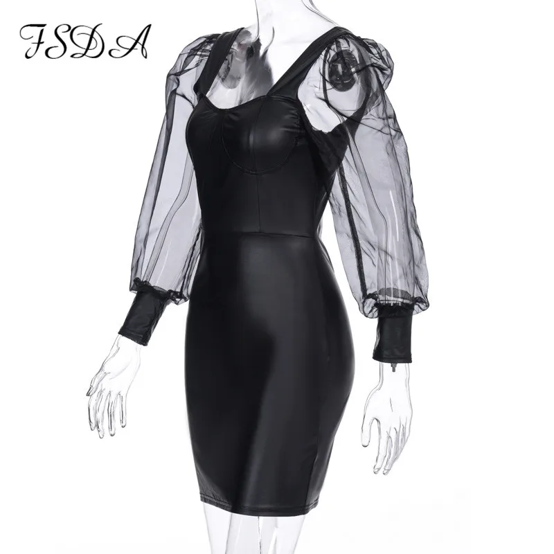 FSDA Long Puff Sleeve Mesh Patchwork Pu Leather Dress Bodycon Mini Square Neck Backless Sexy Black Dresses Party