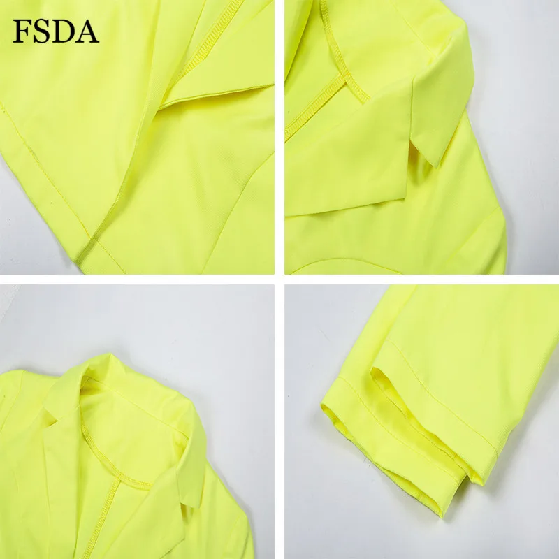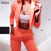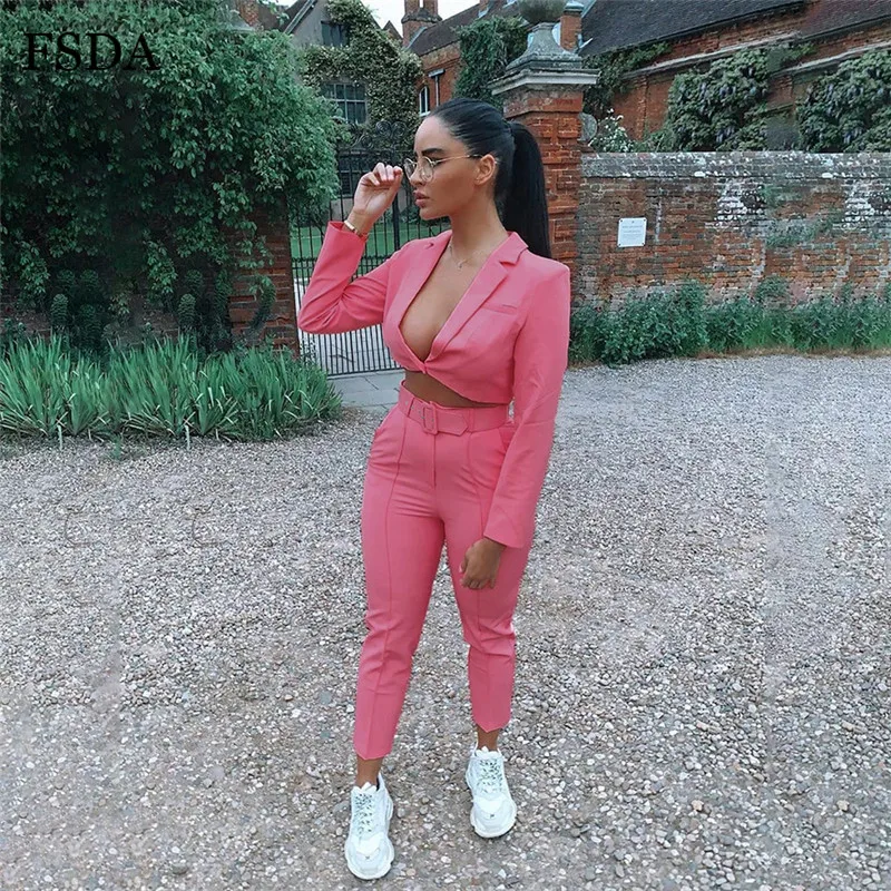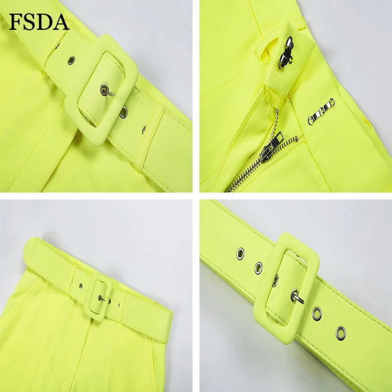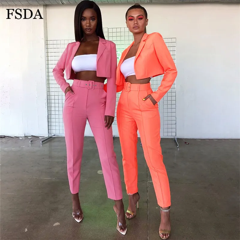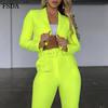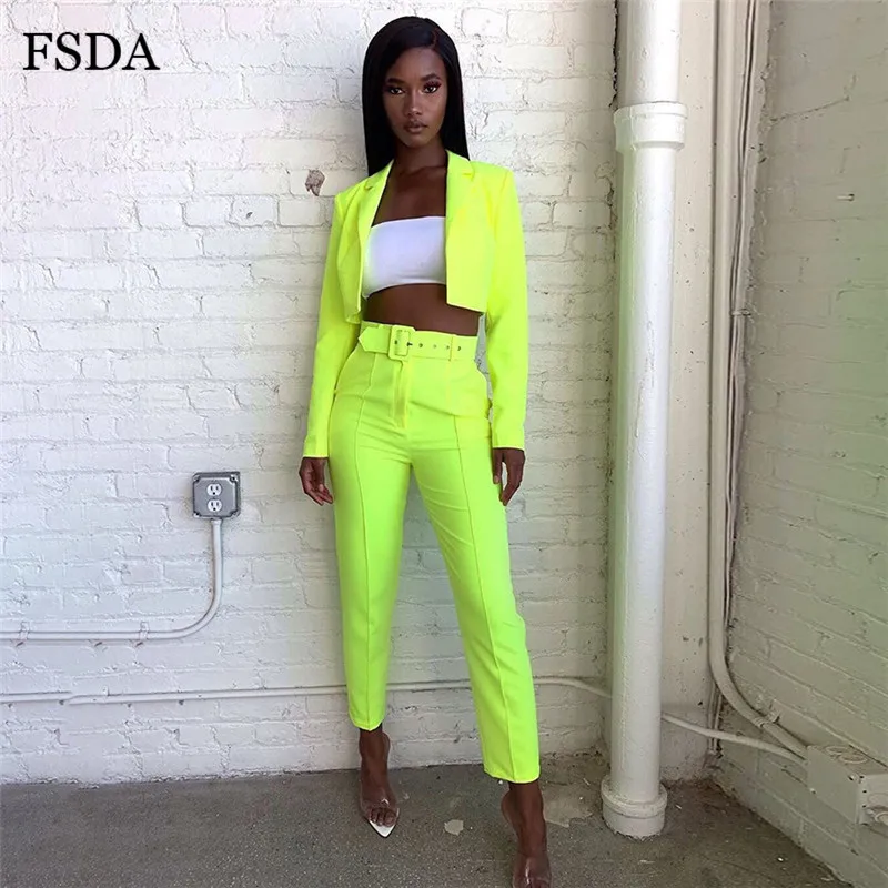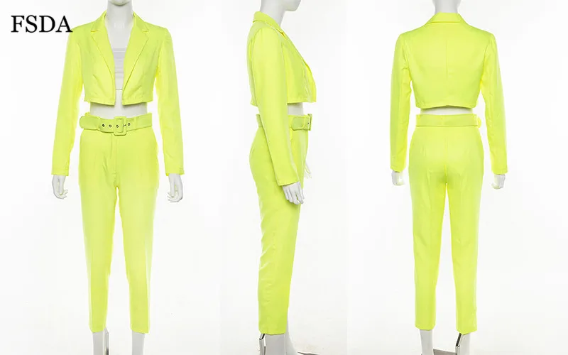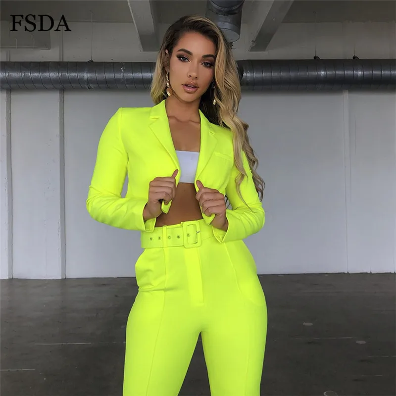 FSDA Neon Suit Set Terno Women Two Piece Set Office V Neck Blazer And Long Pant With Sashes Elegant Long Sleeve Top Spring