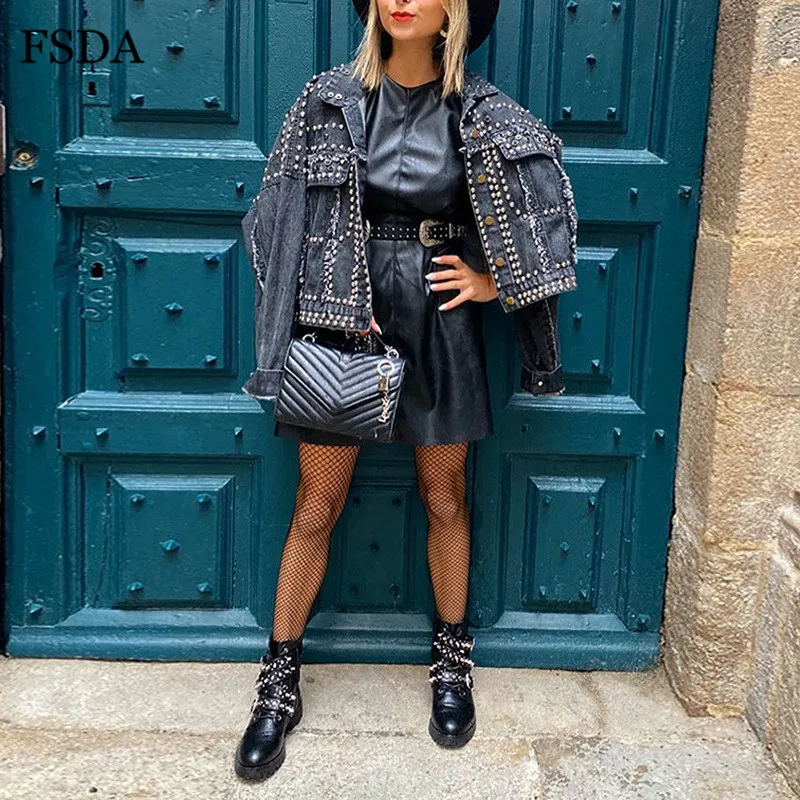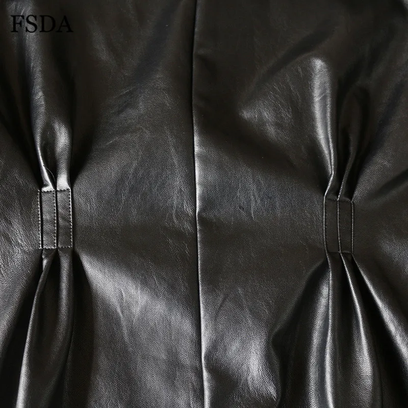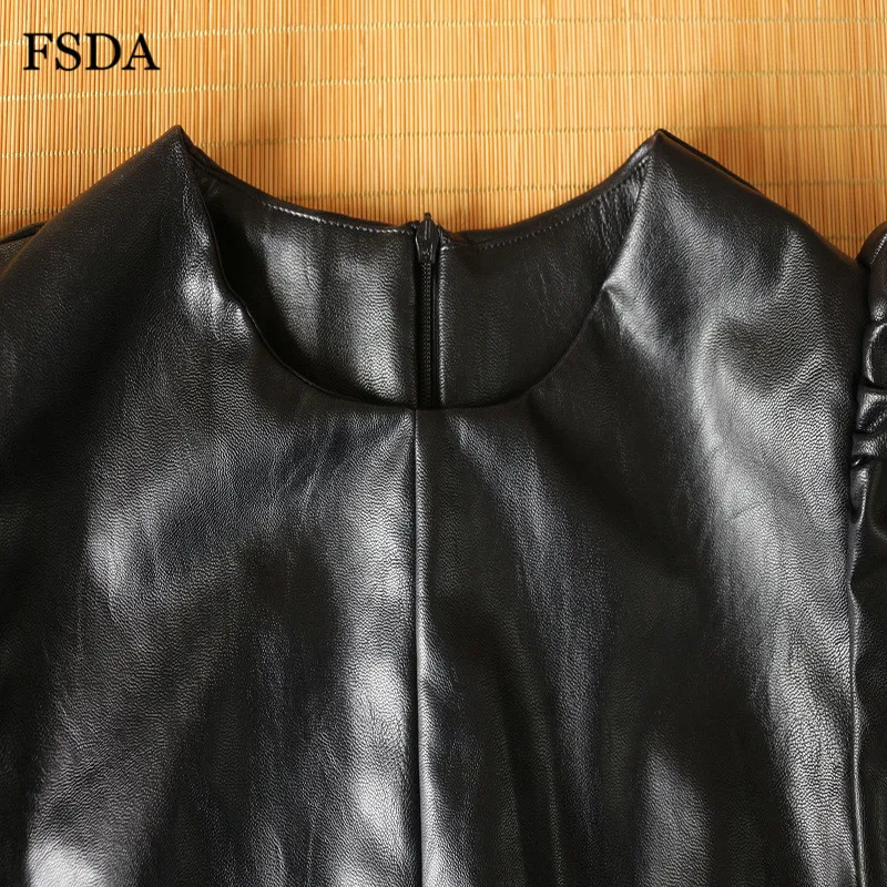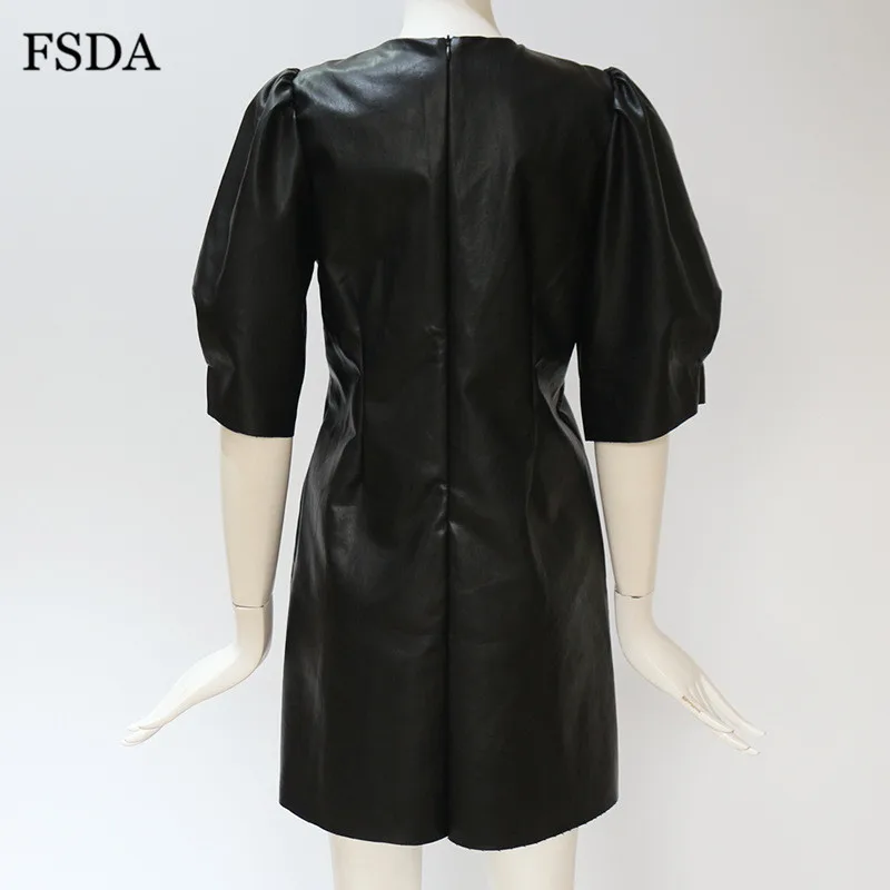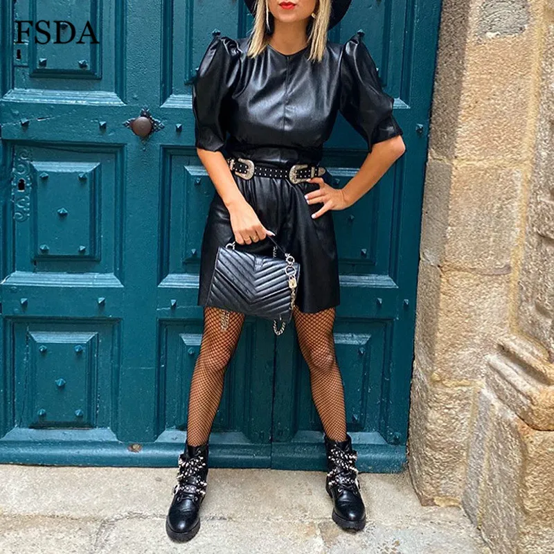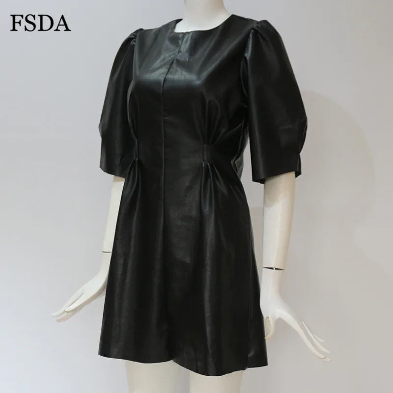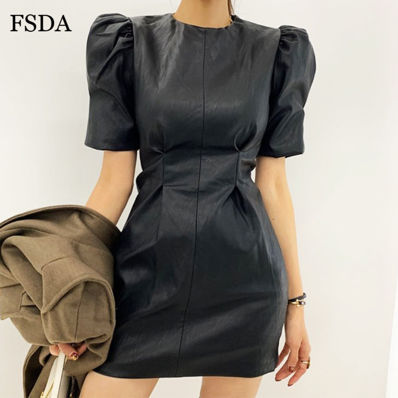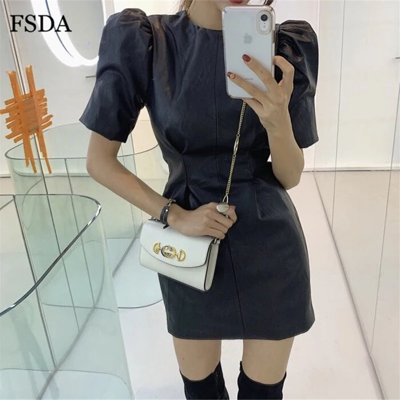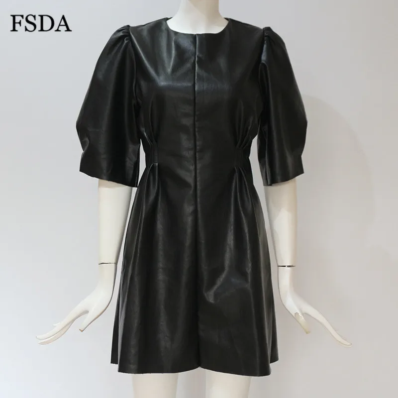 FSDA O Neck Black Short Puff Sleeve Leather Dress Summer Mini A Line High Waist Elegant Casual Women PU Clubwear Party Dresses