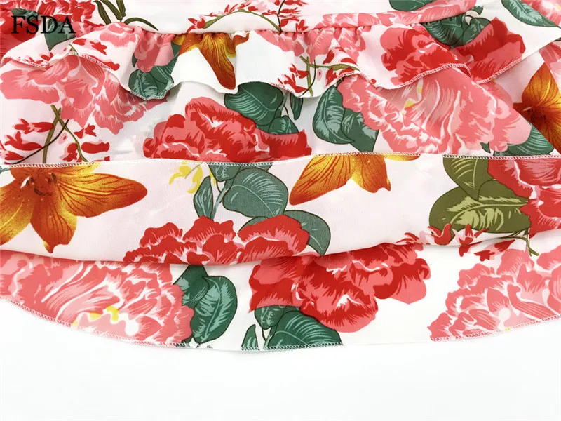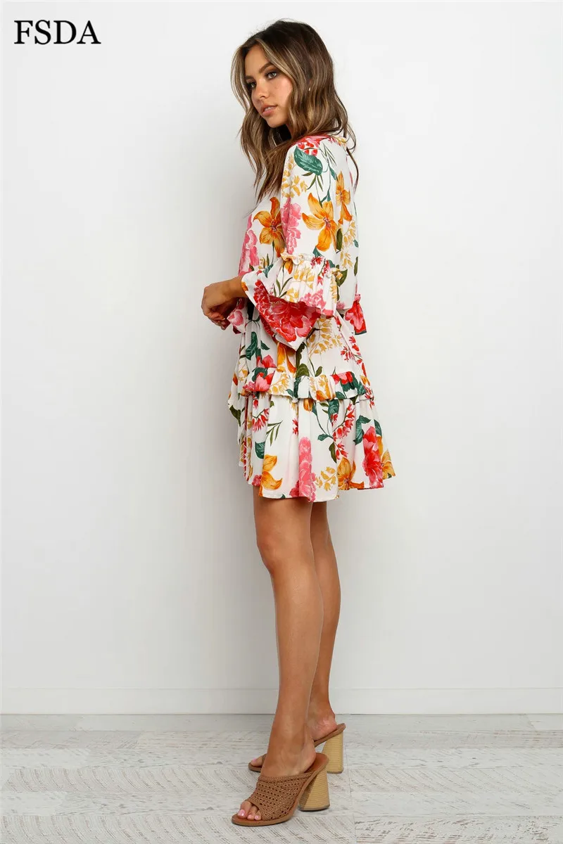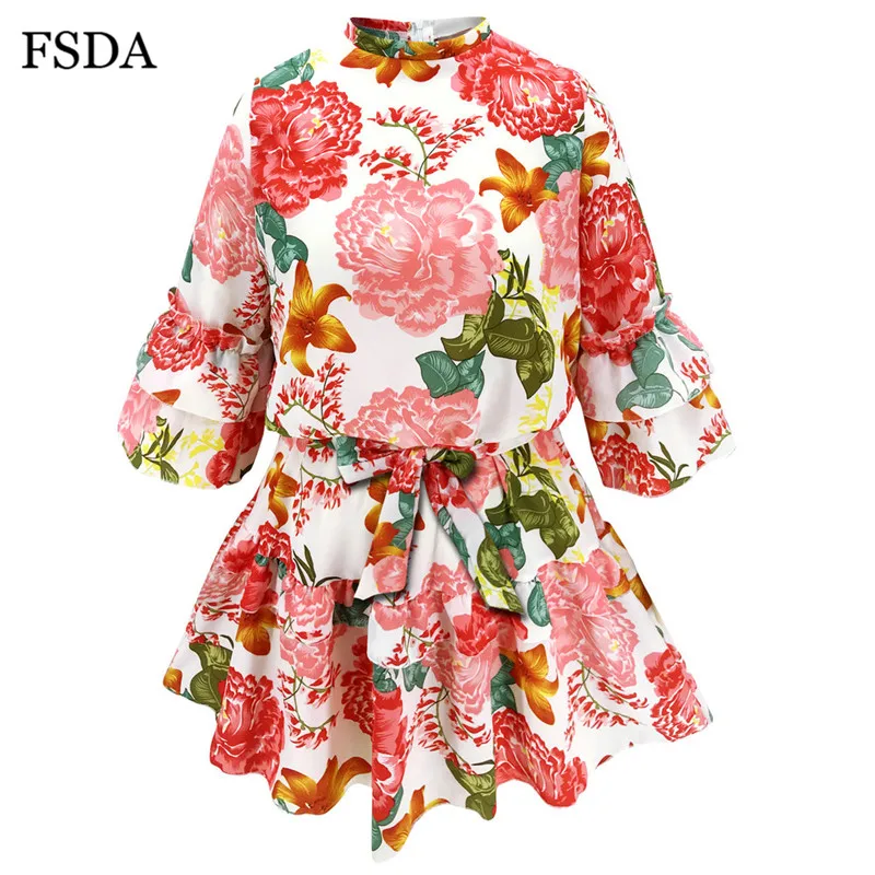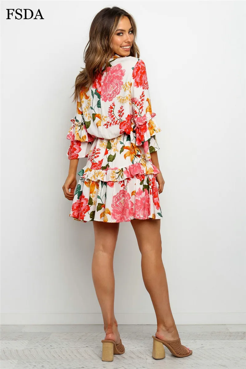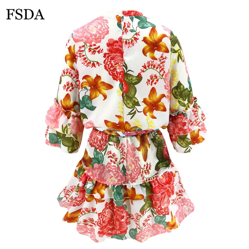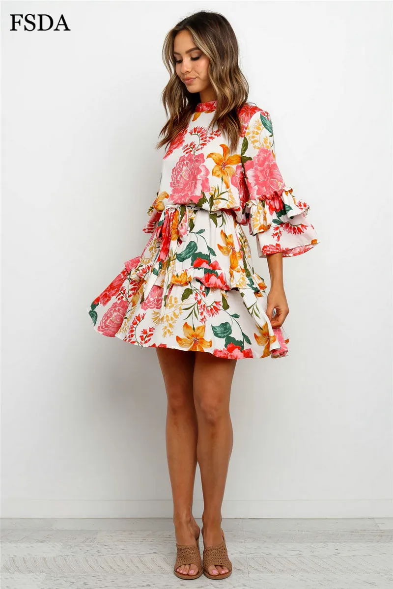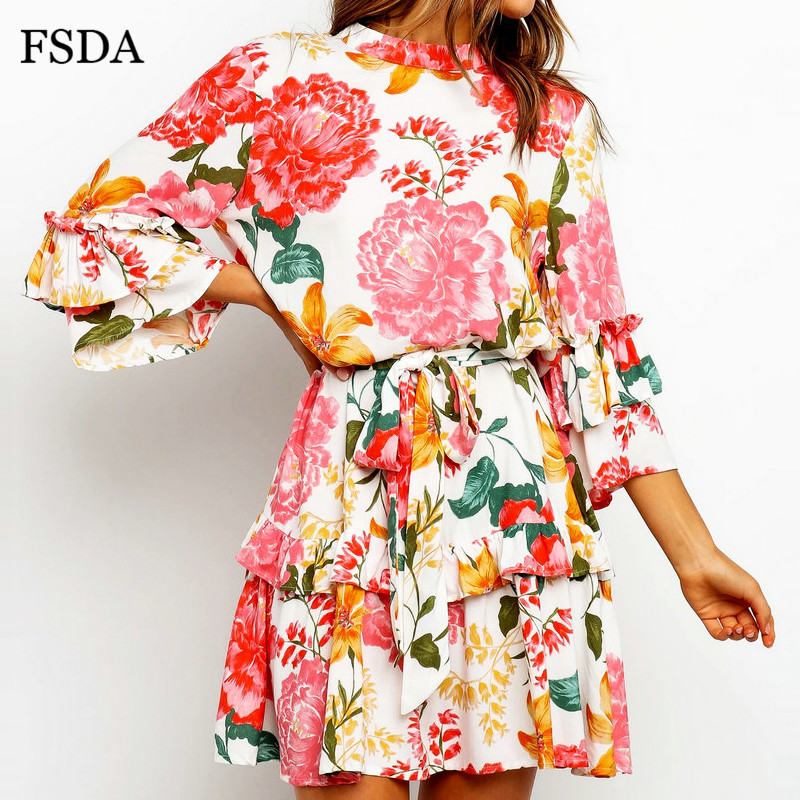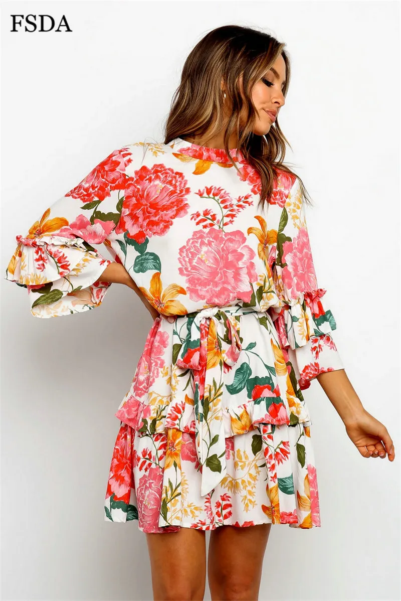 FSDA O Neck Floral Print Flower Ruffles Dress Boho Beach A Line Spring Casual Mini Women Sashes Elegant Dresses