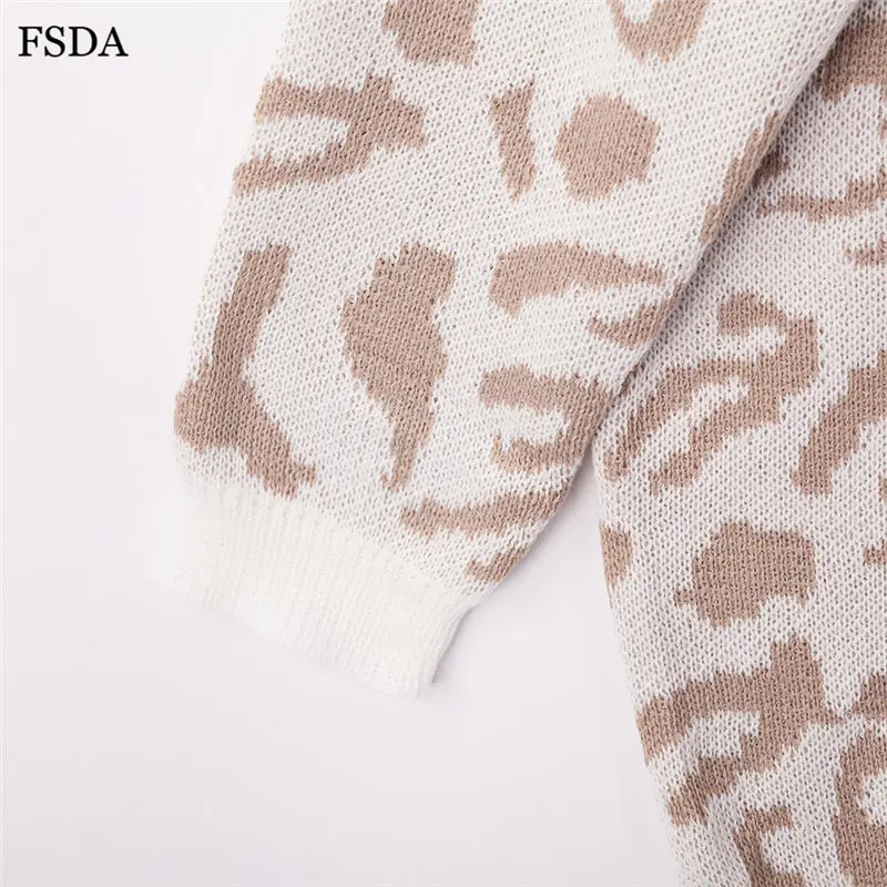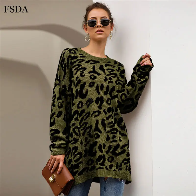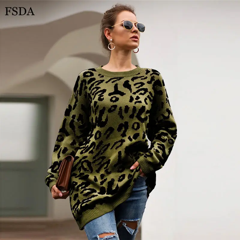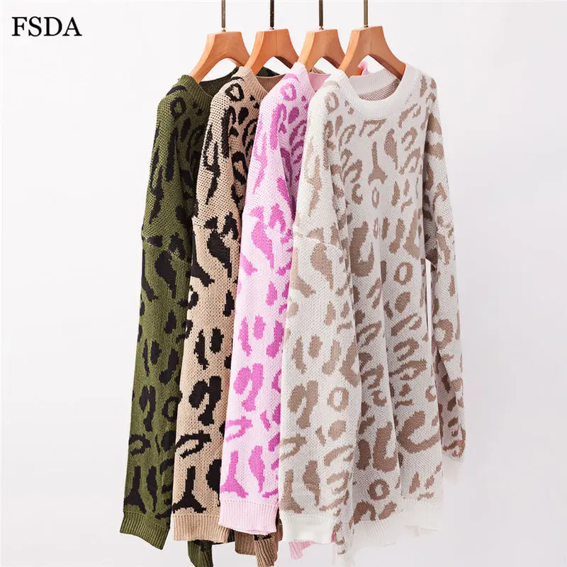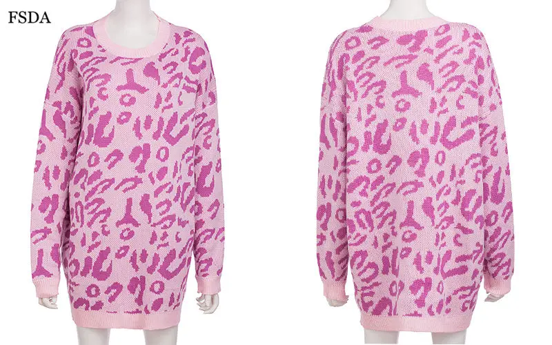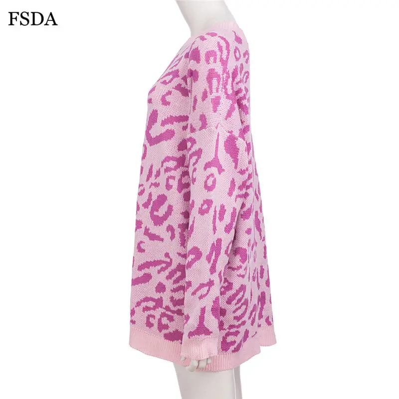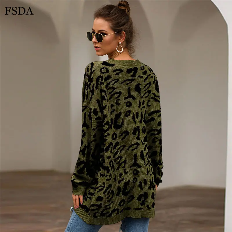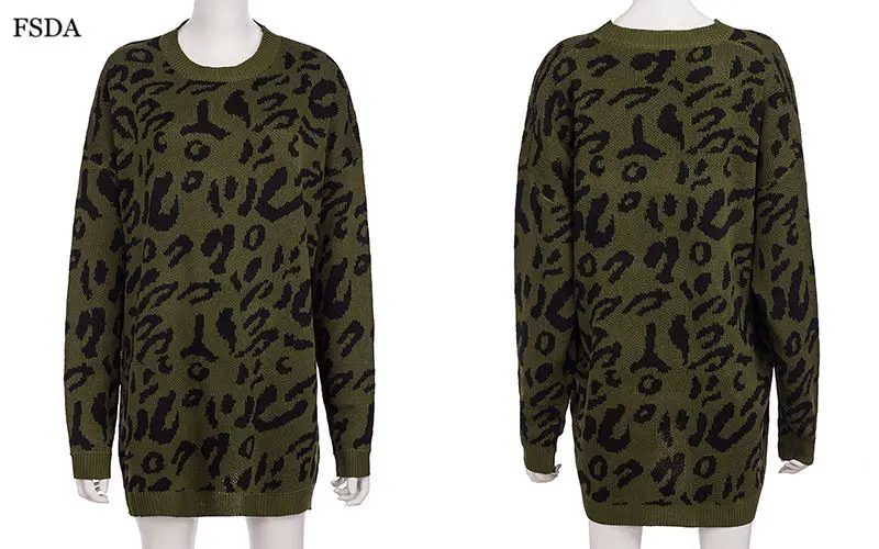 FSDA O Neck Long Sleeve Leopard Sweater Knitted Winter Spring Oversized Casual Green Pink Office Women Pullovers
