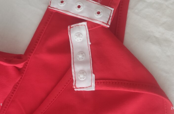In the photo, the fabric looks different. Body cotton, stretches, pleasant to the body. Clasp on 3 plastic buttons is not too convenient.