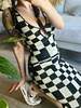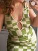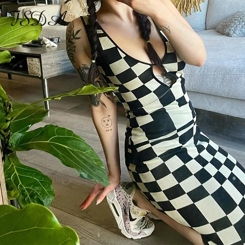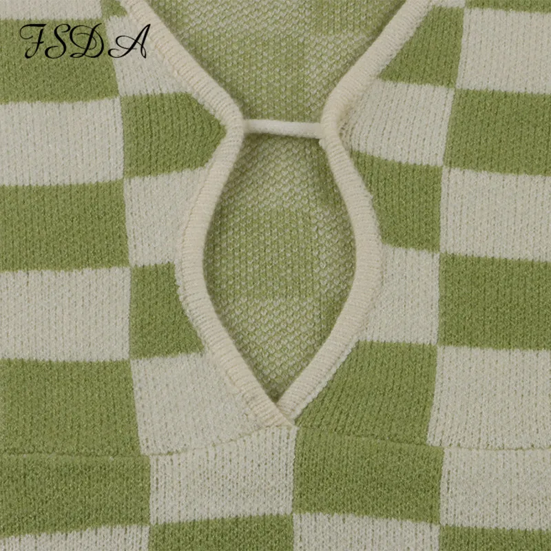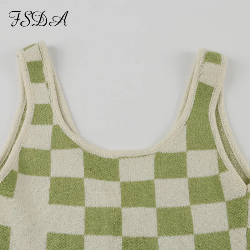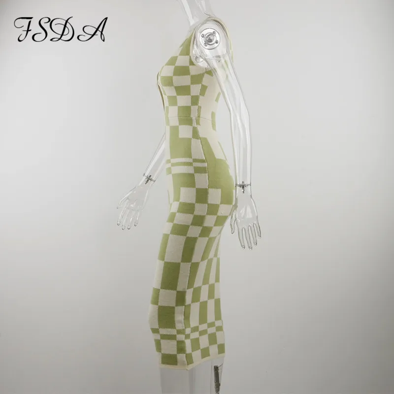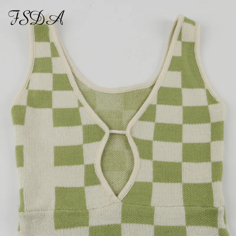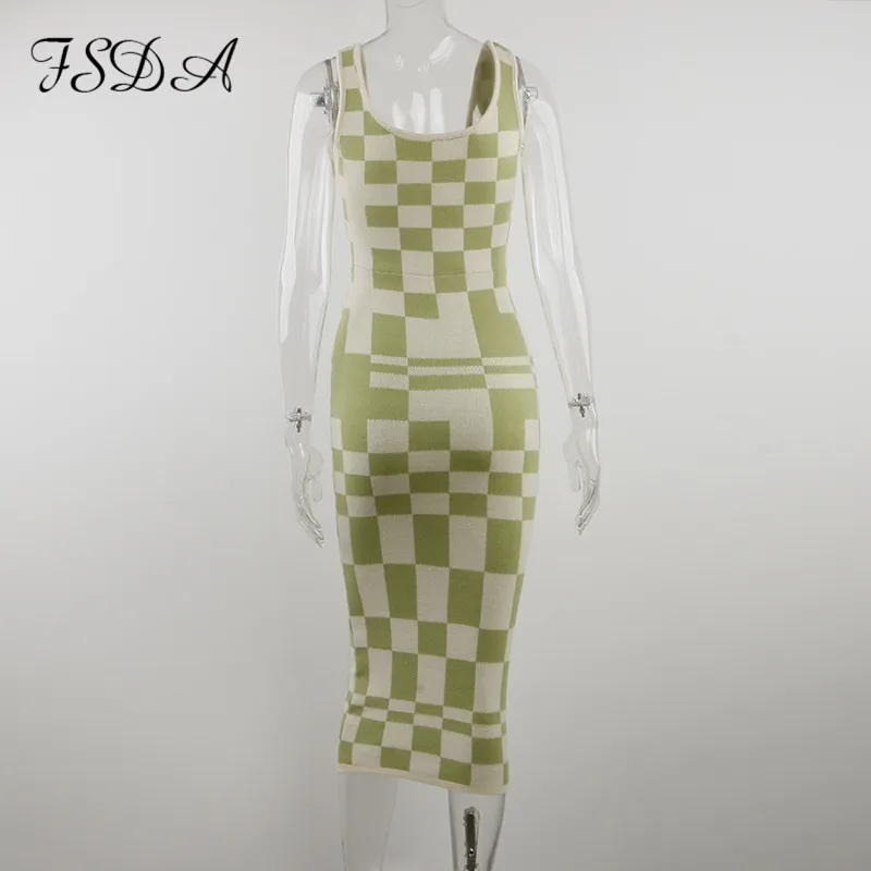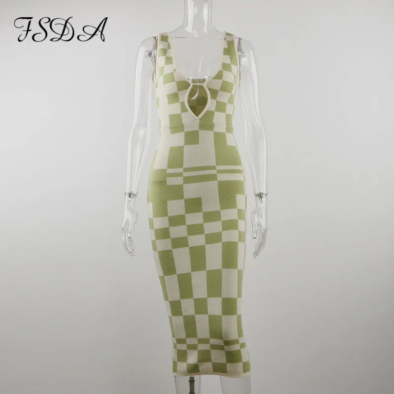 FSDA Plaid 2021 Summer Bodycon Dress Women Midi Knit Sleeveless Hollow Out V Neck Sexy Casual Green Beach Dresses