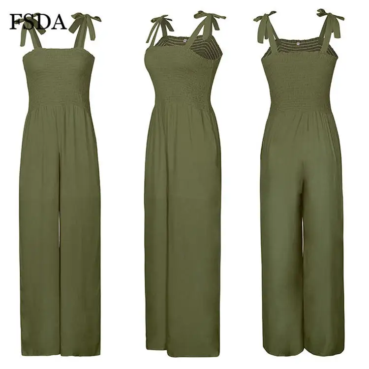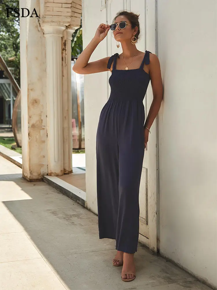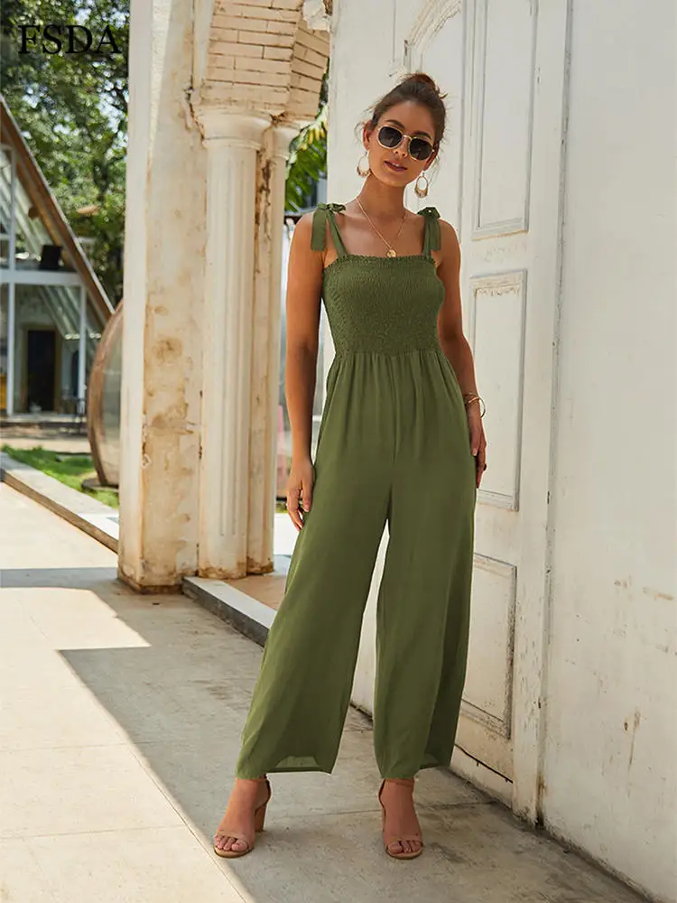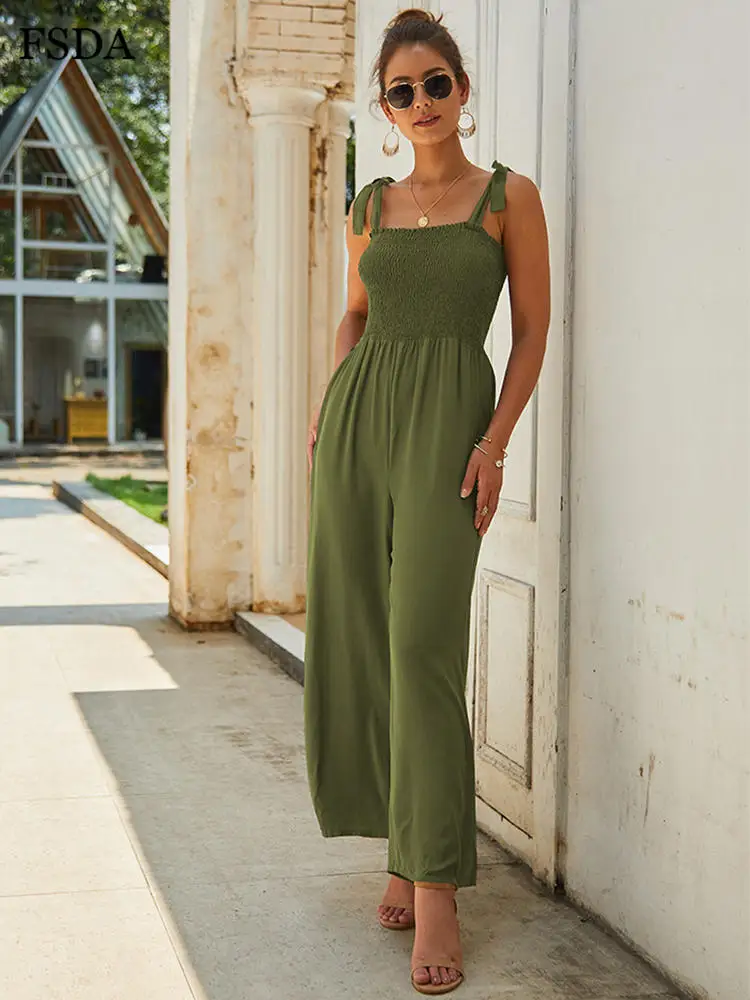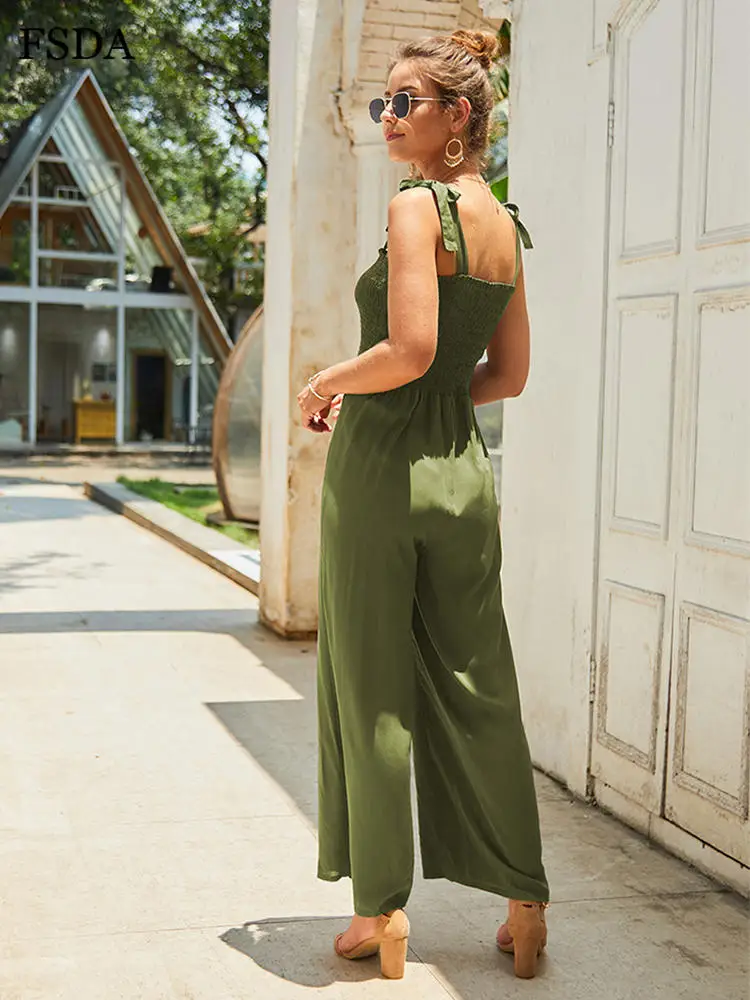FSDA Ruched Lace Up Bow Strap Jumpsuit Backless Chiffon Casual Sleeveless Women Summer Jumpsuits