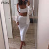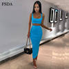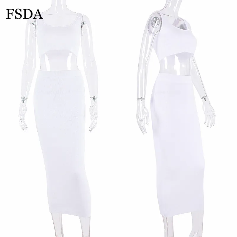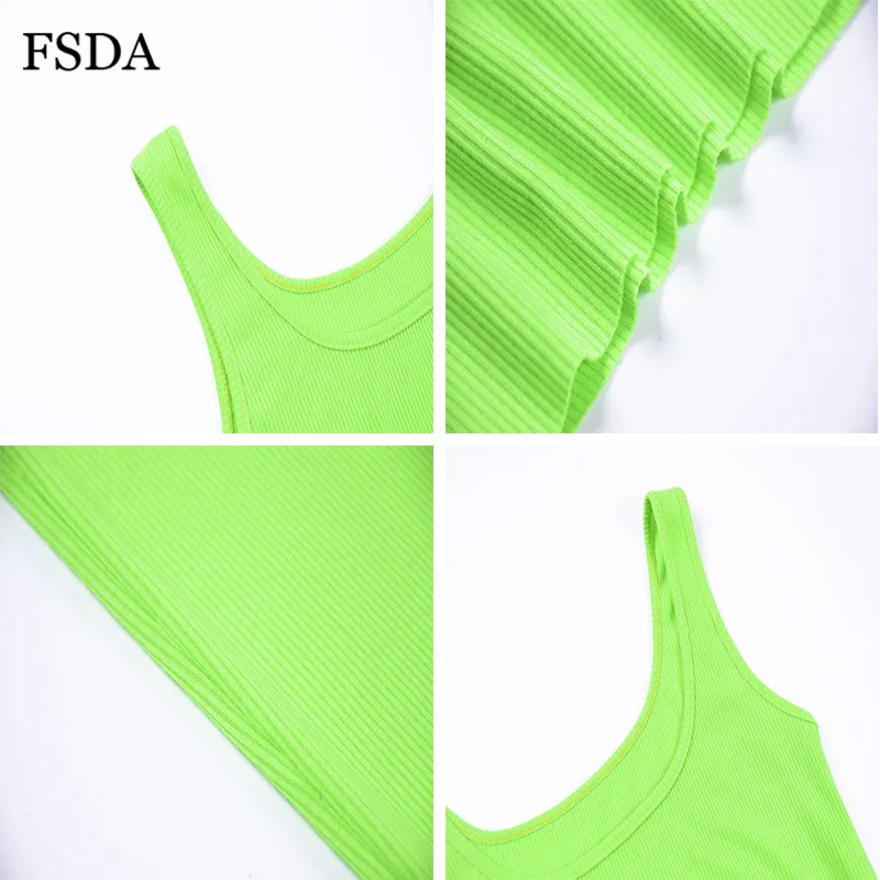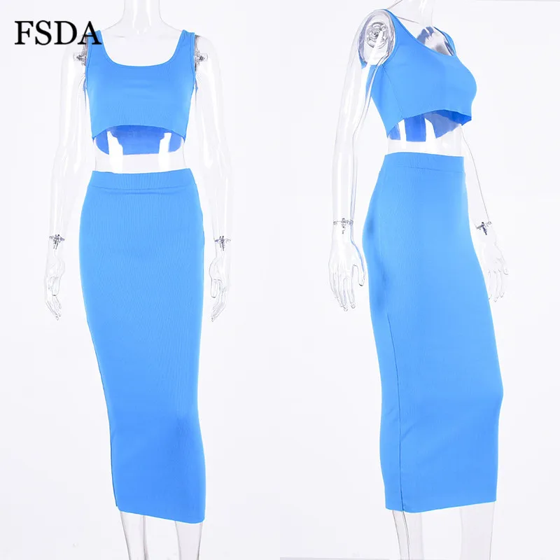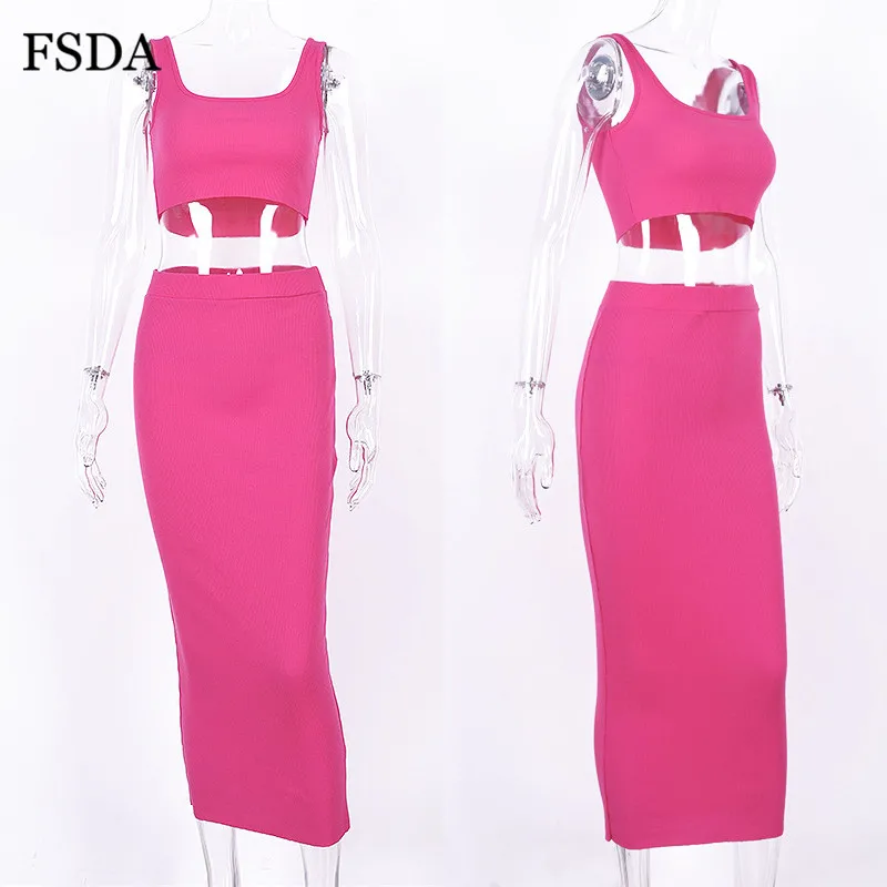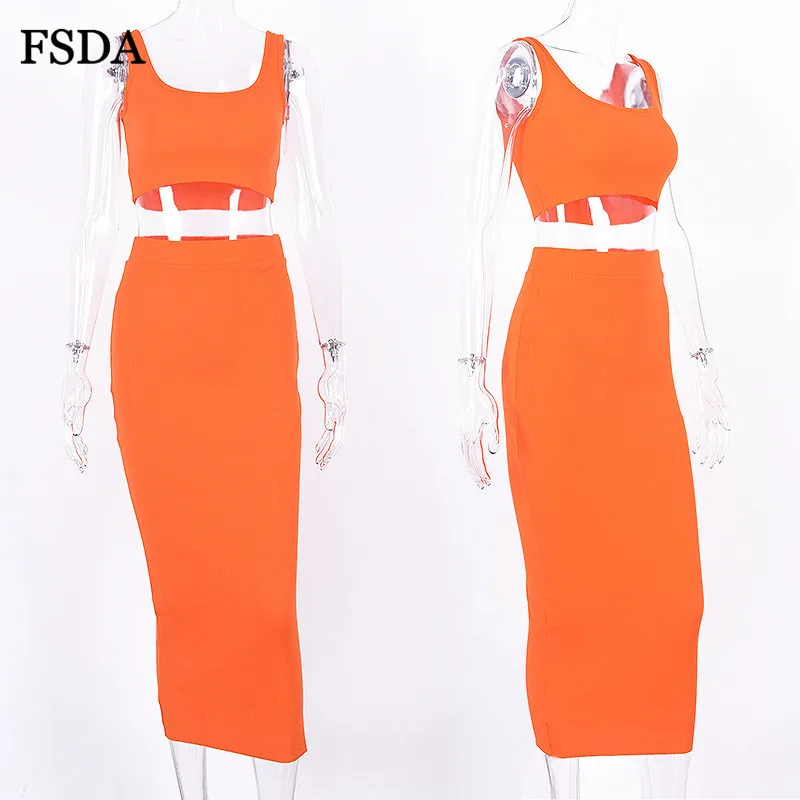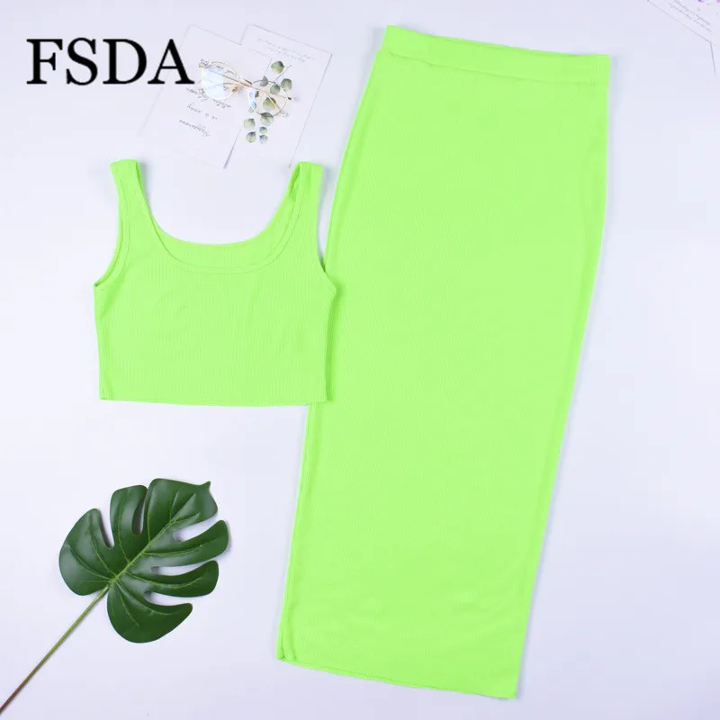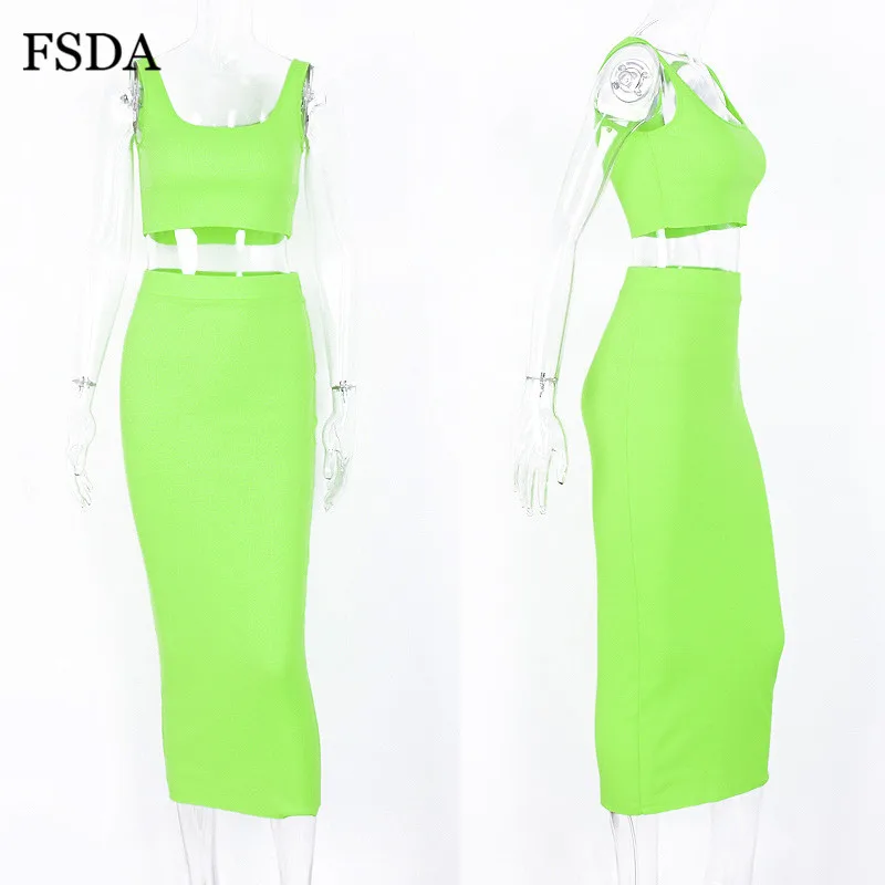 FSDA Summer Neon Two Piece Set Sleeveless Backless Crop Top And Midi Skirt Bodycon Solid Casual Women Party Set