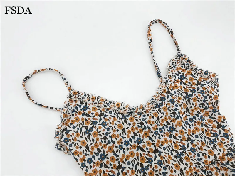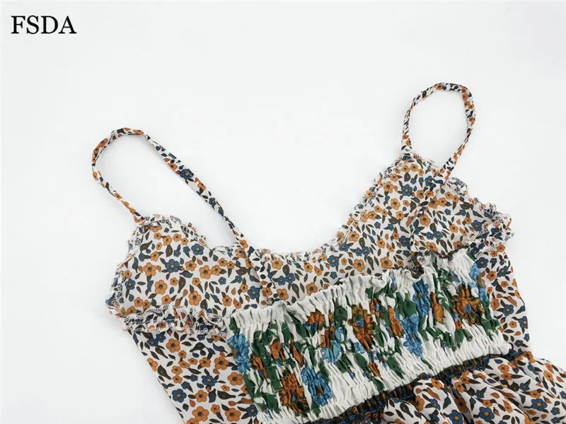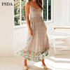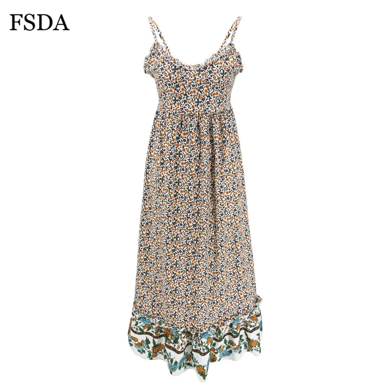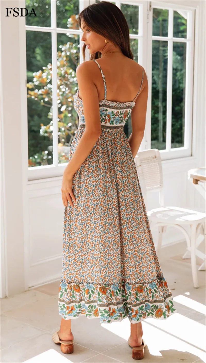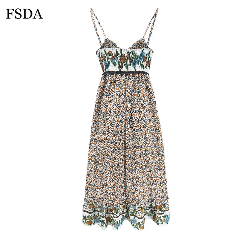 FSDA V Neck Flora Print Women Midi Dress Beach Summer Sleeveless Ruffles A Line Casual Backless Lady Flower Boho Dresses