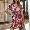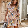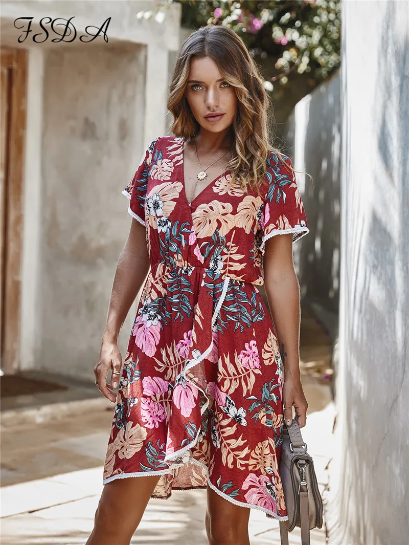 FSDA V Neck Floral Print Wrap Dress Casual Summer Short Sleeve Mini Ruffles A Line Boho Women Elegant Dresses Beach