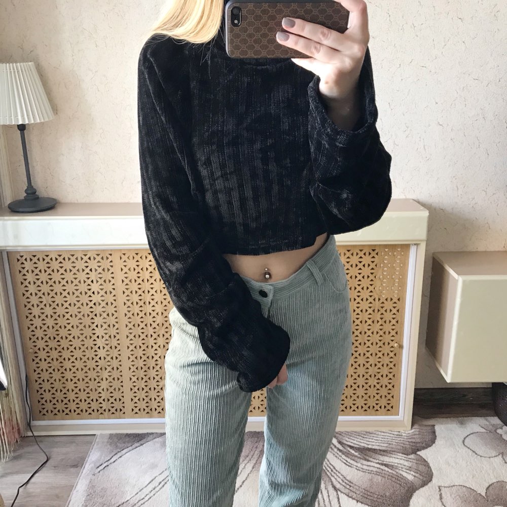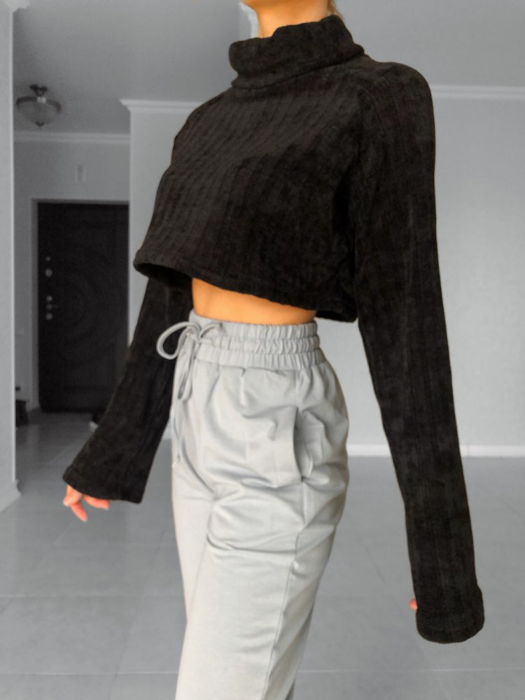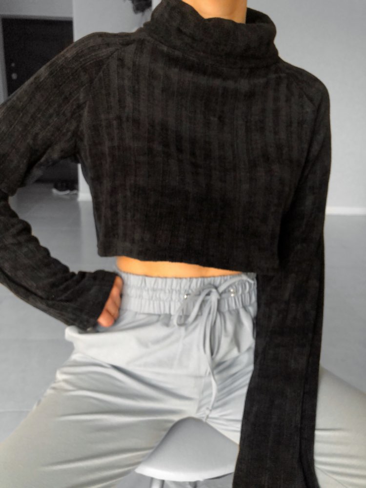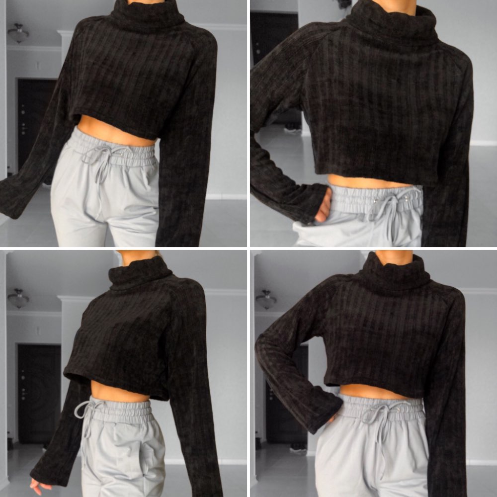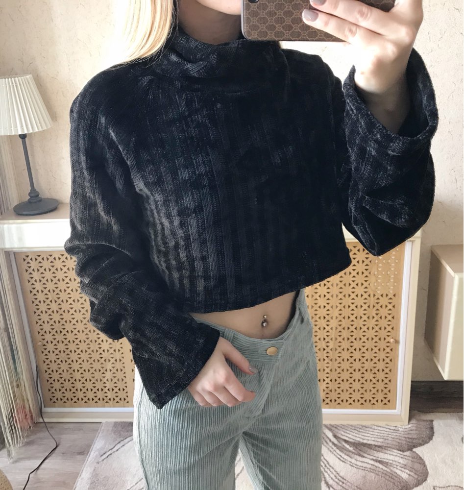 Cropped turtleneck So soft and pleasant, as if wrapped in a plaid) Collar collar, long sleeves. The style is fashionable and stylish. Material: polyester. The fabric is insanely pleasant to the body and stretches well. On my parameters og-77, ot-61, ob-88 ordered M. Color: Black