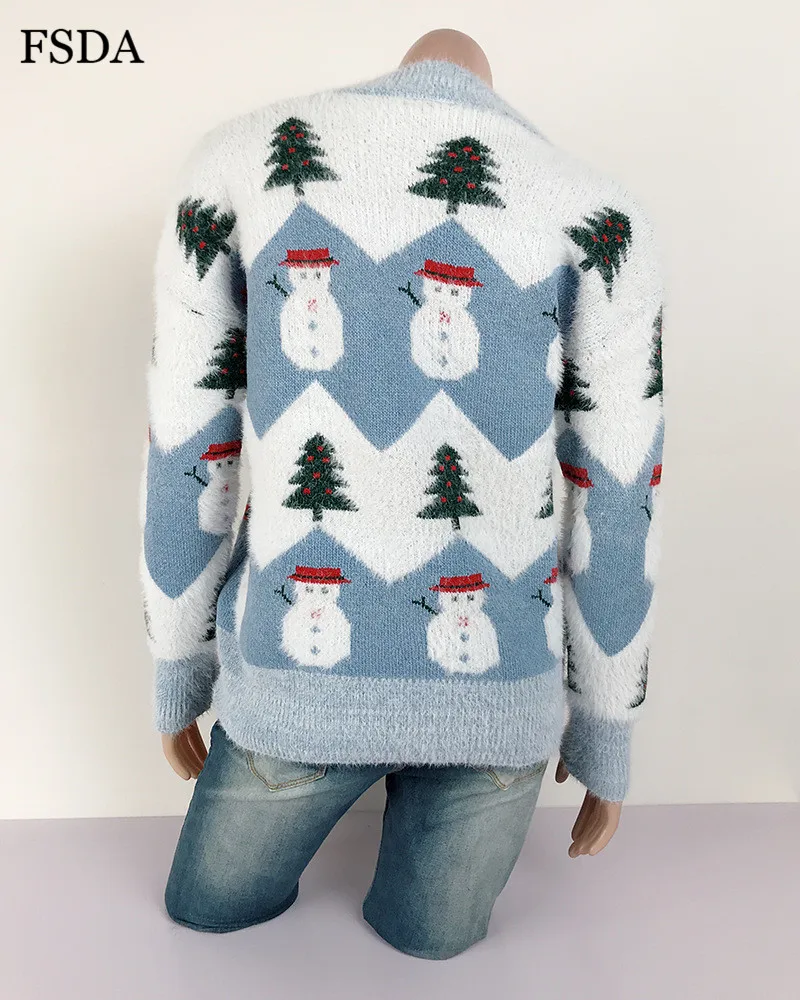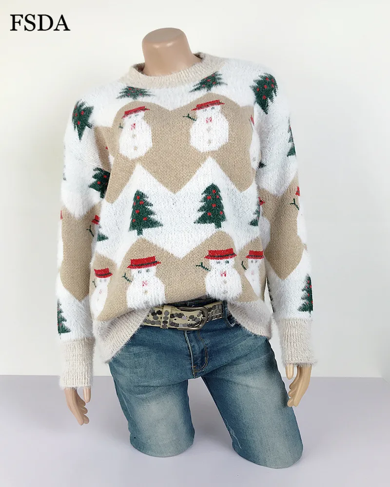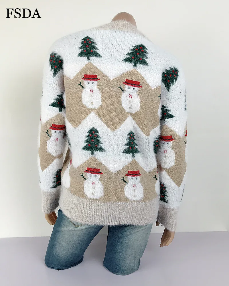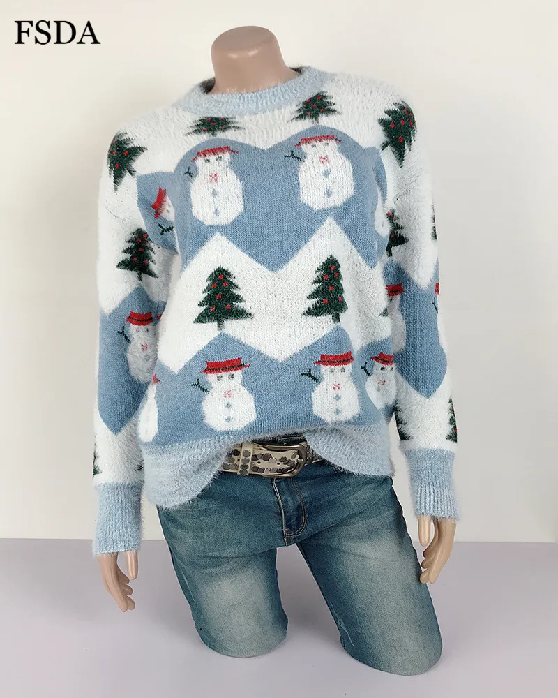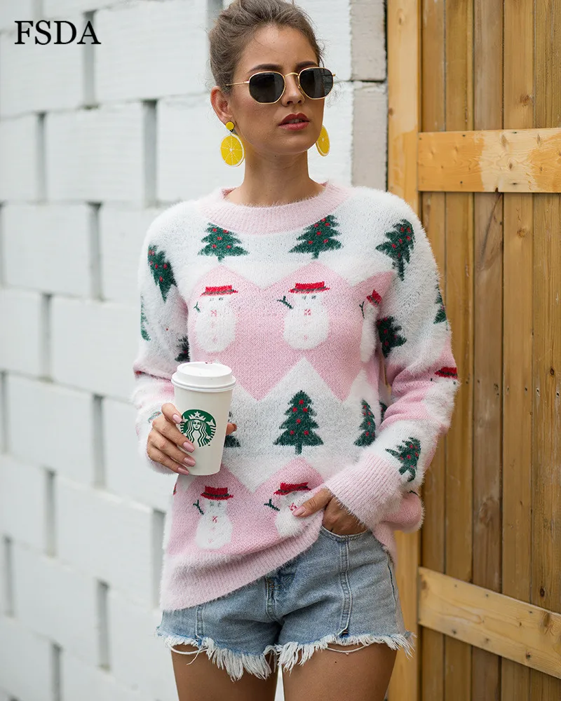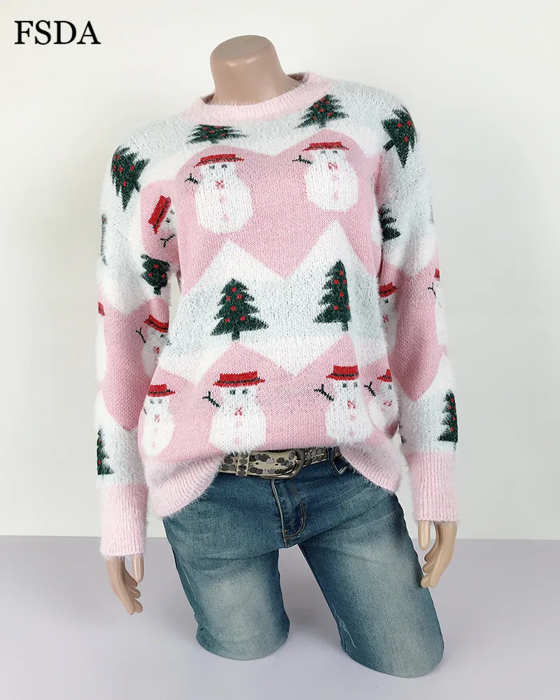 FSDA Women Mohair Christmas Sweater O Neck Loose Long Sleeve Casual Cute Pullover Autumn Winter Jumper Warm Pink Sweaters