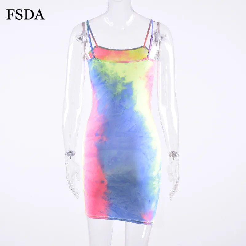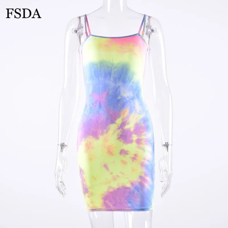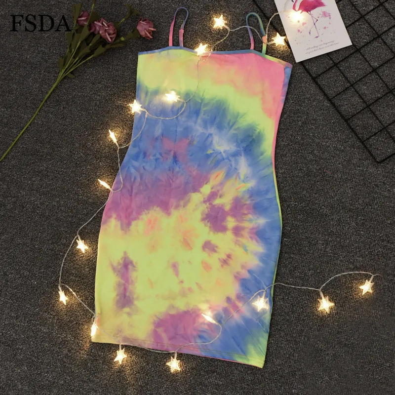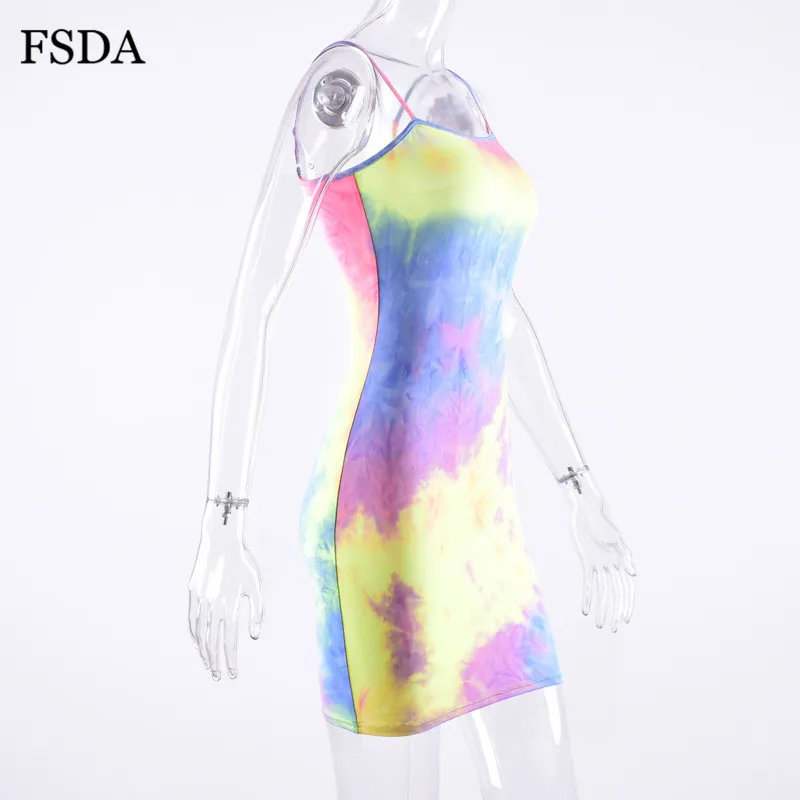 FSDA Women Sexy Bandage Dress 2019 Summer Tie Dye Print Backless Bodycon Sleeveless Strap Party Mini Dresses
