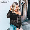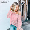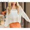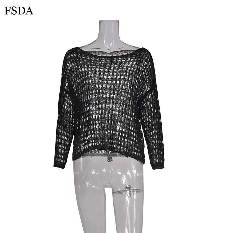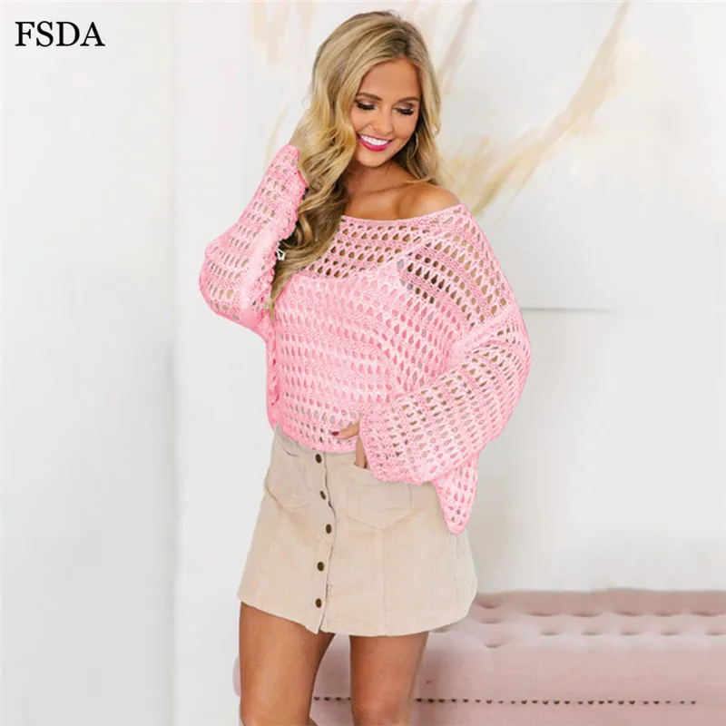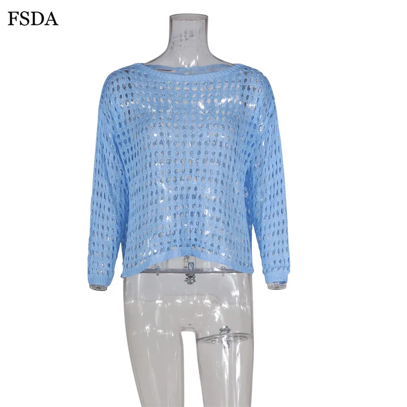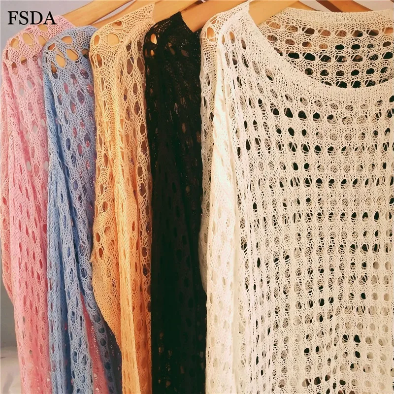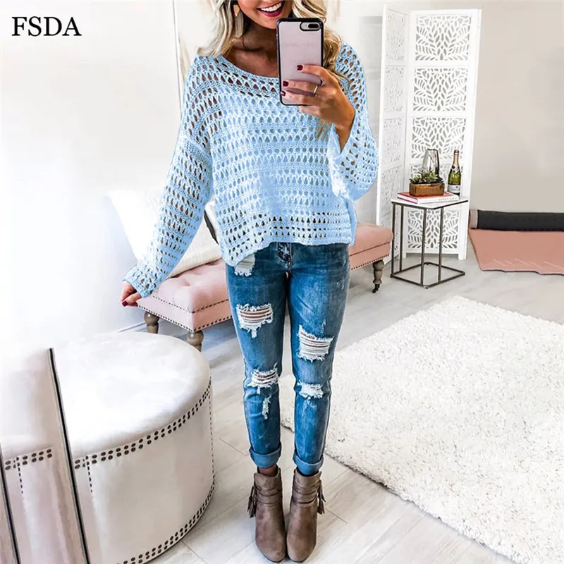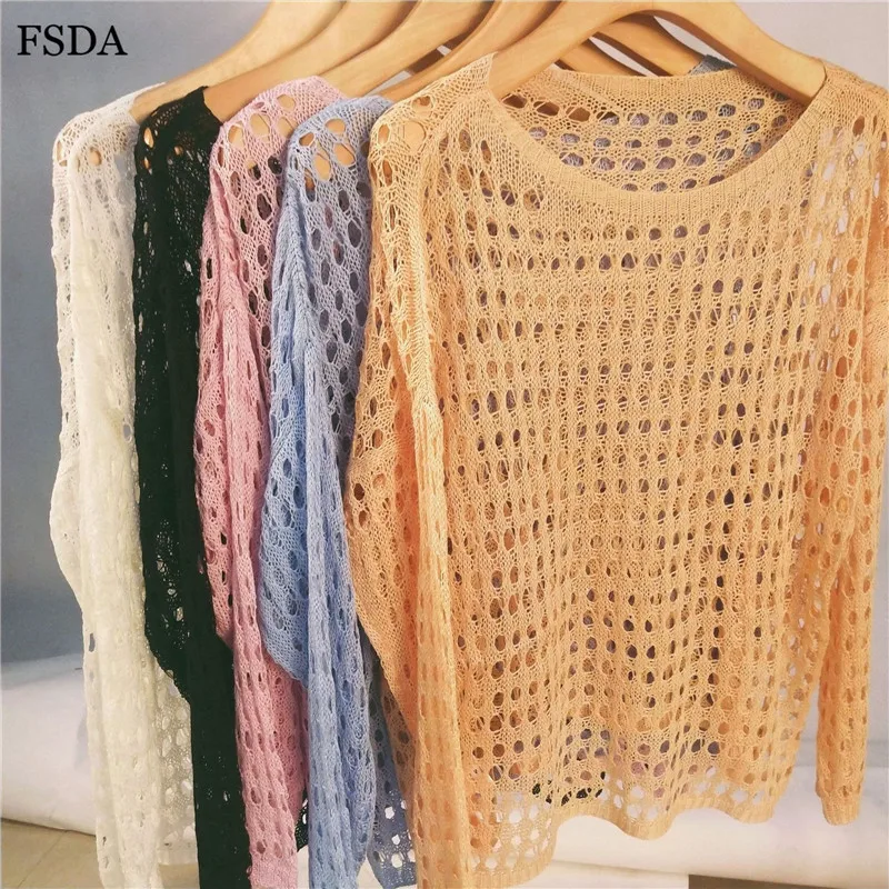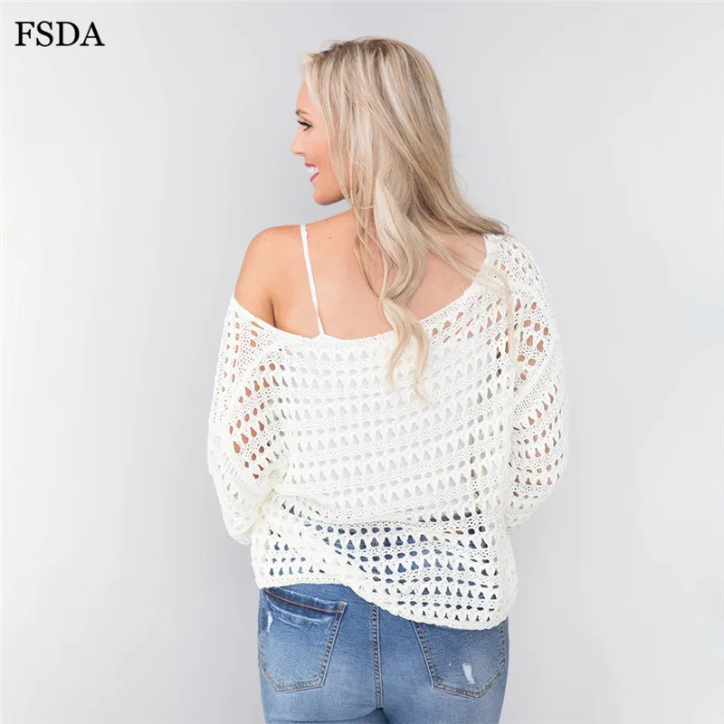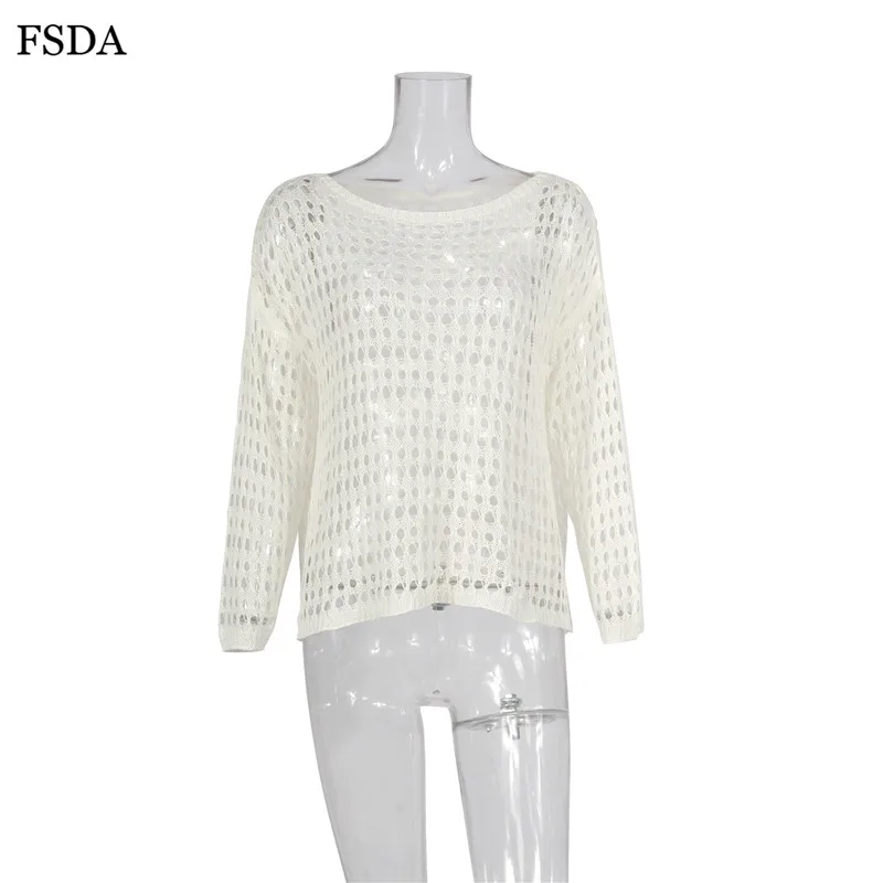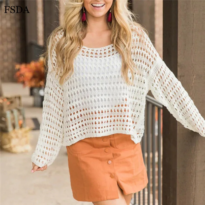 FSDA Women Summer Sexy Hollow Out Blouse Top White Knitted Sweater O Neck Long Sleeve Casual Solid Pullovers Blouse 2019