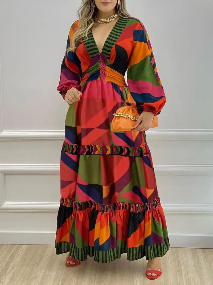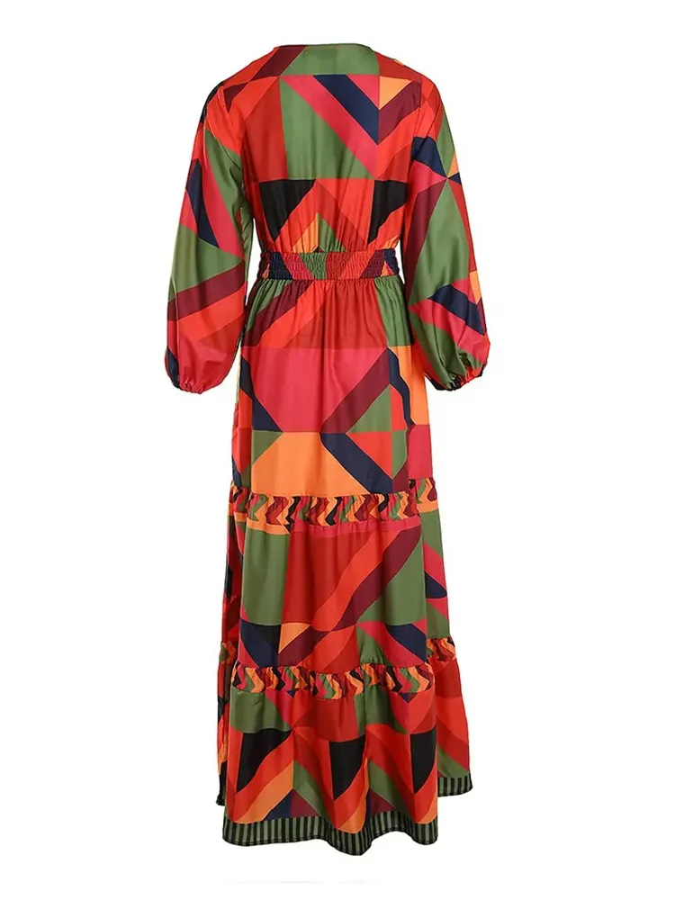 Geometric Print Lantern Sleeve Maxi Dress Women Buttoned V Neck Daily Casual Long Dress