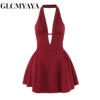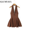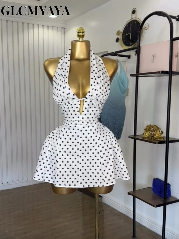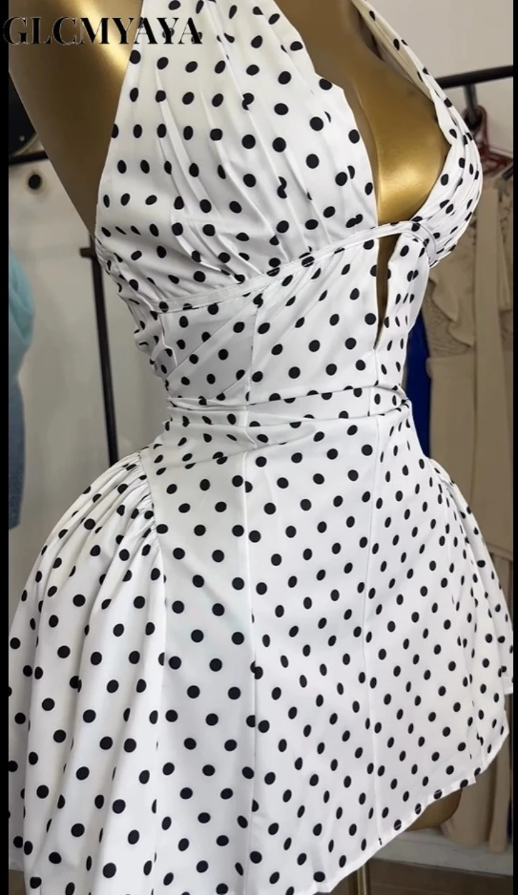 GLCMYAYA Women Dot Printed Halter Neck Backless Pleated Front A-line Mini Dress 2025 Vacation Holiday Elegant Sexy Party Dresses