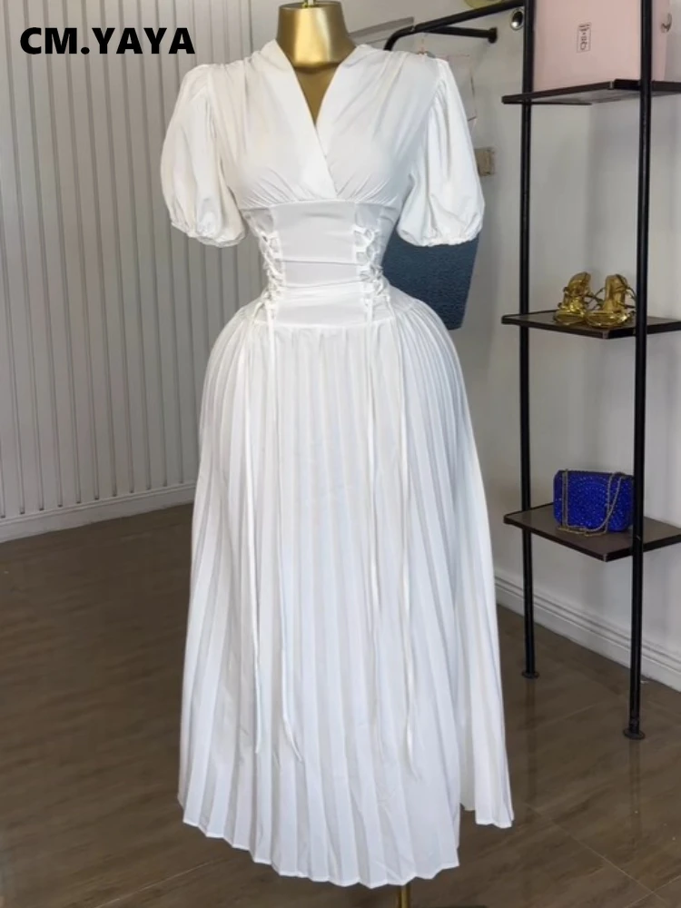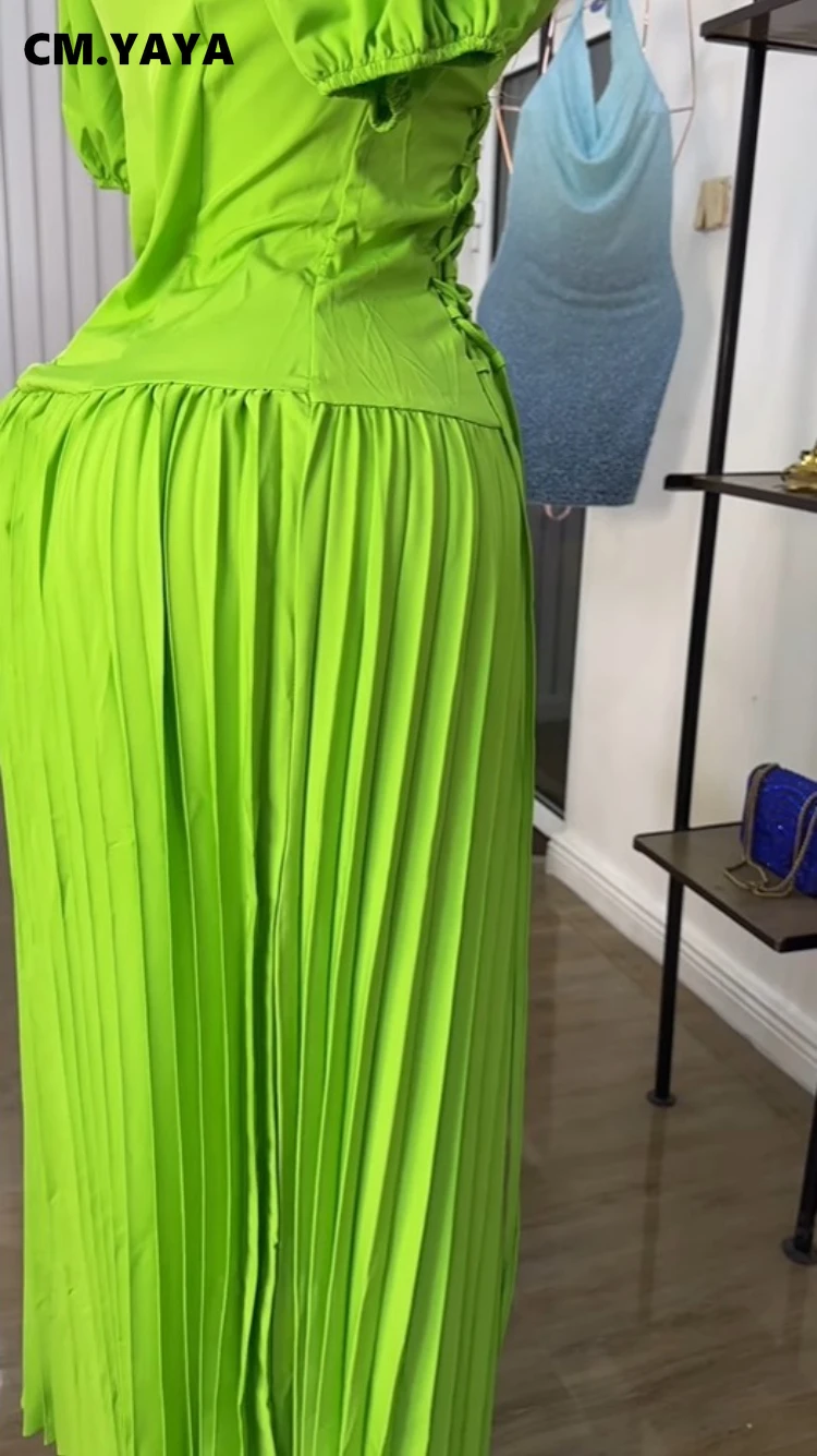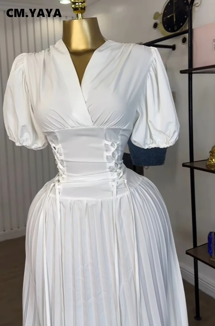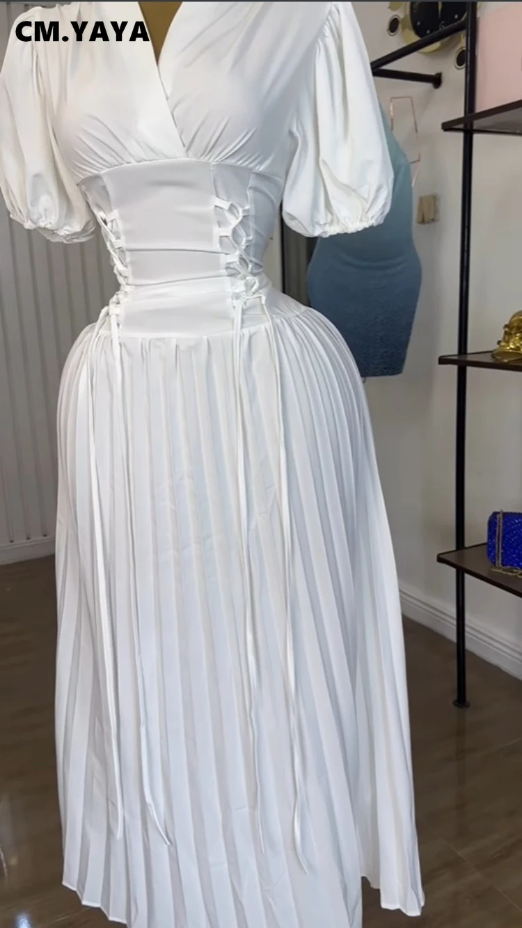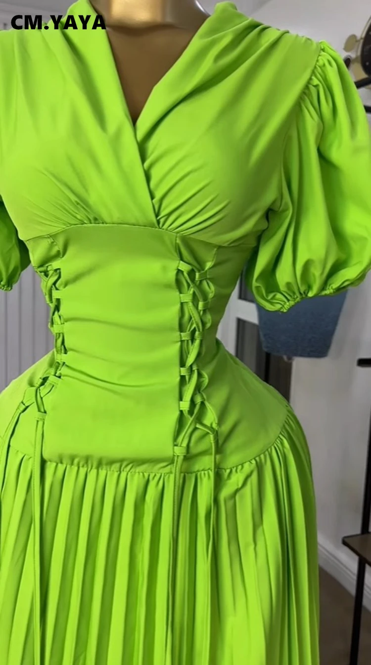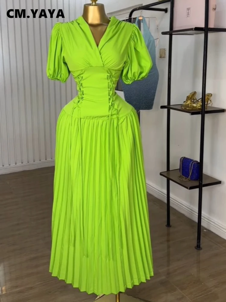 GLCMYAYA Women Lantern Short Sleeve Ruched Stacked Shoulder V-neck Pleated A-line Maxi Long Dress 2025 Vacation Elegant Dresses