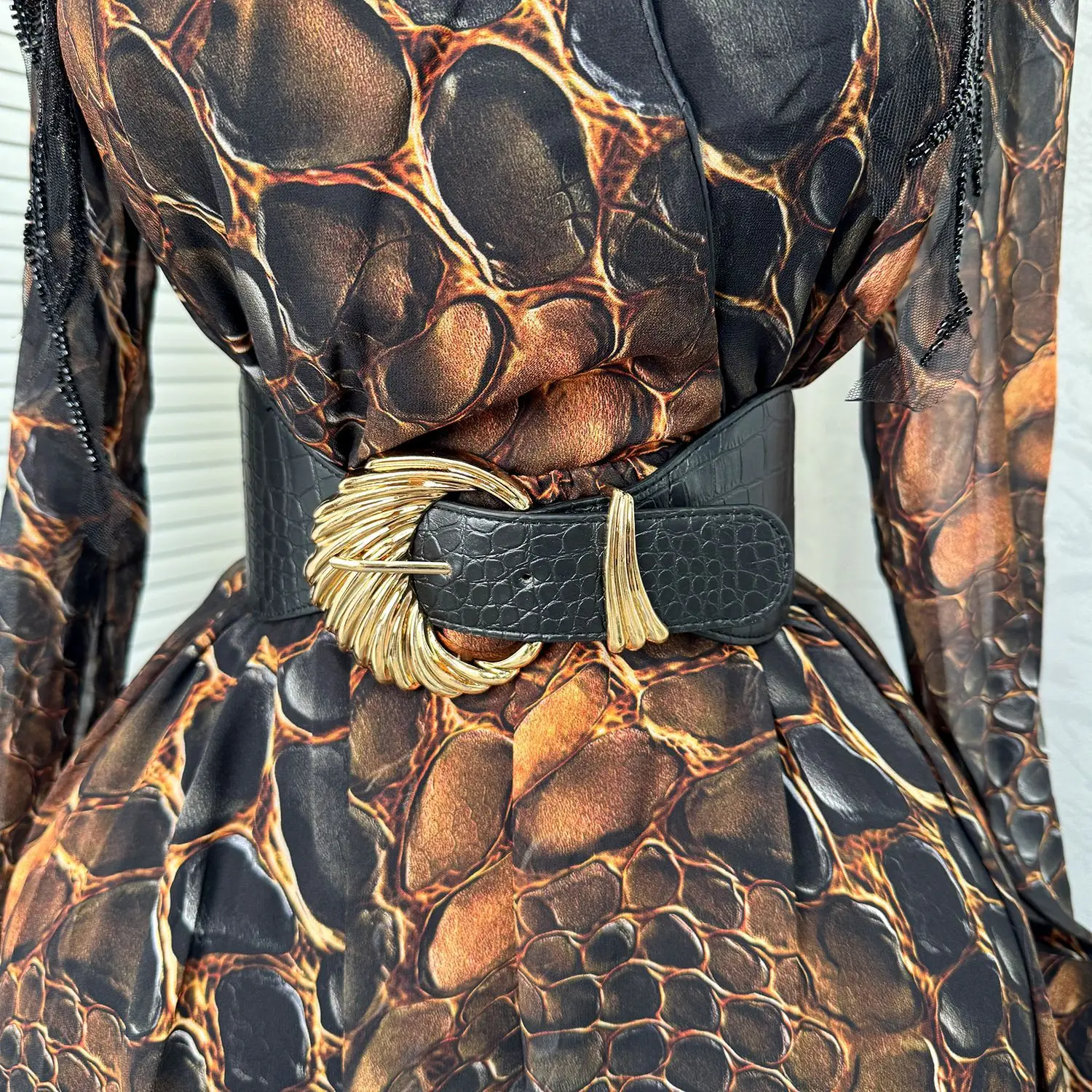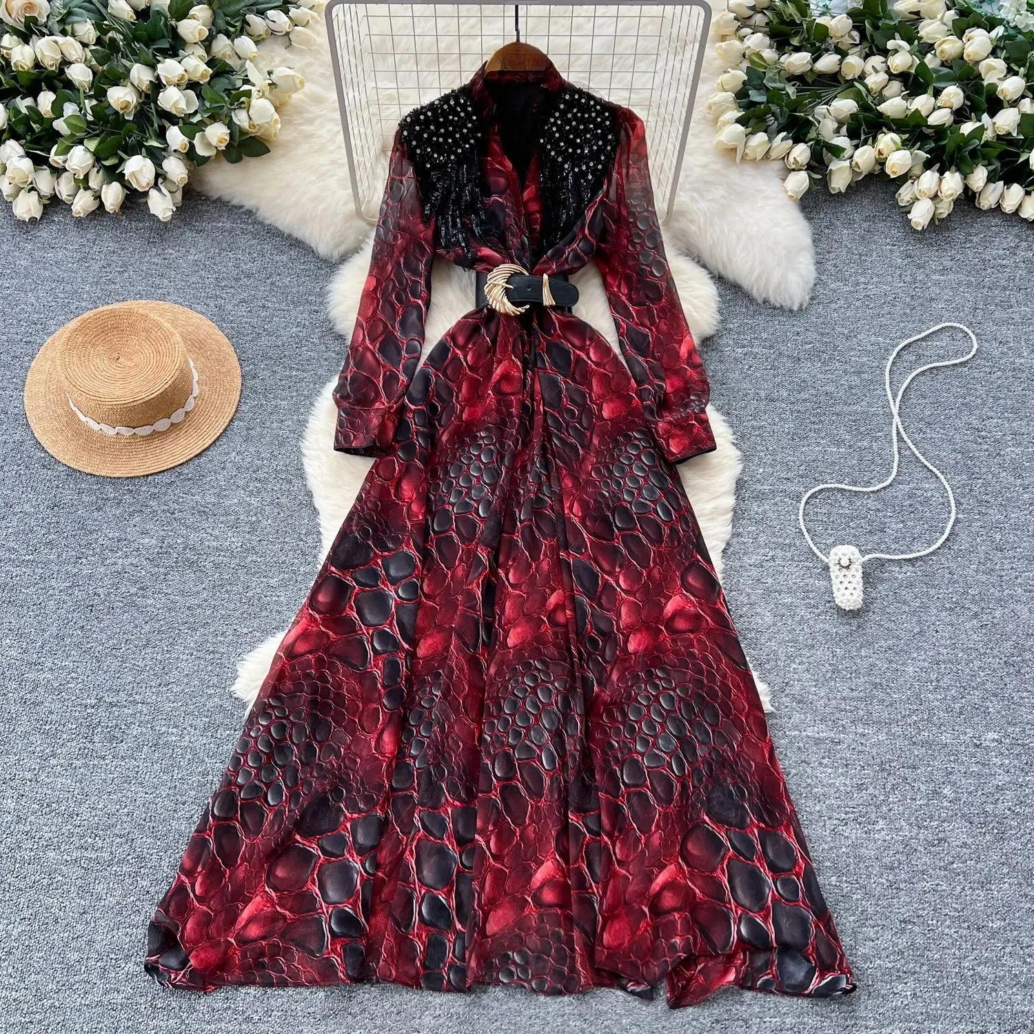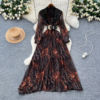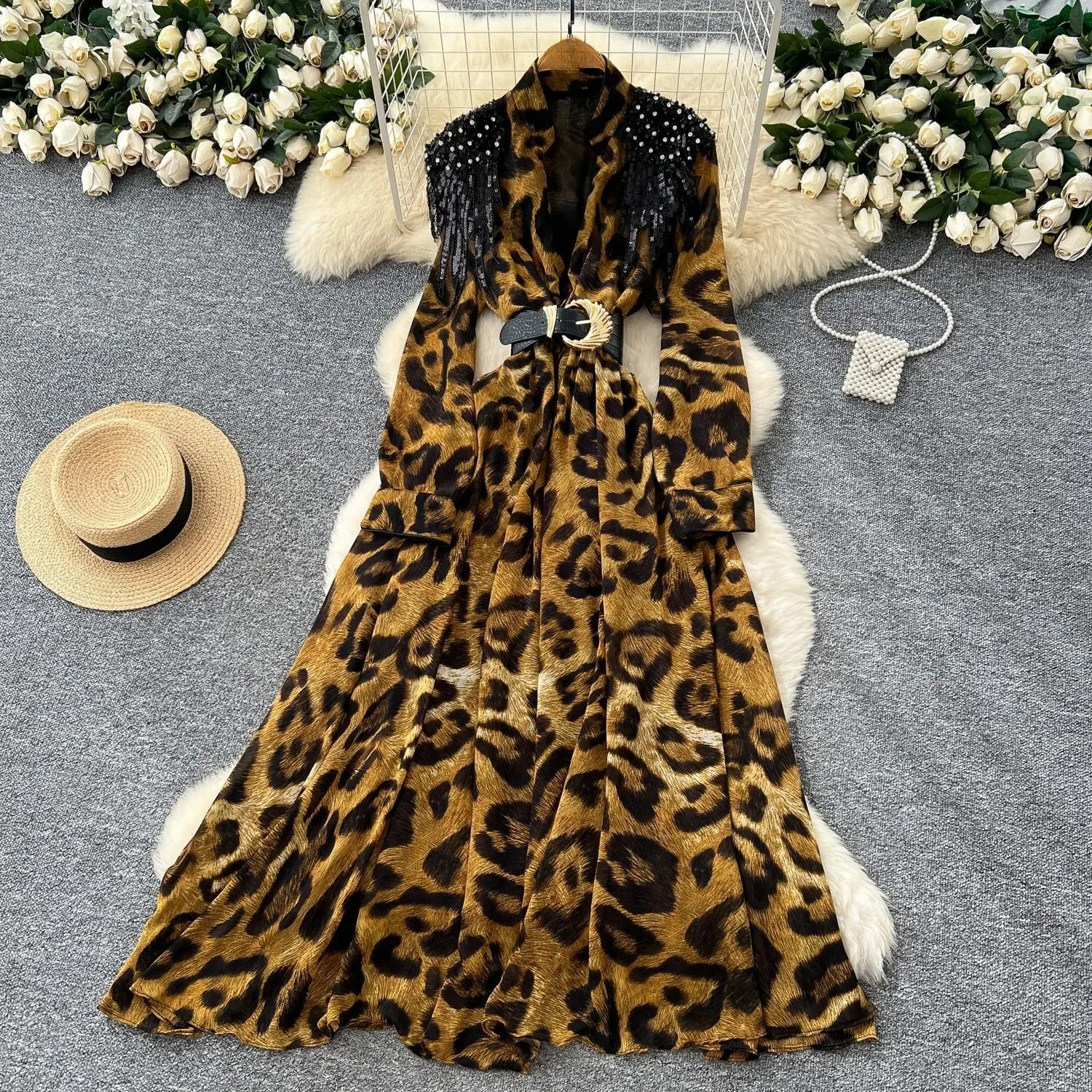 GLCMYAYA Women Leopard Long Sleeve V-neck with Sashes A-line Maxi Long Dress 2025 Summer Vacation Holiday Elegant Dresses