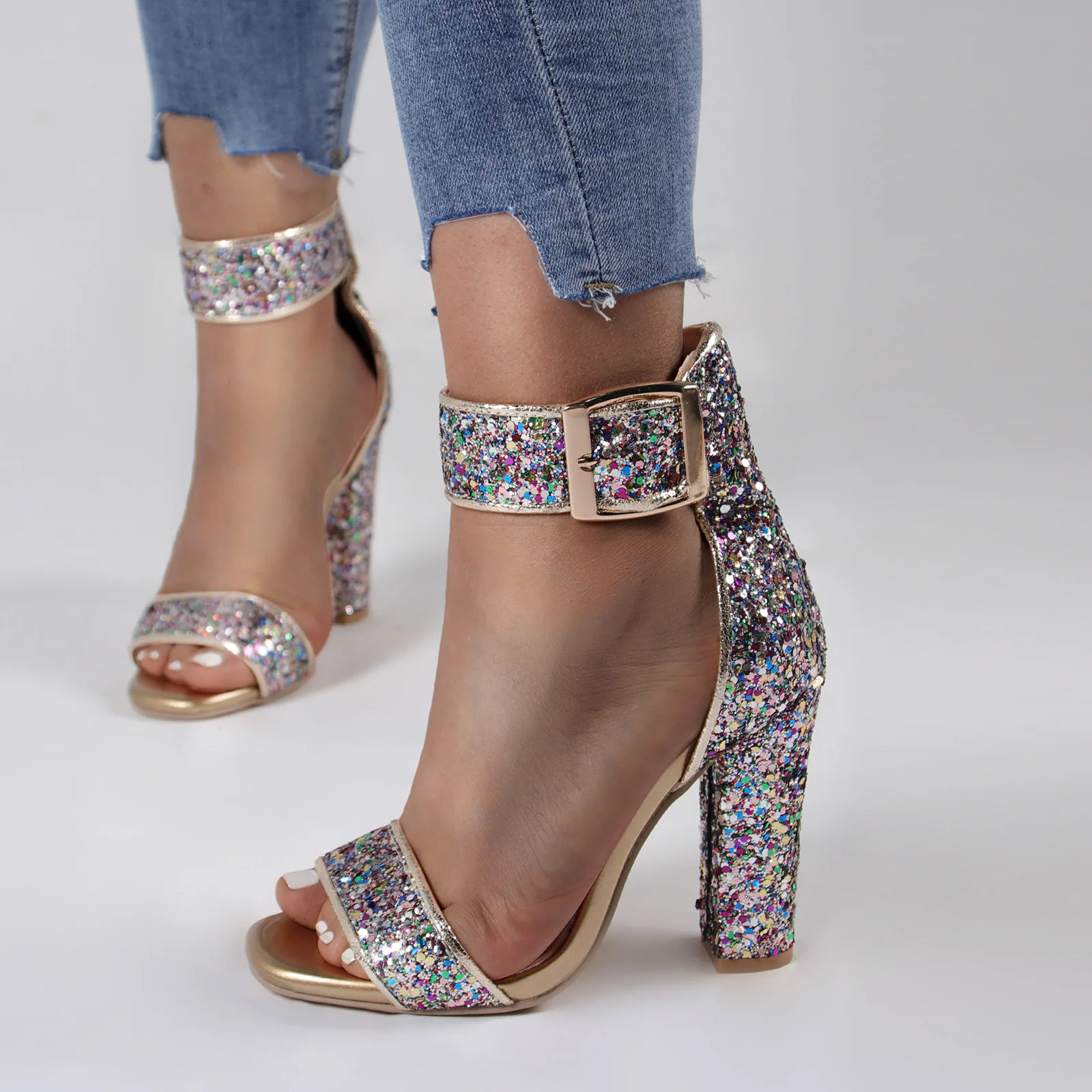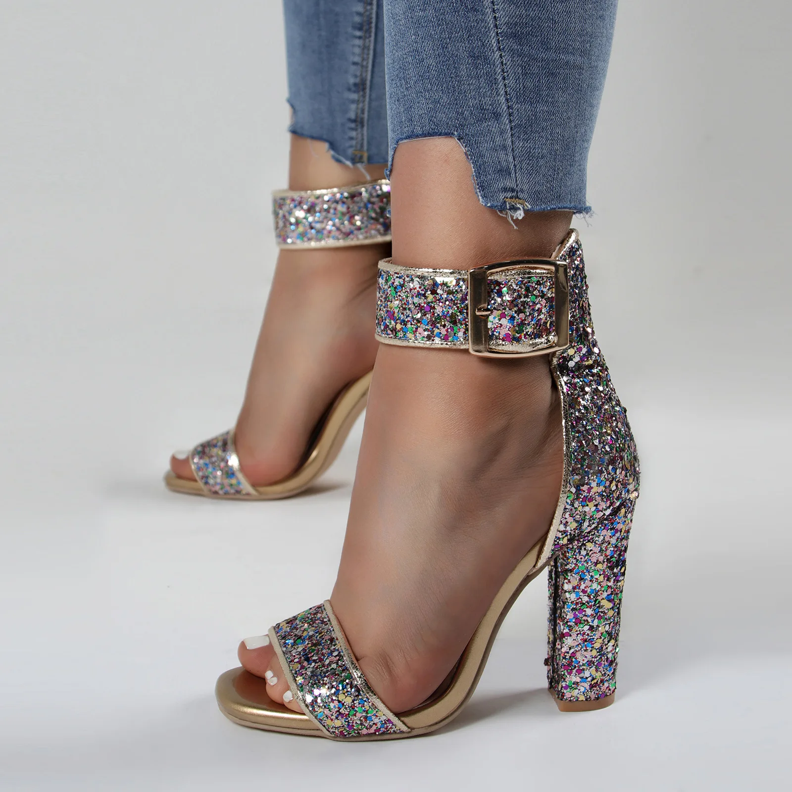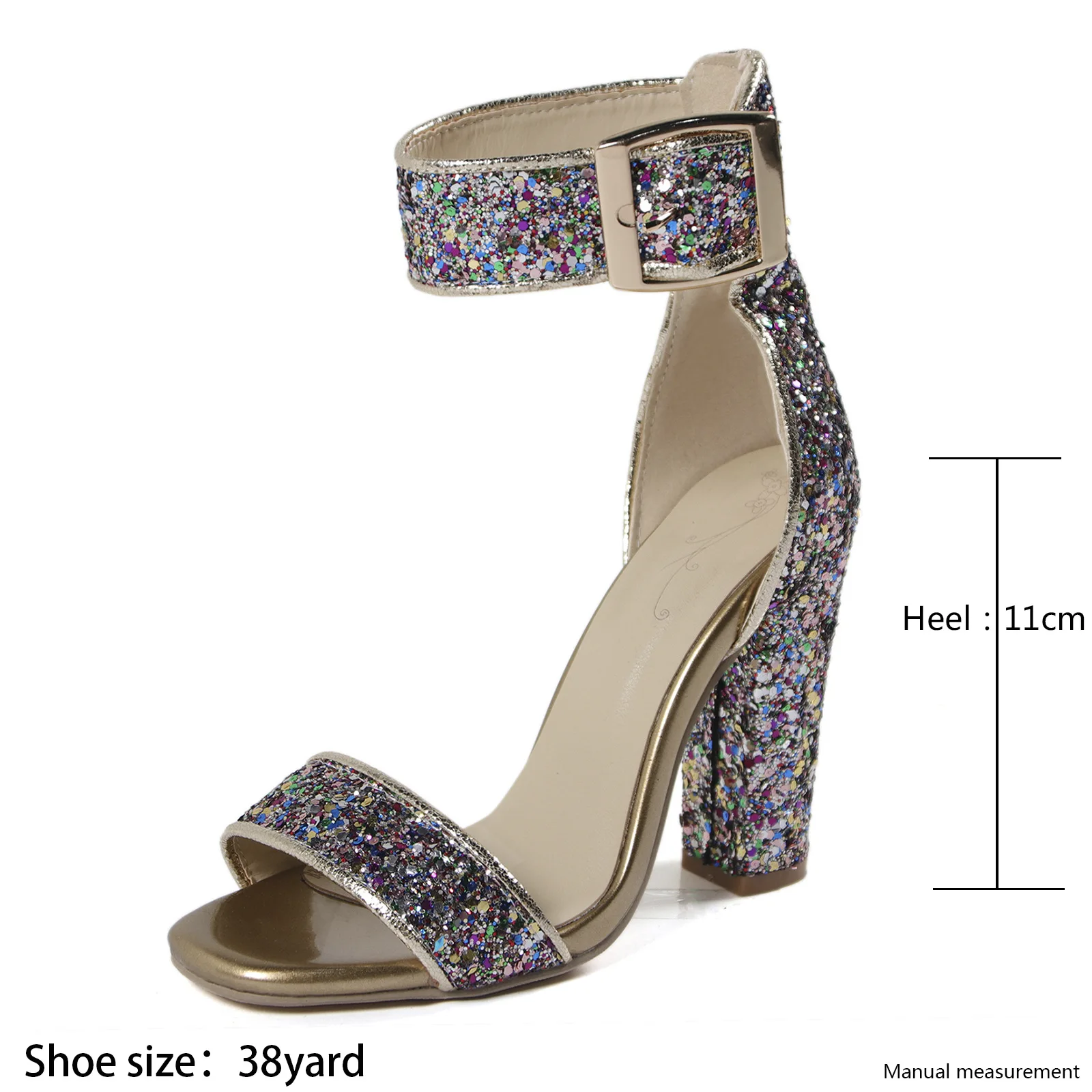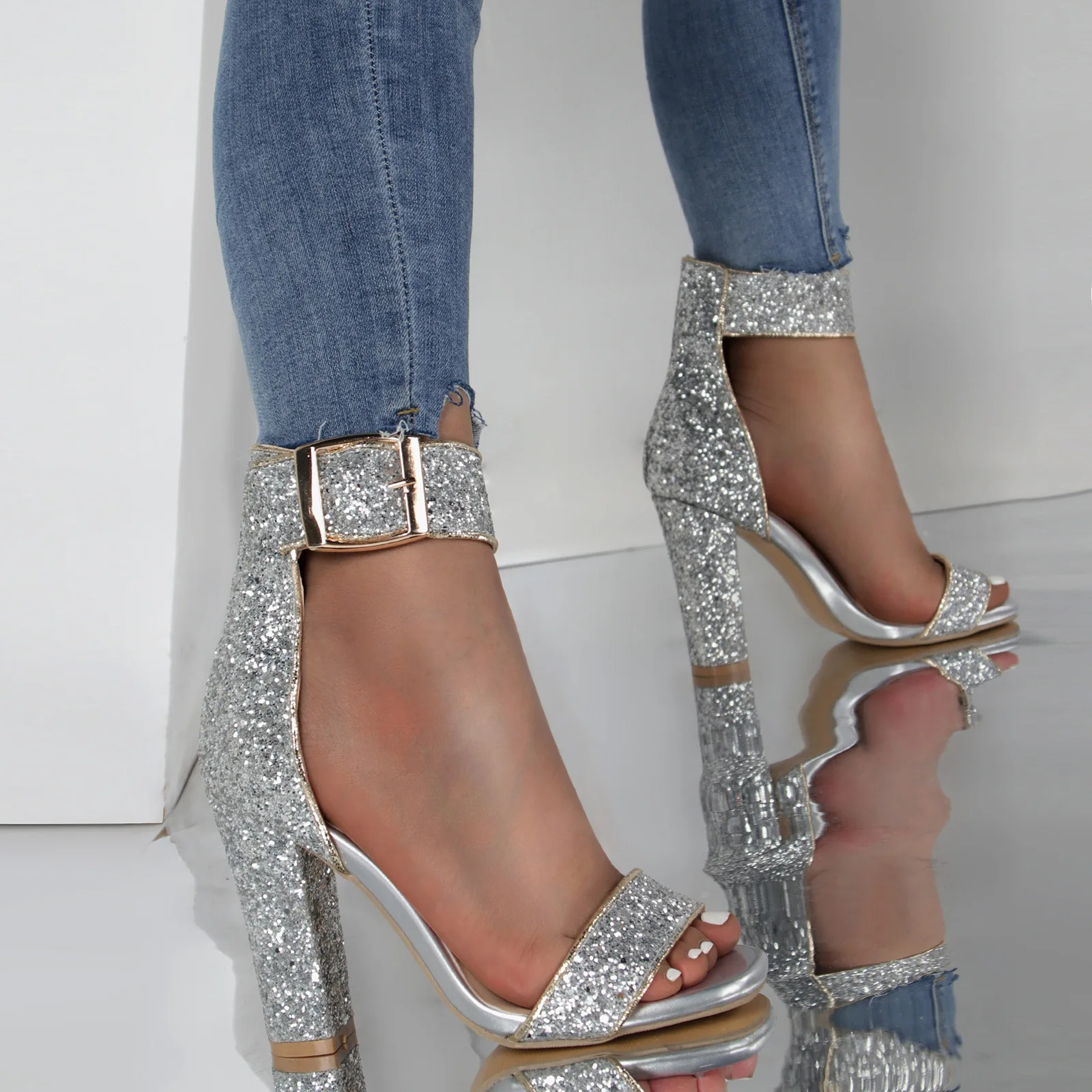 Glitter Thick Heels Women Sandals Fashion 2021 Summer Silver Bling Ankle Buckle Pumps Ladies Open Toe Platform Dress Party Shoes