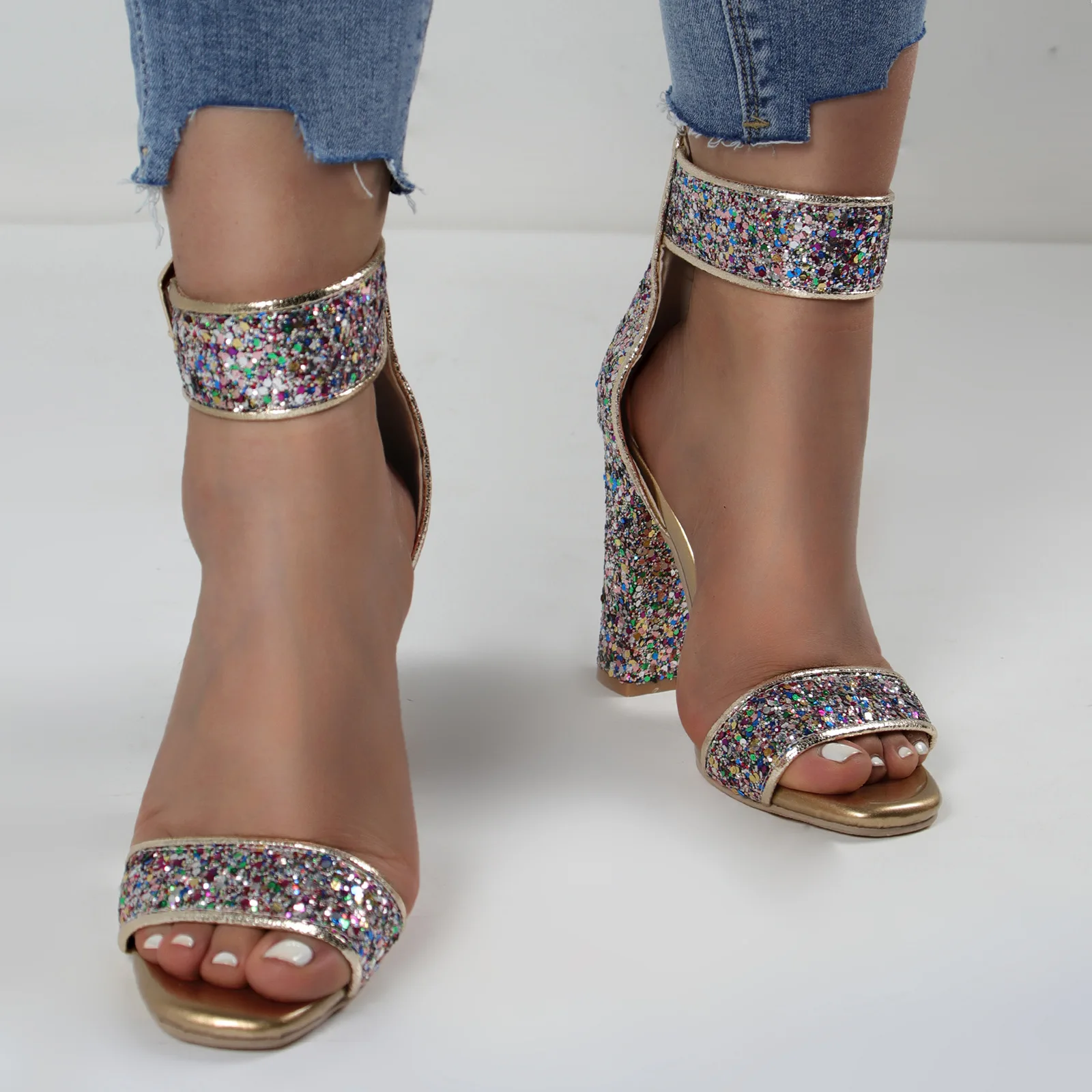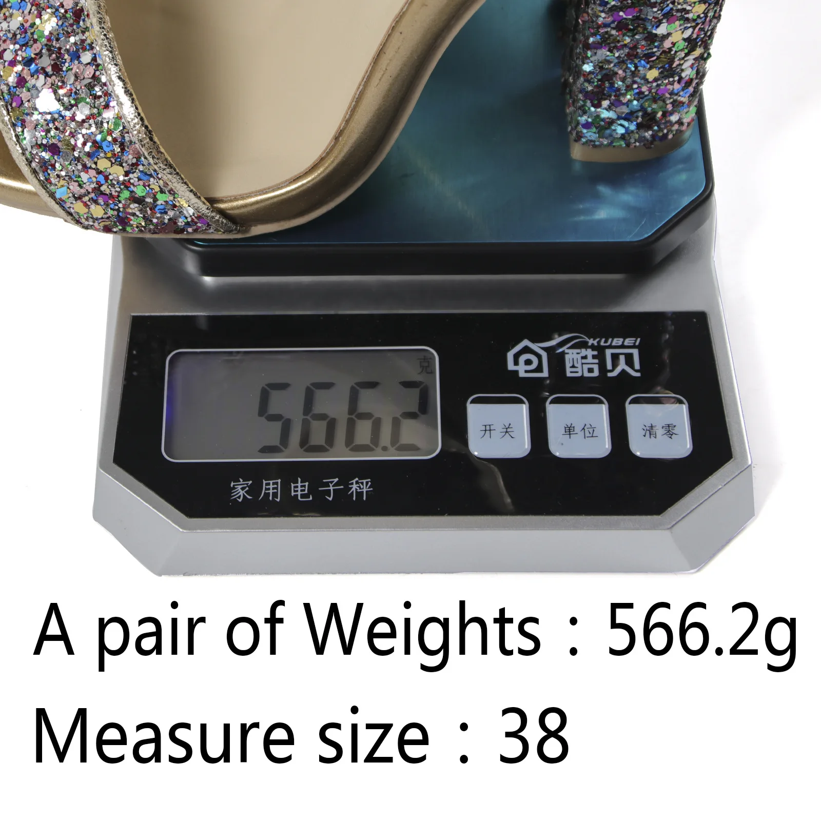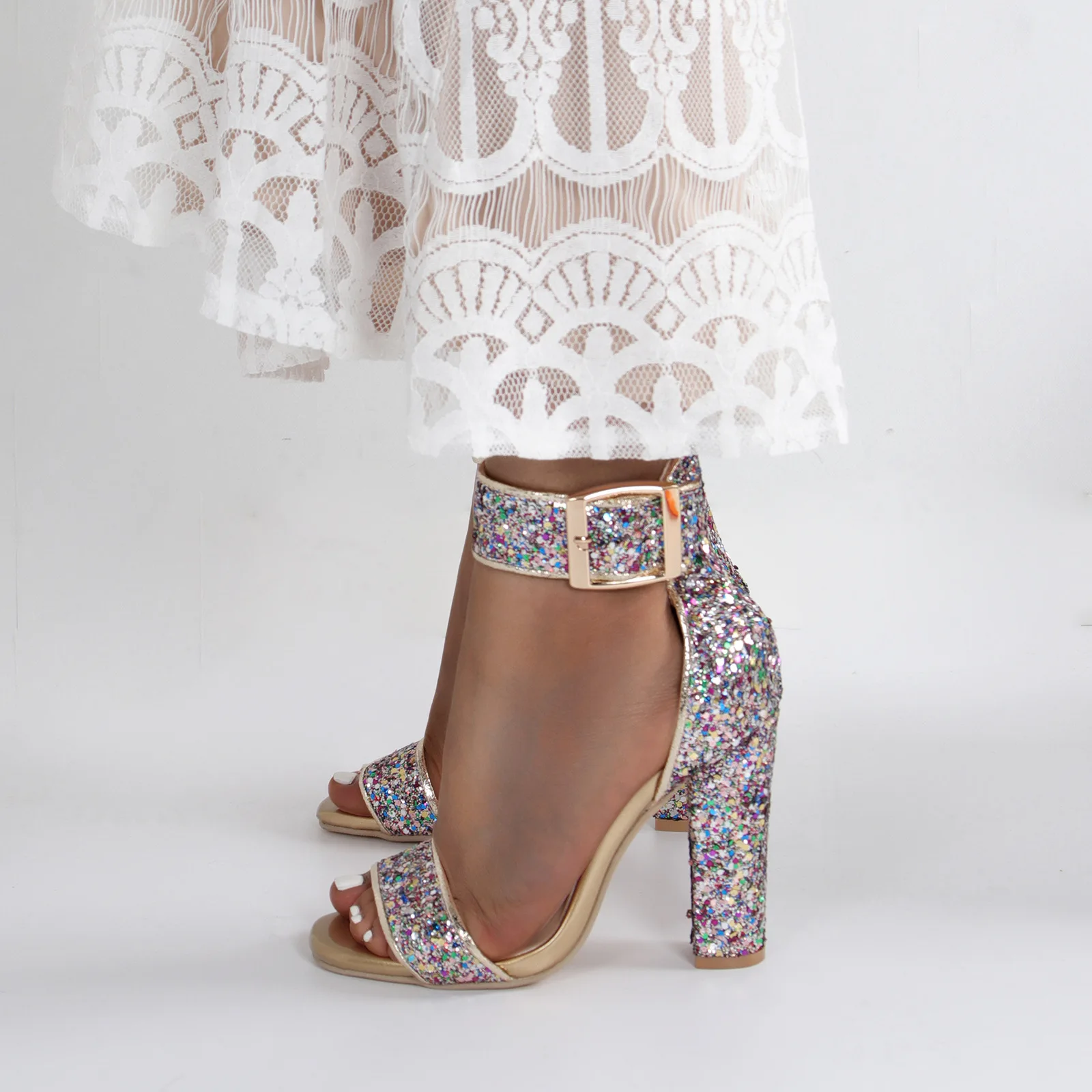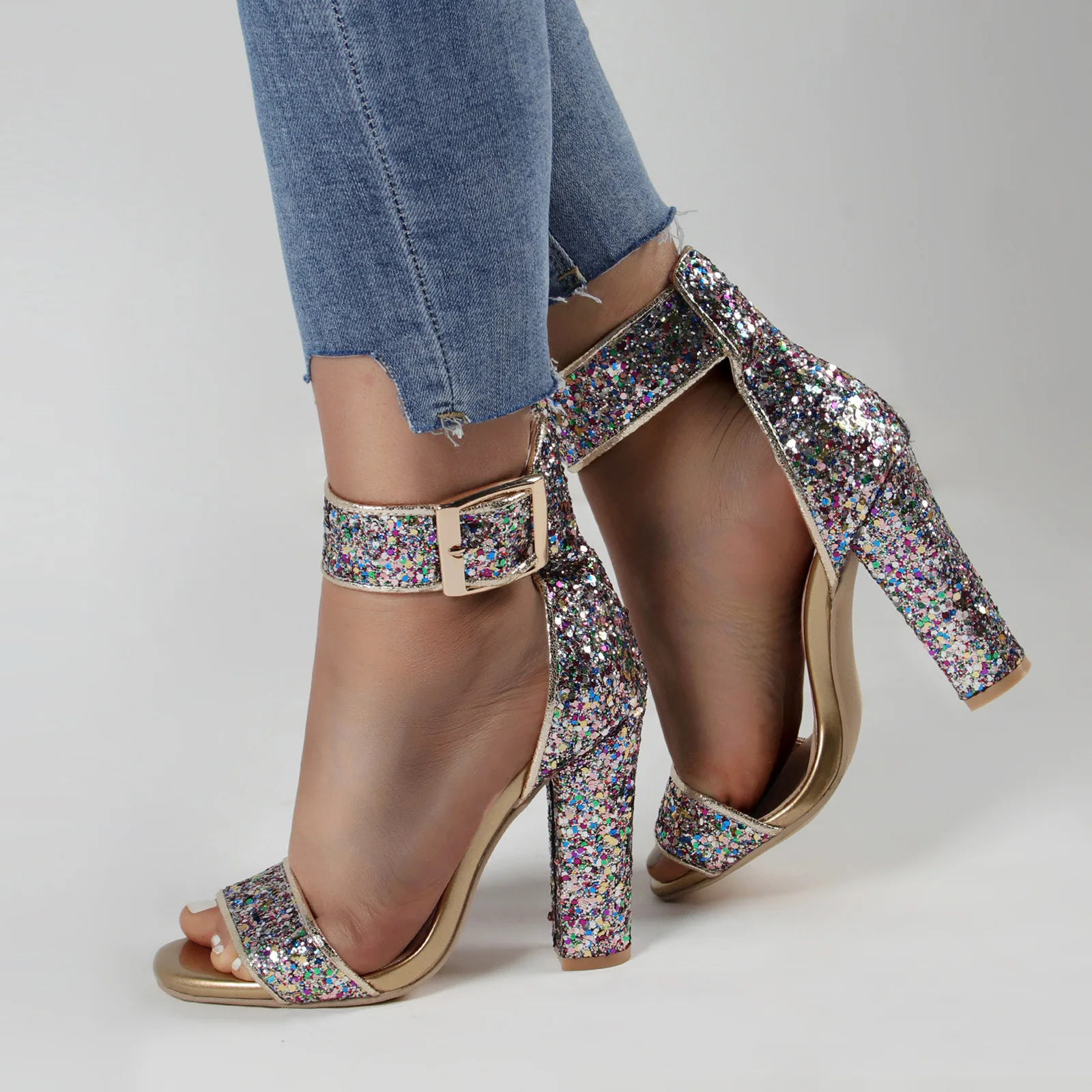 Glitter Thick Heels Women Sandals Fashion 2021 Summer Silver Bling Ankle Buckle Pumps Ladies Open Toe Platform Dress Party Shoes