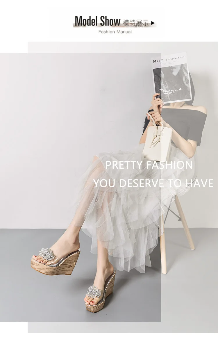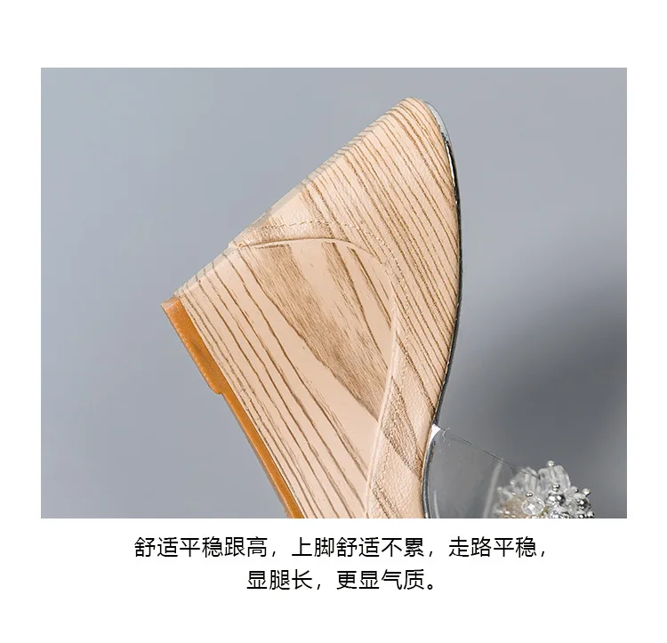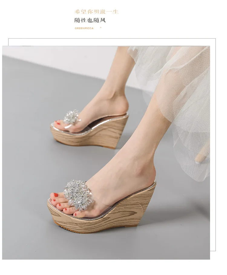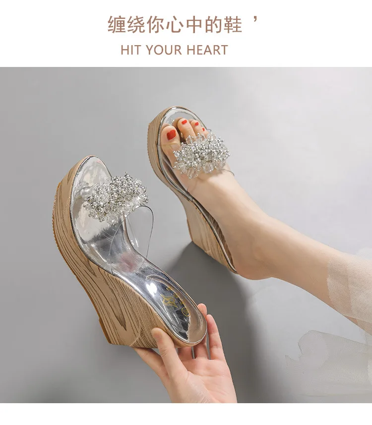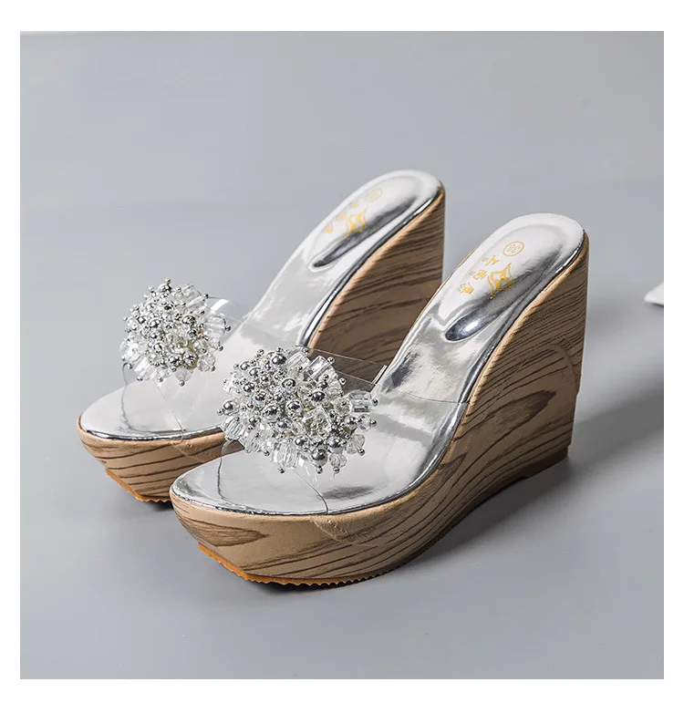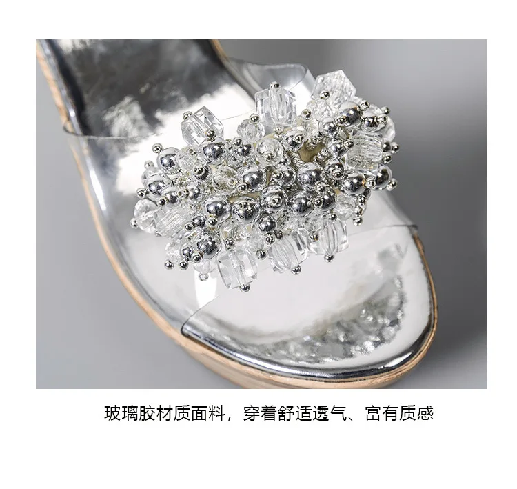 Gold/Silver clear shoes ladies wood wedges slippers muffins crystal bead sandales flower transparent band women platform sandals