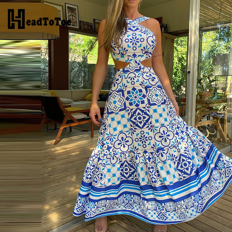 Halter Ethnic Print Sexy Cutout Maxi Dress Women Sleeveless Casual Weekend Vacation Halter Summer Dress