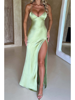 High Slit V Neck Tied Strap Prom Satin Slip Maxi Dresses for Women Summer Elegant Party Dresses Slim Women’s Green Bodycon Dress