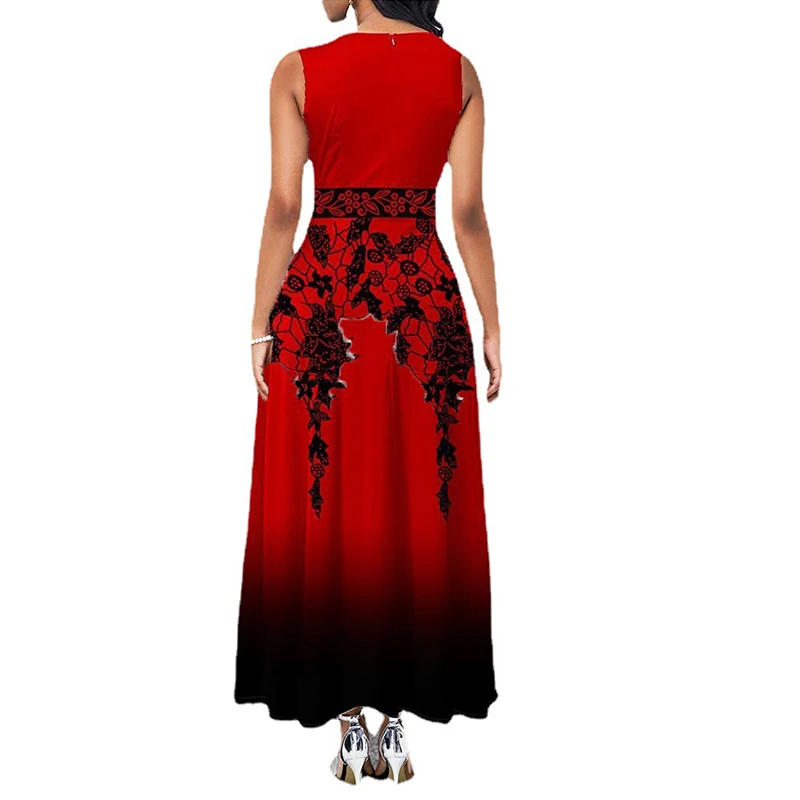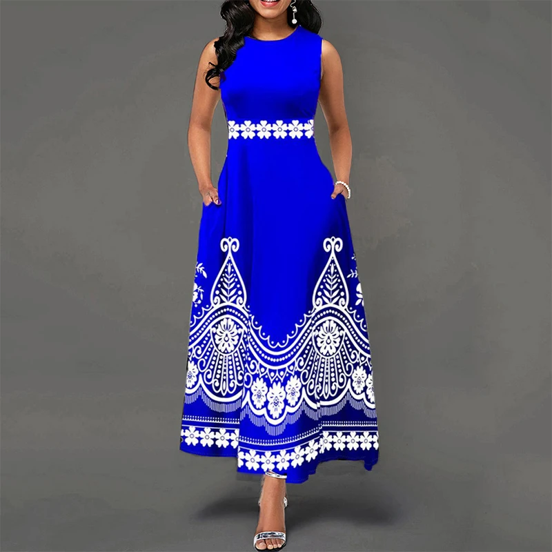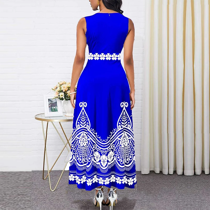High Waist Africa Dress for Women 2021 Sleeveless O-Neck Elegant Ankle-Length Party Printed Sweet Robe Female Casual Maxi Dress