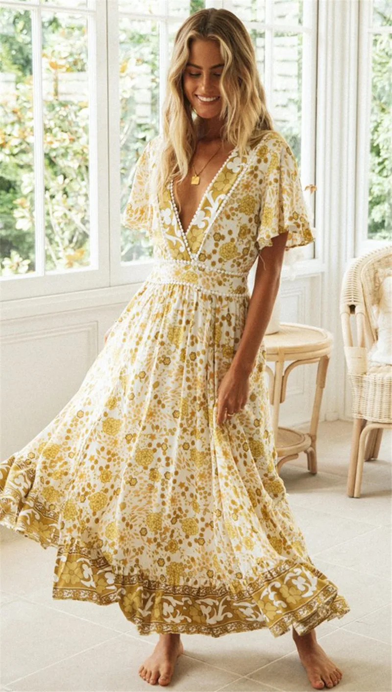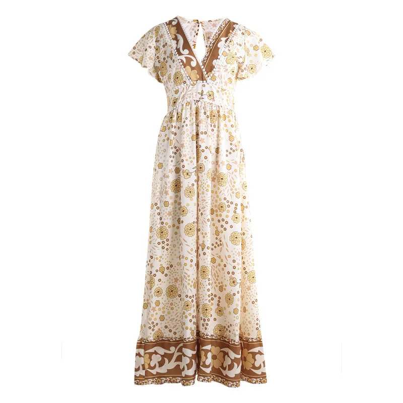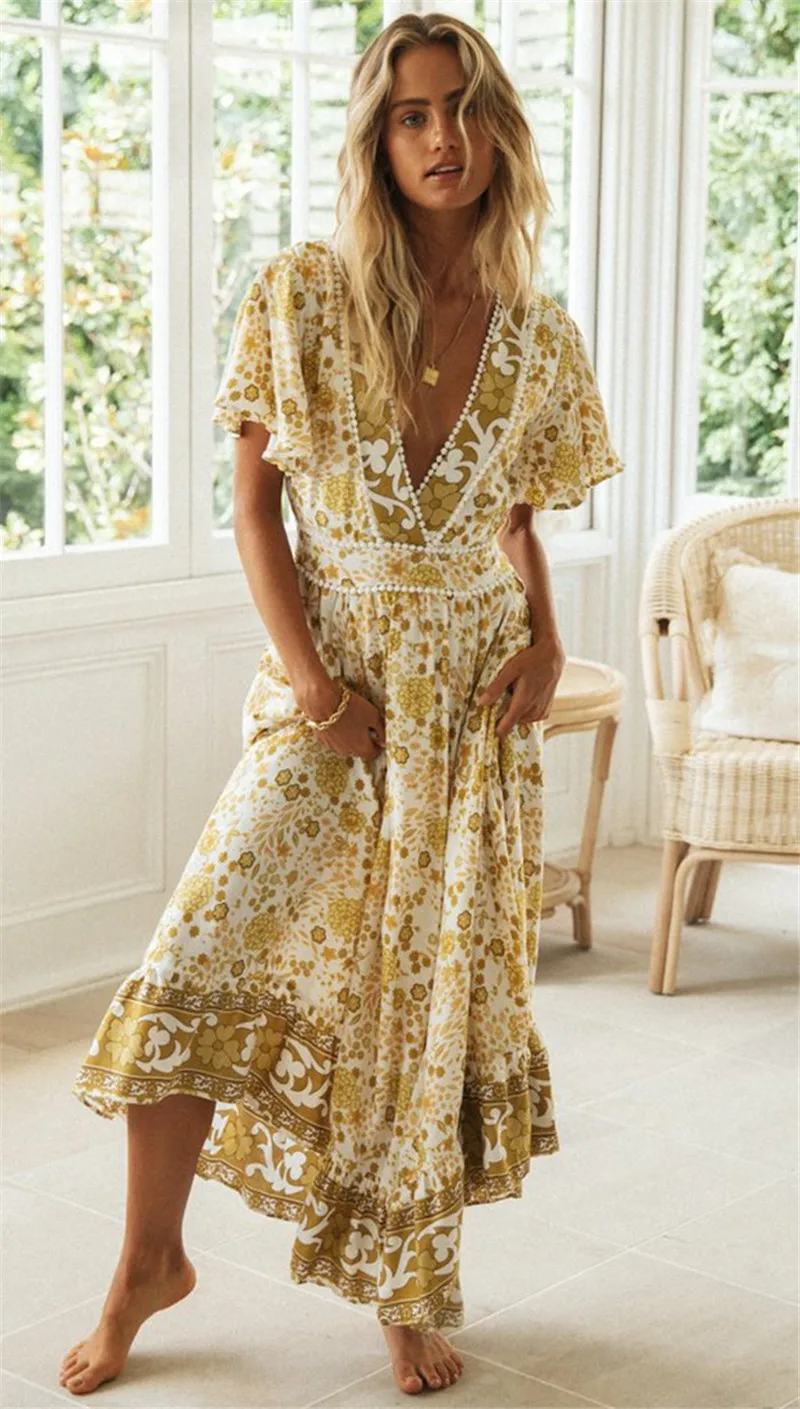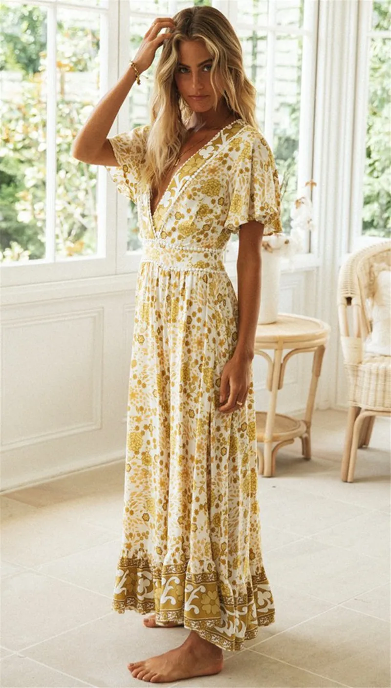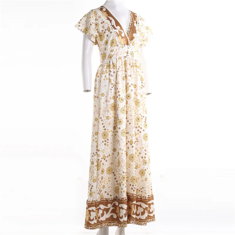 hirigin Dresses Woman Summer Undefined Sexy Beach Holiday Boho Long Dress Print Short Sleeve Deep-V Maix Dress Robe Vestidos