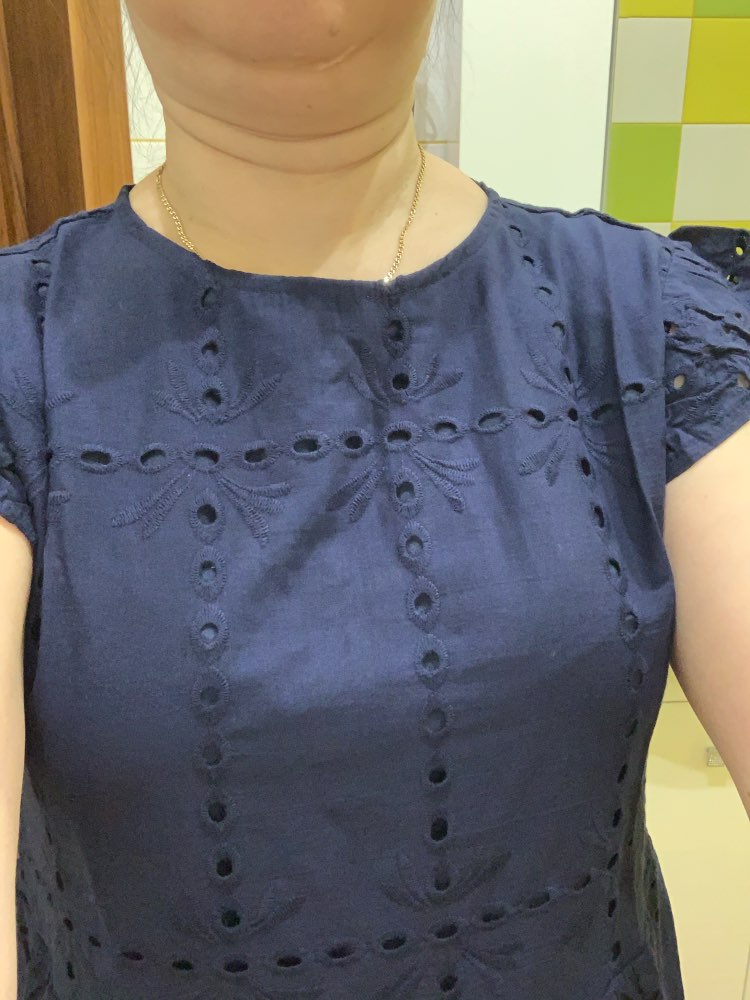 The dress is excellent, on the chest Cup C, if the chest is larger, it will be not enough. On the height of 162 knee-length, suitable for the size of the dew. 44-46. Dress pure cotton, synthetic lining. For the summer is an excellent dress!!!