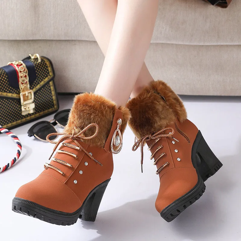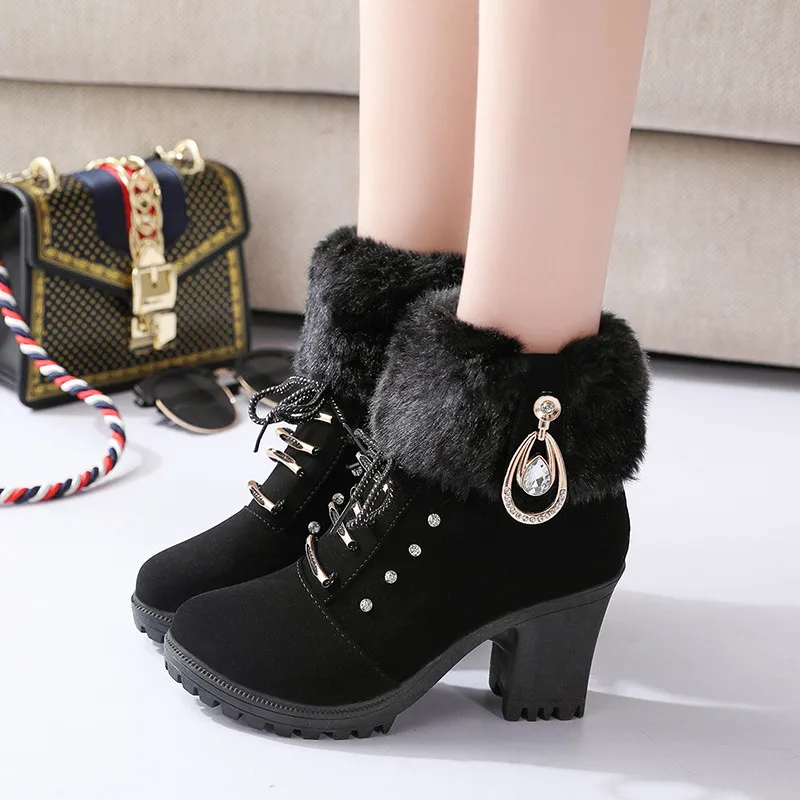 Hot Autumn Women's Ankle Boots Female High Heels Shoes Flock Fashion Zipper Chunky Heels Short Botas for Ladies Casual Footwear