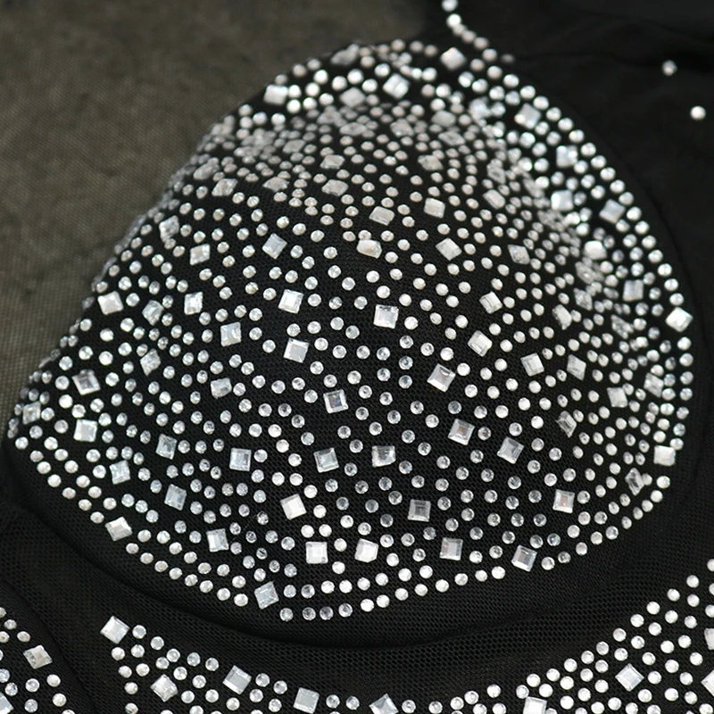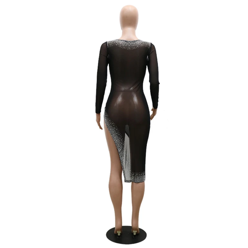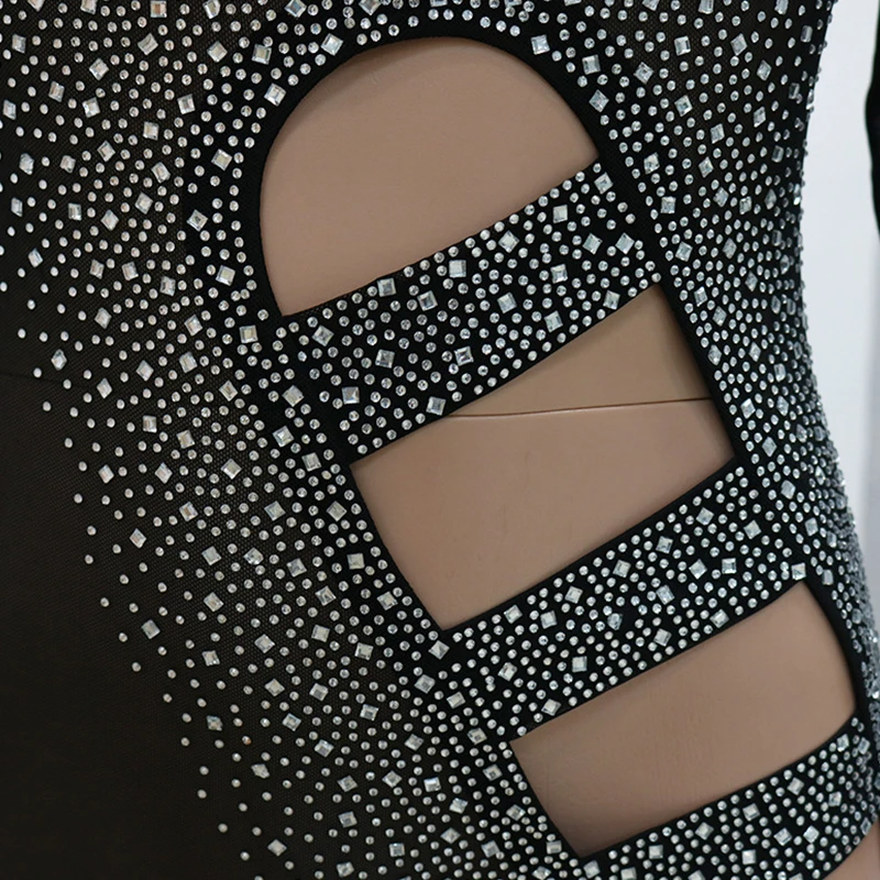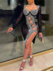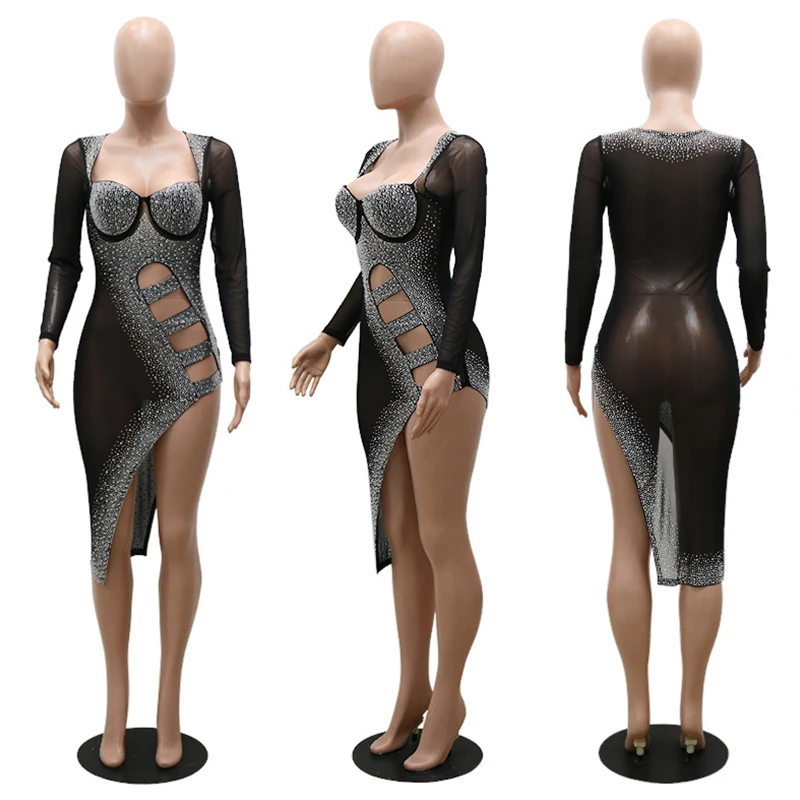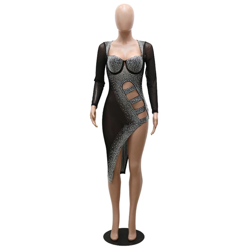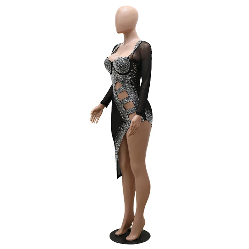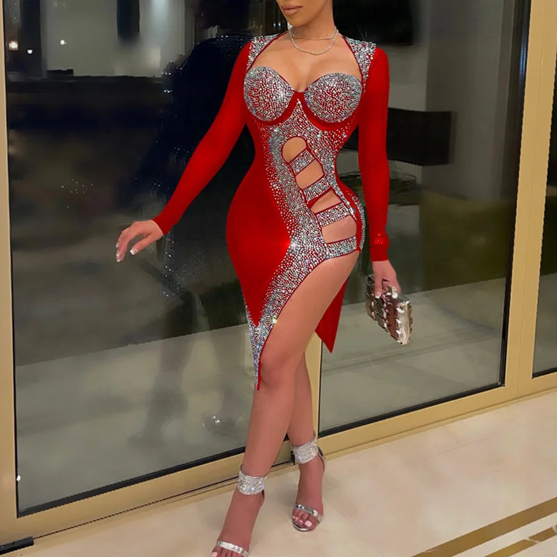 Hot Stamping Diamonds Hallow Out Slit Bodycon Party Dress Women Long Sleeve Irregular Club Dress