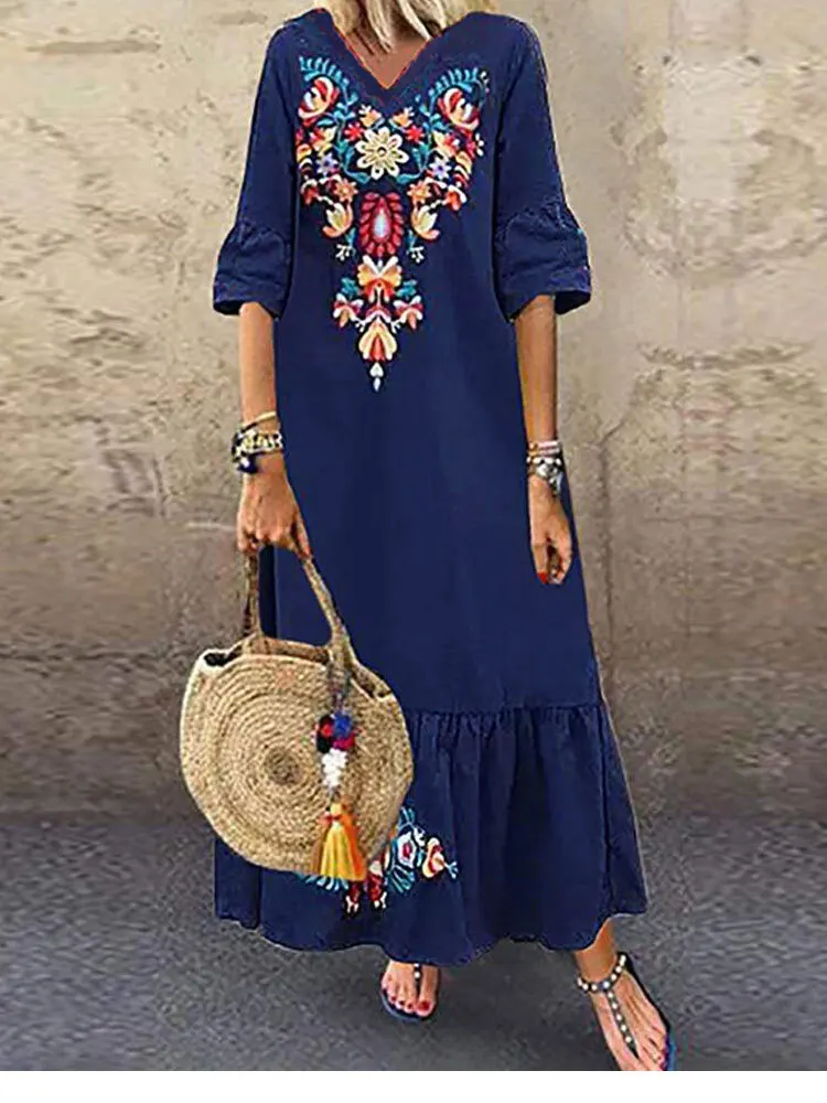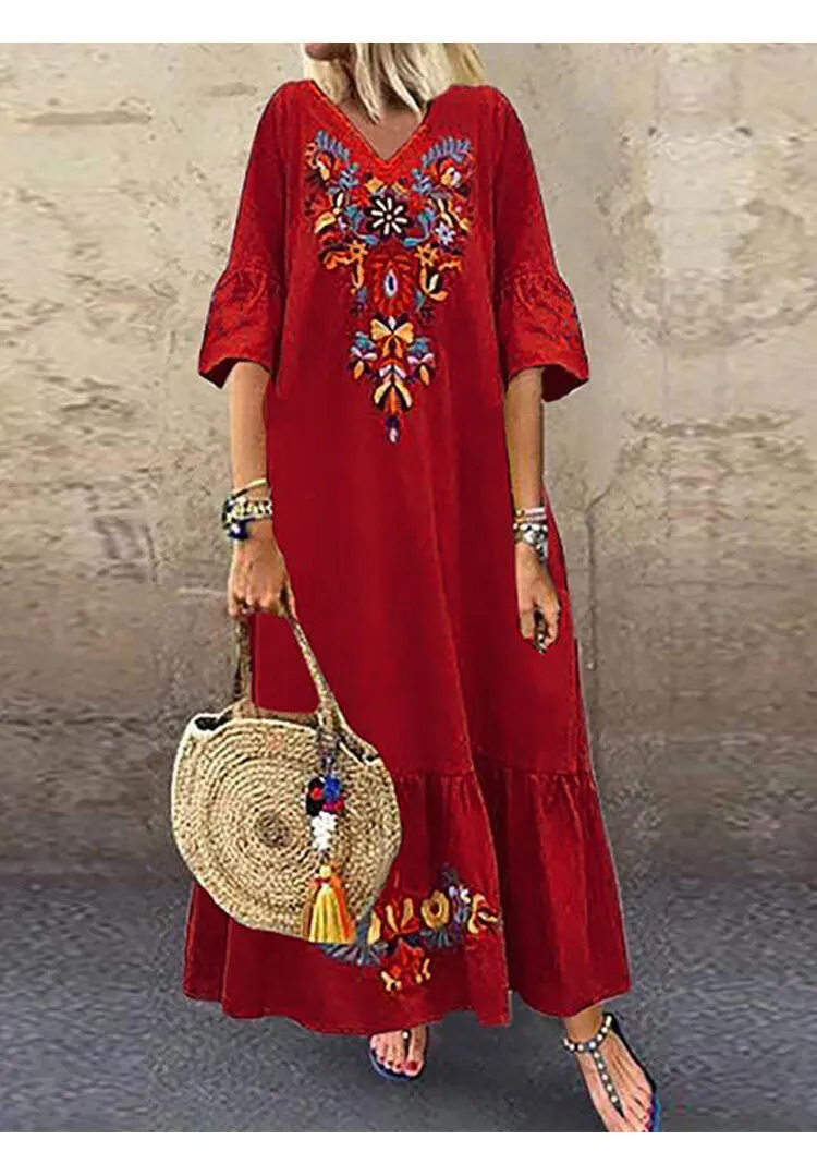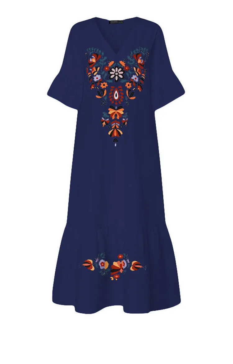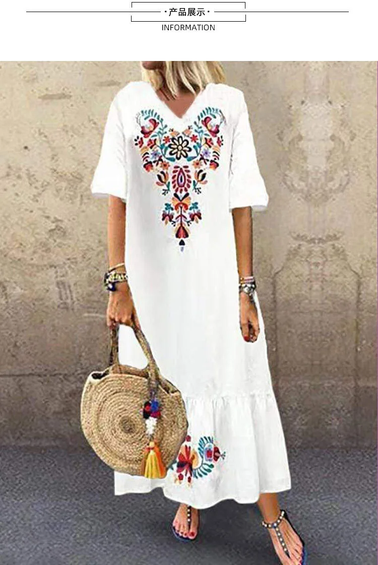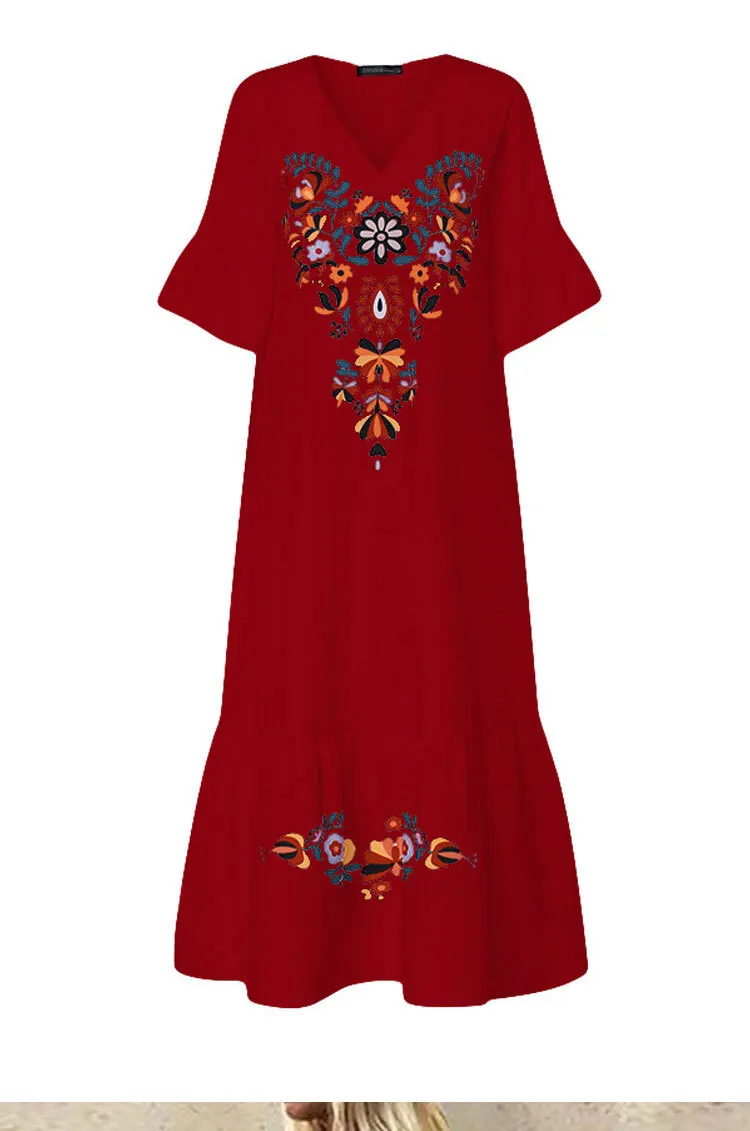Hot Style Comfortable Cotton And Linen Retro Print Short Sleeve Sleeve Long Dress Ladies Maxi Dress Supersize