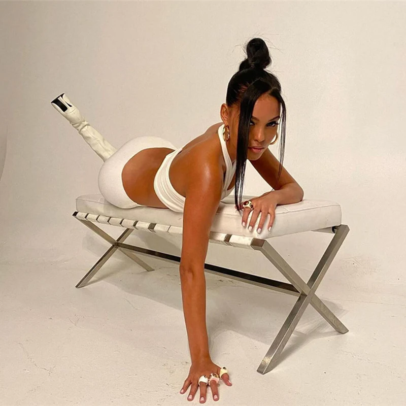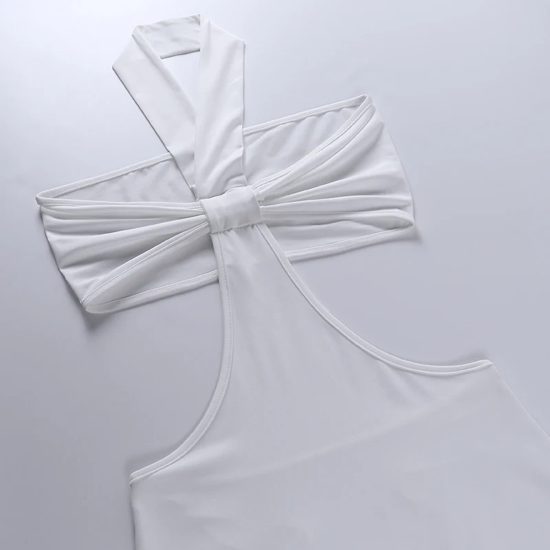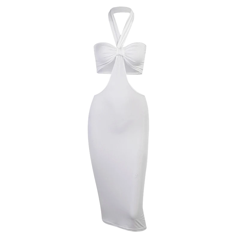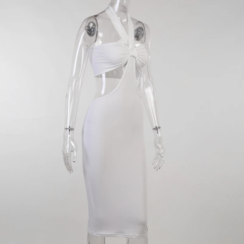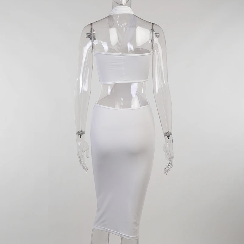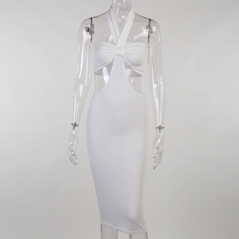 InstaHot Cut Out Waist Sexy Dress Party Halter Neck White Pencil Mid Calf Length Casual Office Lady Dress 2021 Summer Bodycon