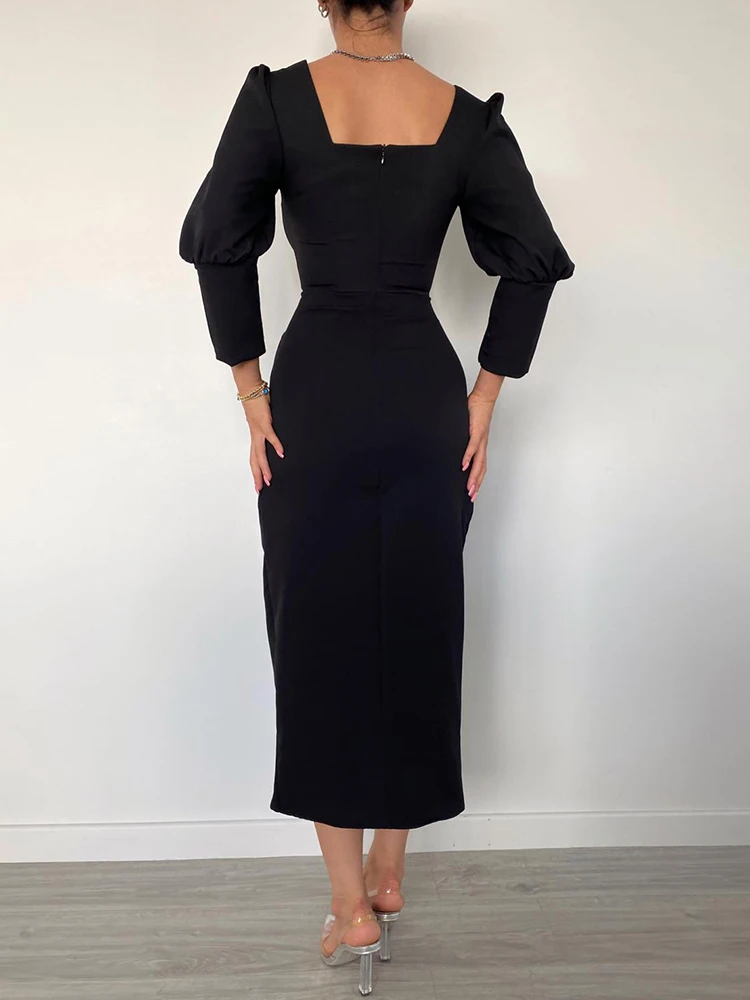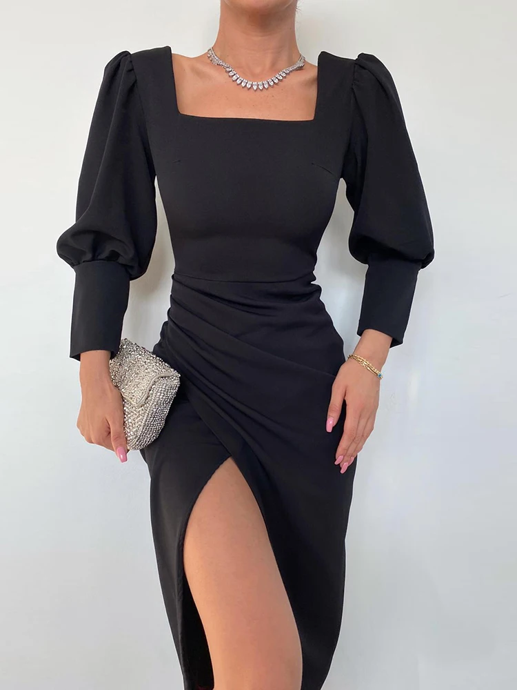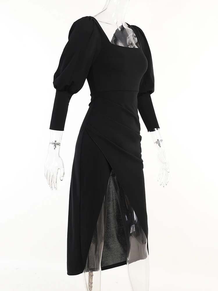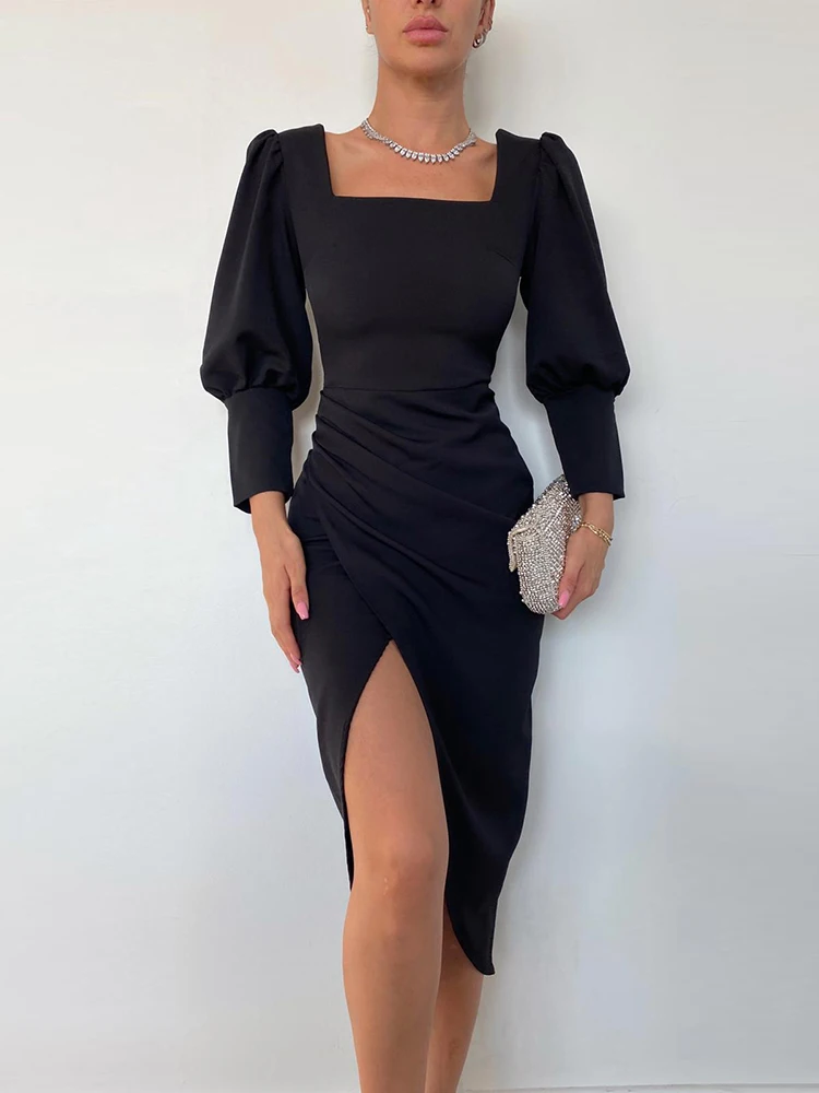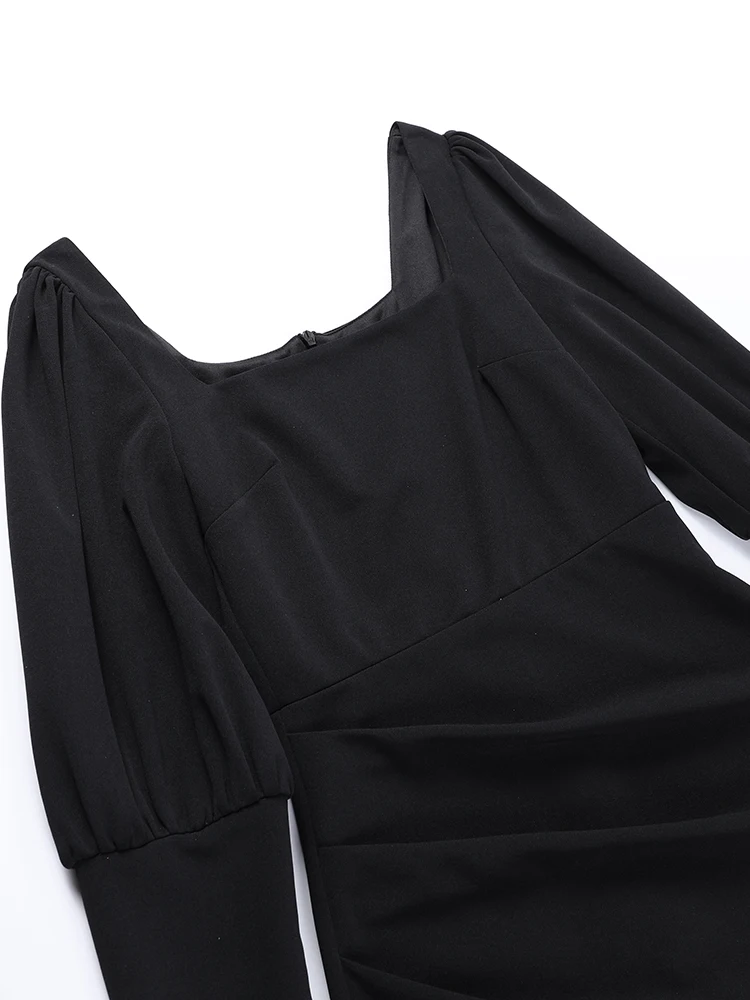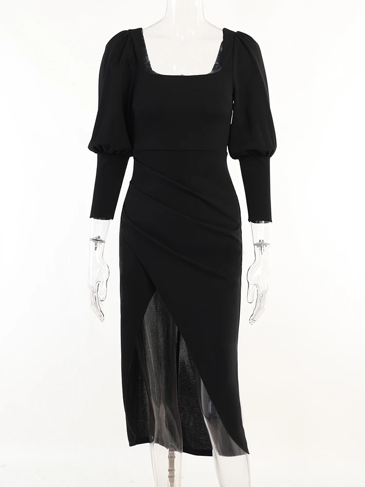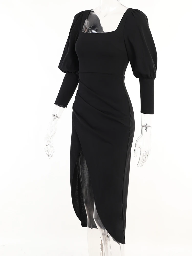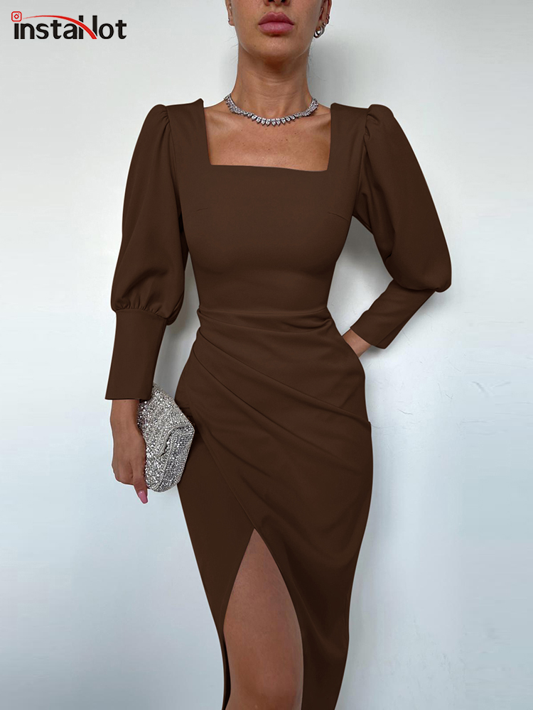 InstaHot Lantern Sleeve Folds Midi Dress Women Sexy Elegant Y2K Club Party Evening Gala Dress Square Collar Slim Bodycon Autumn