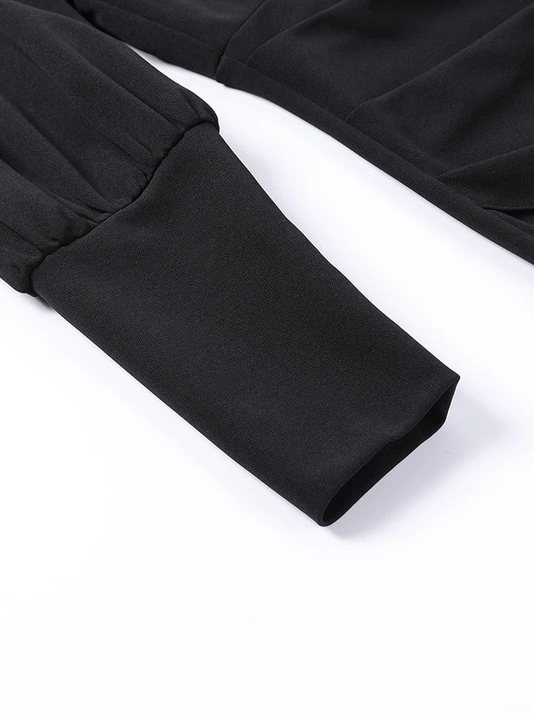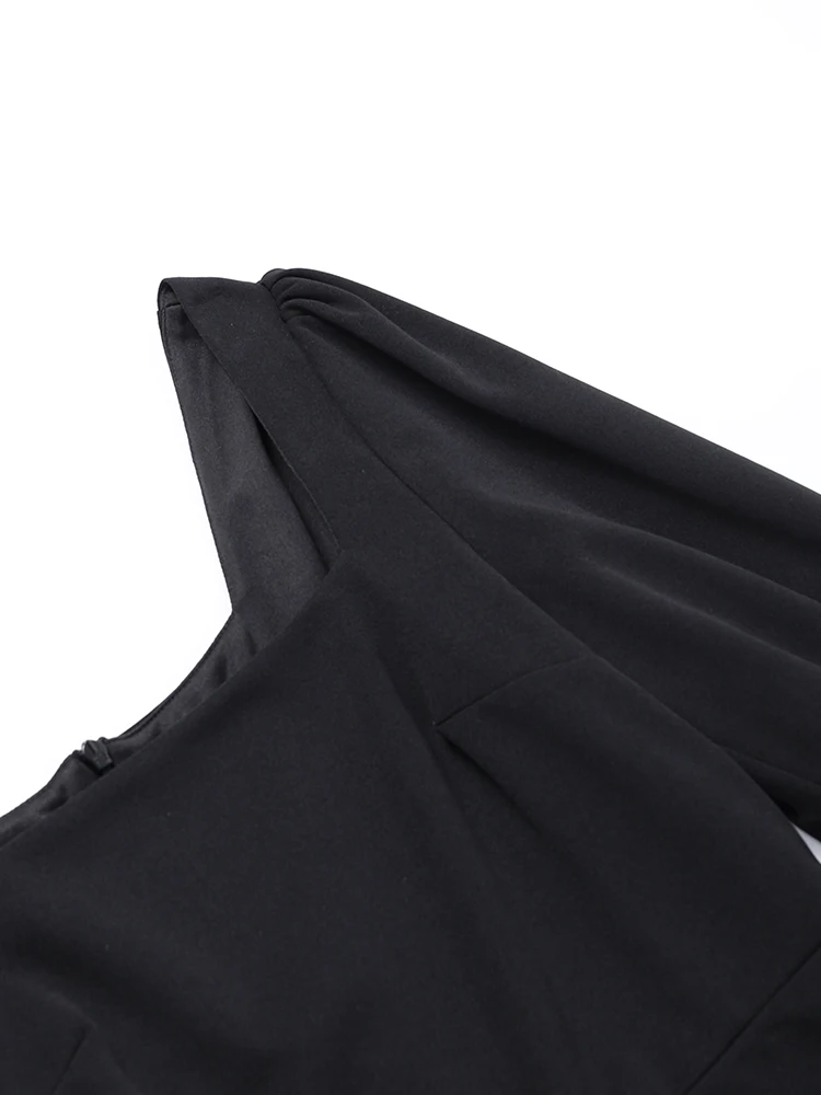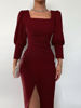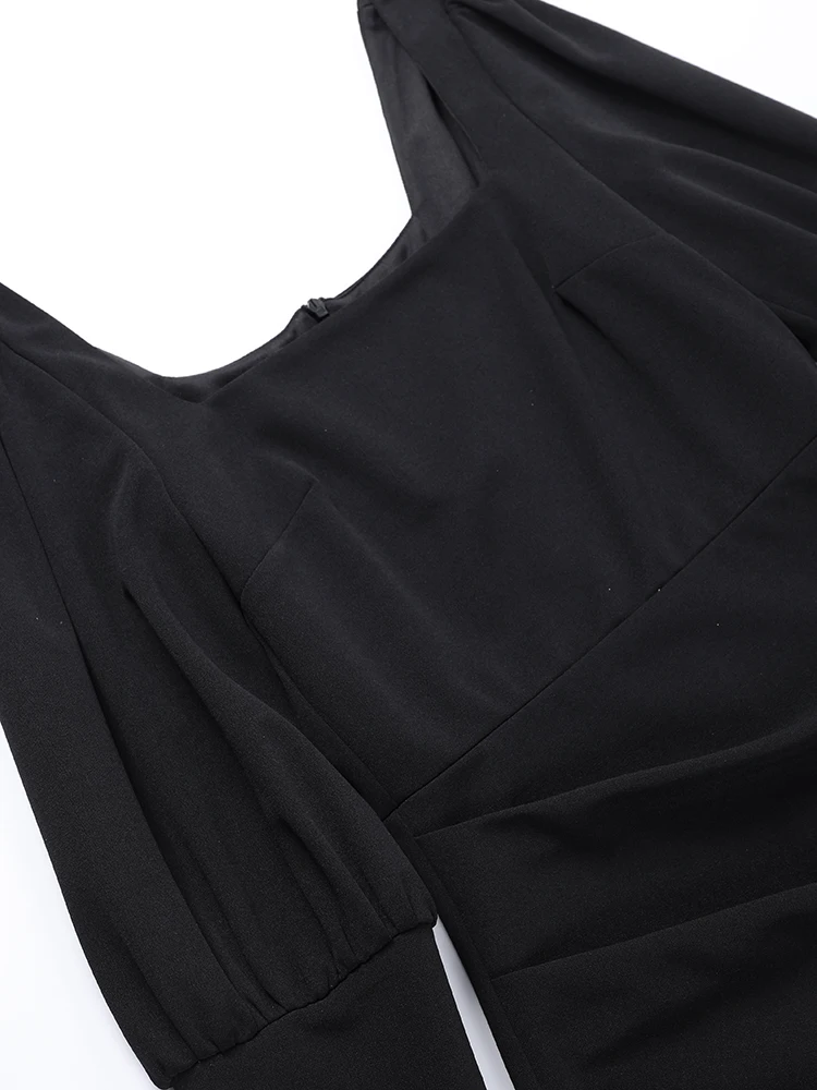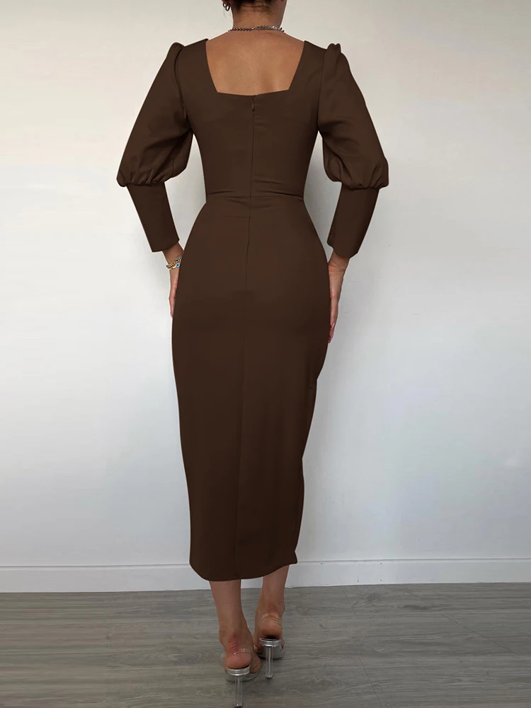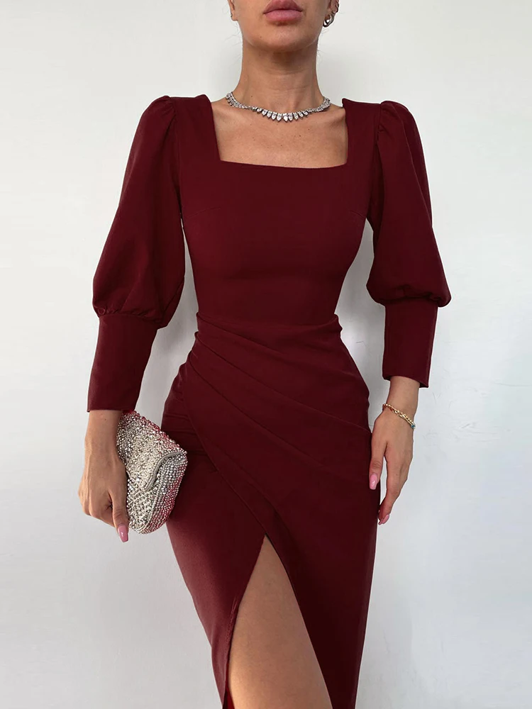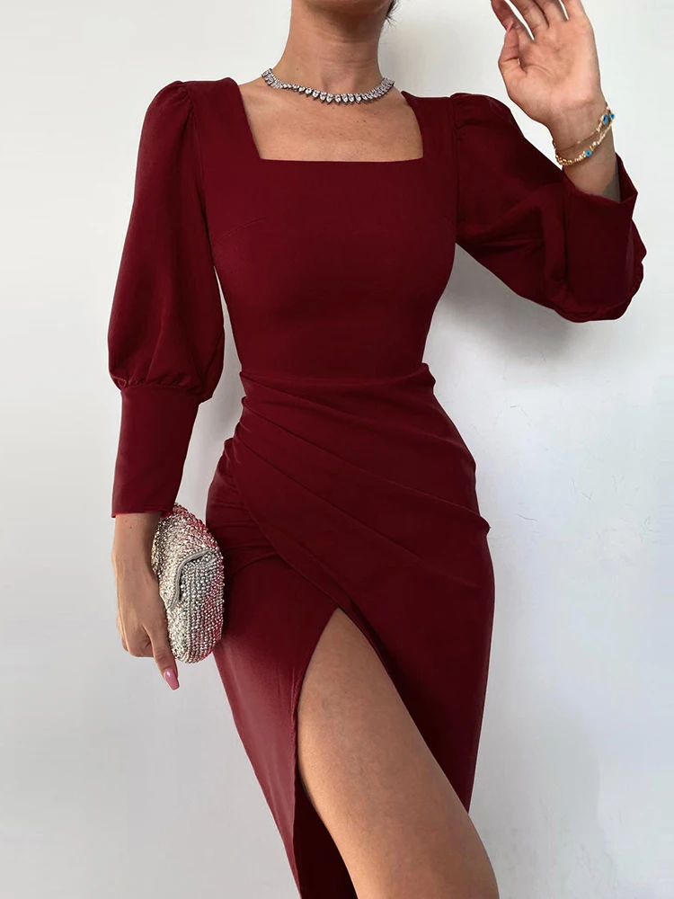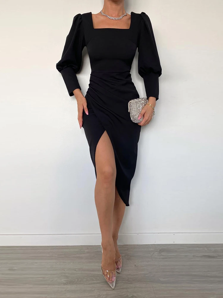 InstaHot Lantern Sleeve Folds Midi Dress Women Sexy Elegant Y2K Club Party Evening Gala Dress Square Collar Slim Bodycon Autumn