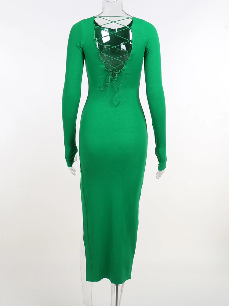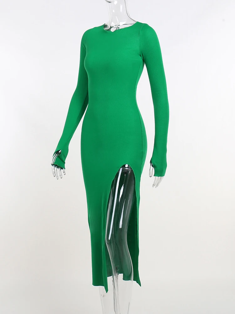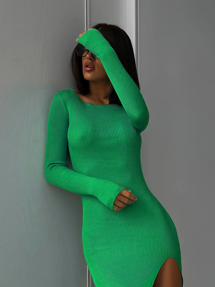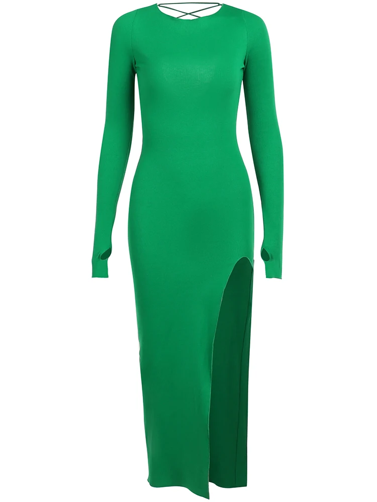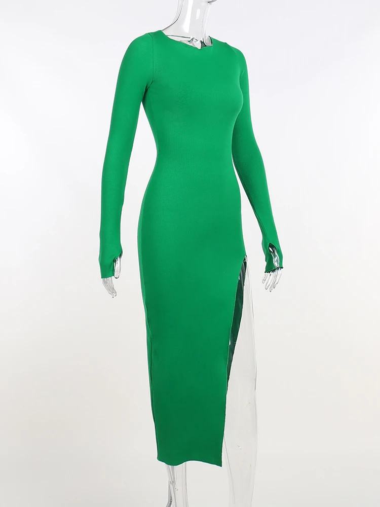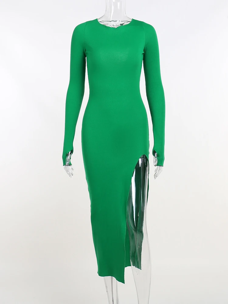 InstaHot Long Sleeve Party Solid Dresses Women Knitted Back Cut Out Bandage Bodycon O Neck Skinny Midi Dresses Split Hem Autumn
