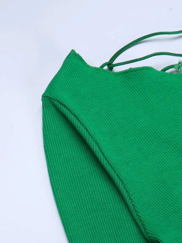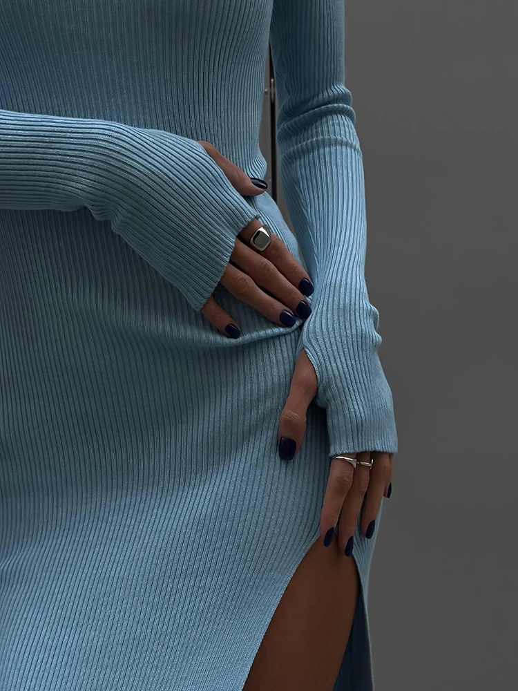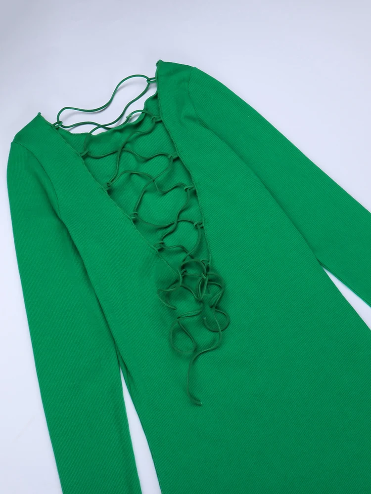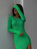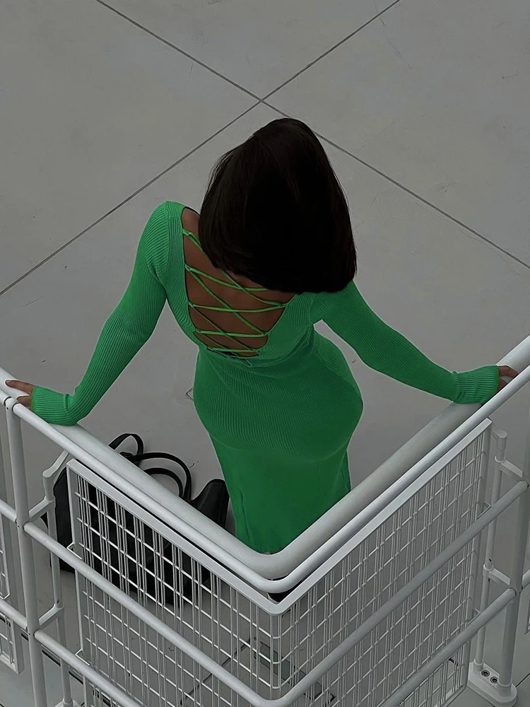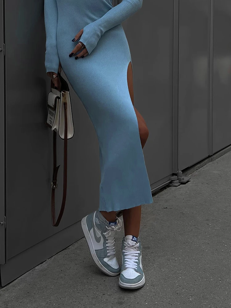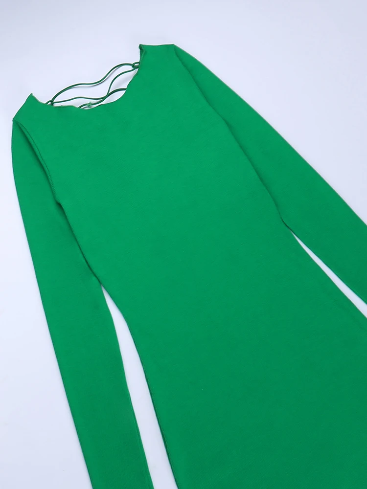 InstaHot Long Sleeve Party Solid Dresses Women Knitted Back Cut Out Bandage Bodycon O Neck Skinny Midi Dresses Split Hem Autumn