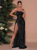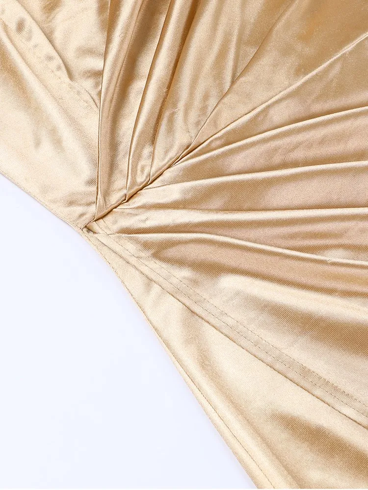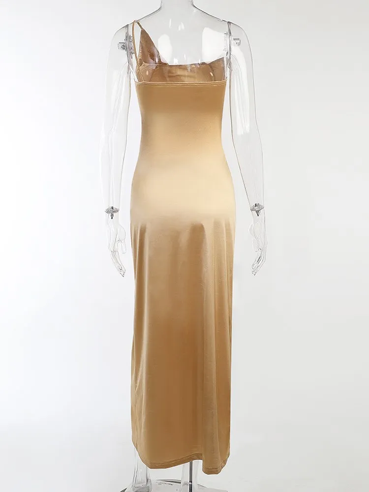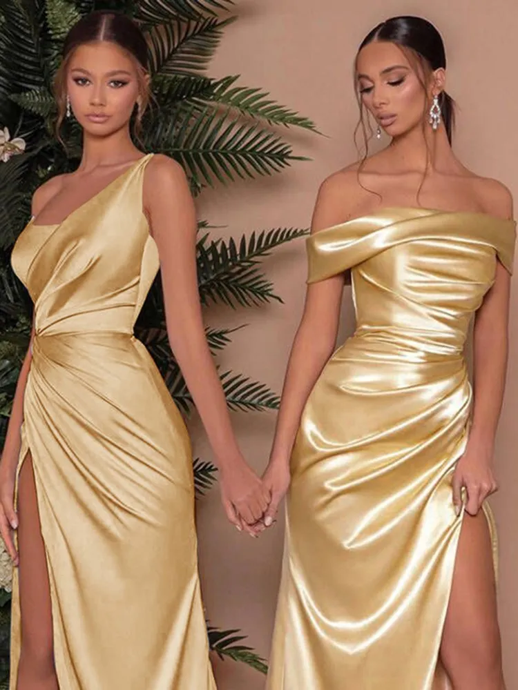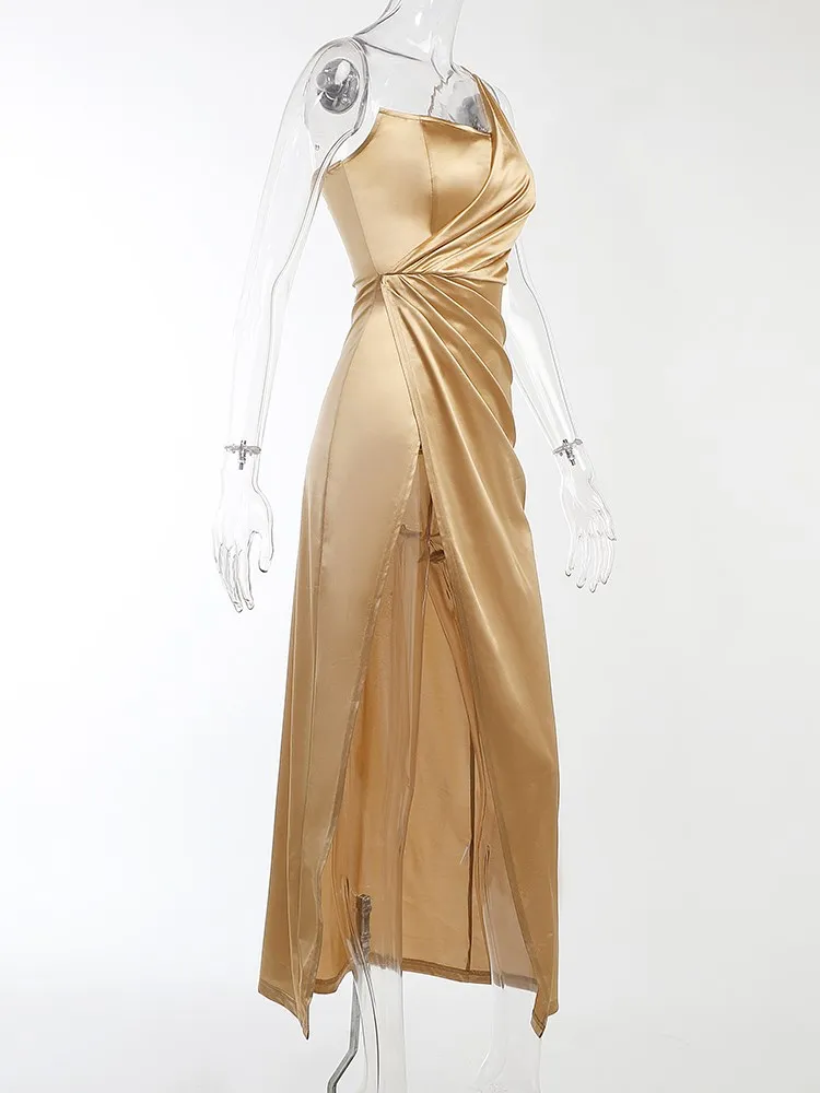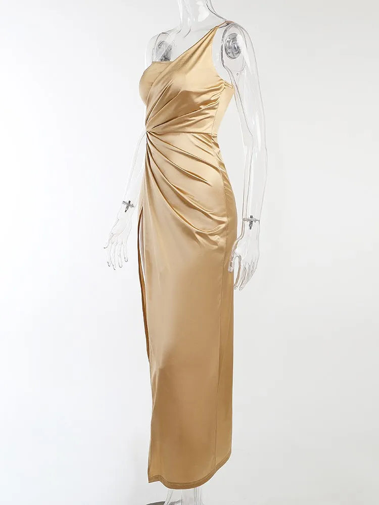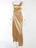 InstaHot Satin Women Cami Long Dress One Shoulder Folds Sleeveless Slit Summer Sexy Elegant Party Club Prom Wedding Clothing New