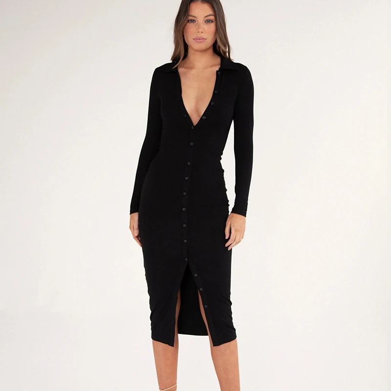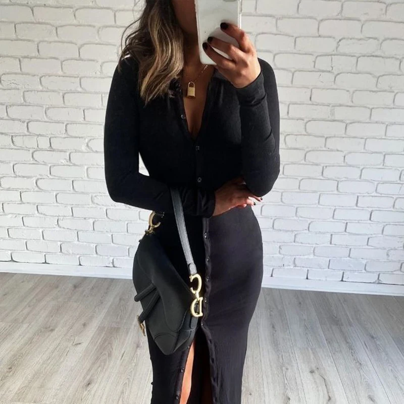 InstaHot Sexy Women Dress Autumn Solid Knitted Button V Neck Bodycon Long Sleeve Slim Knee Length Midi Dress 2020 Elegant Party