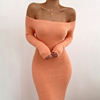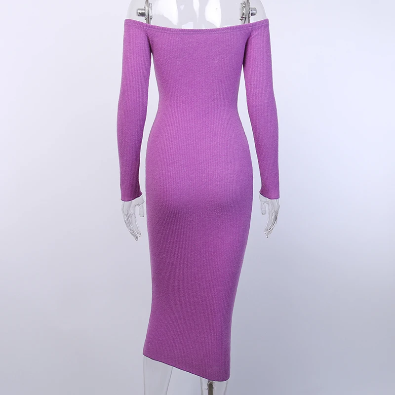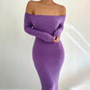 InstaHot Solid Off the Shoulder Sexy Pencil Maxi Dress Angle Length Vintage Knitted Skinny Slim Long Sleeve Sexy Women Dress