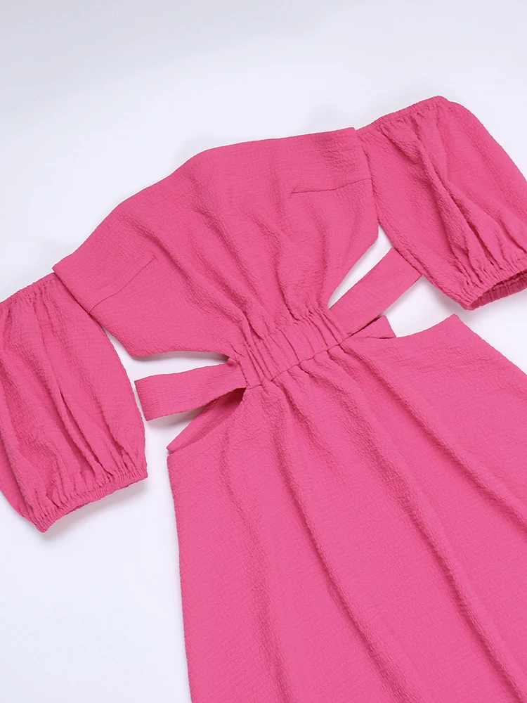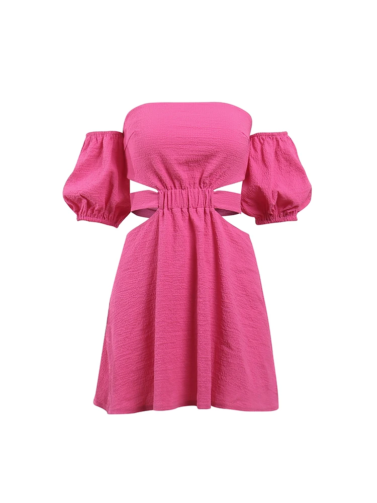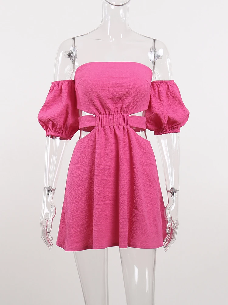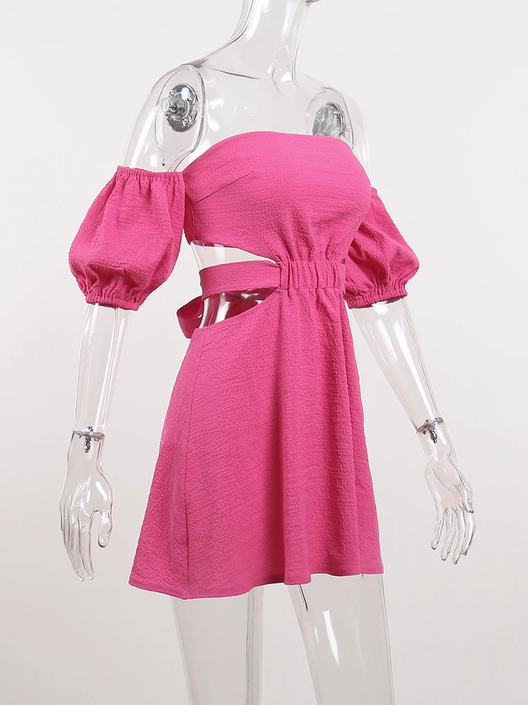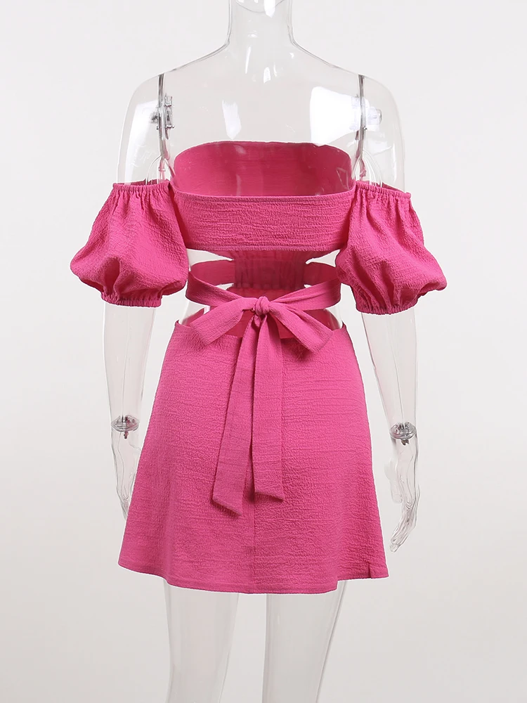 InstaHot Women Off The Shoulder Mini Dress Puff Sleeve Hollow Out Summer Lace Up Bodycon Sexy Elegant Party Night Chic Clothes